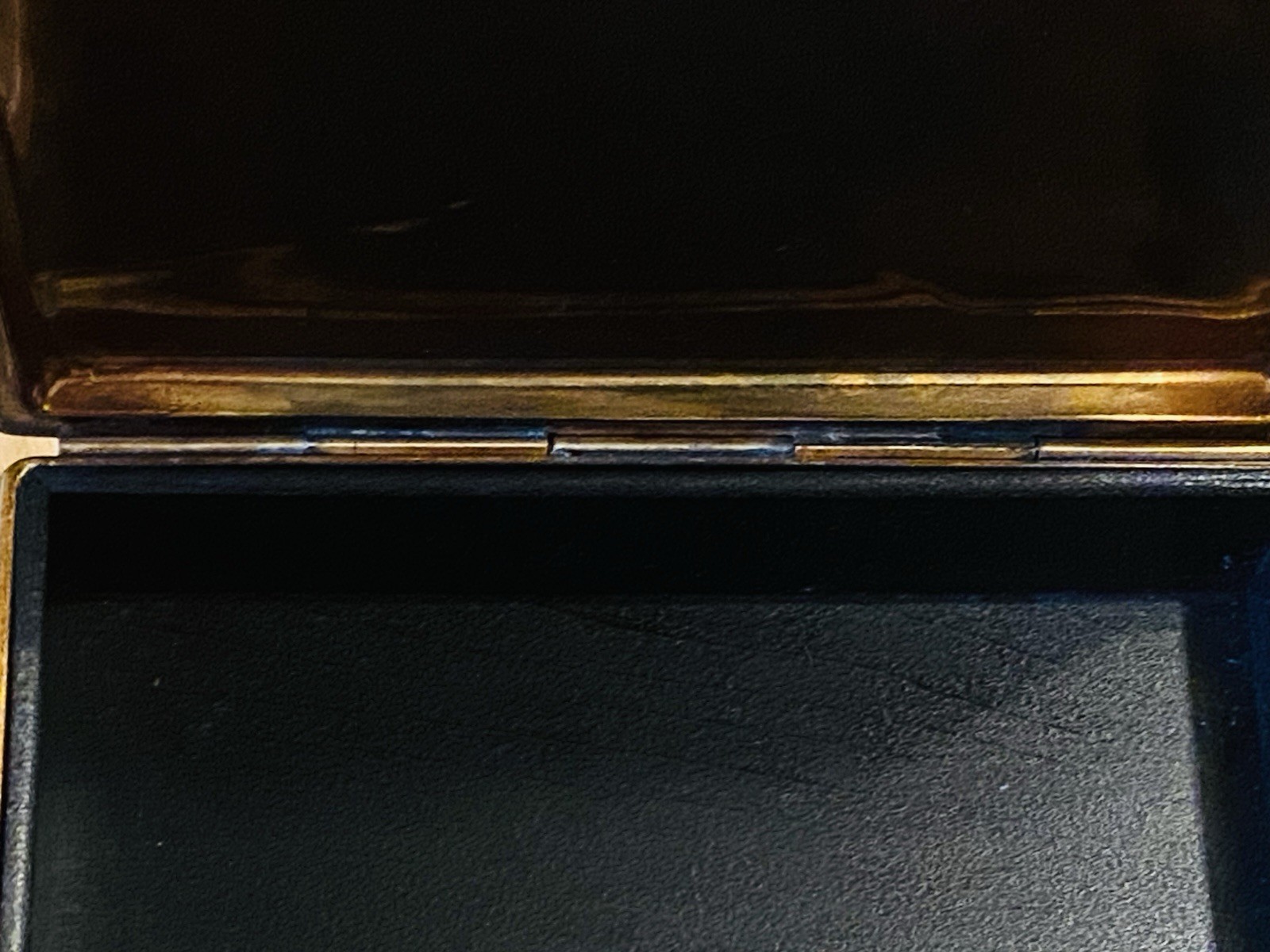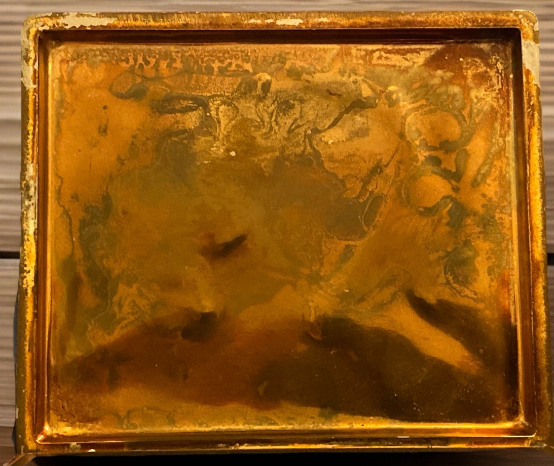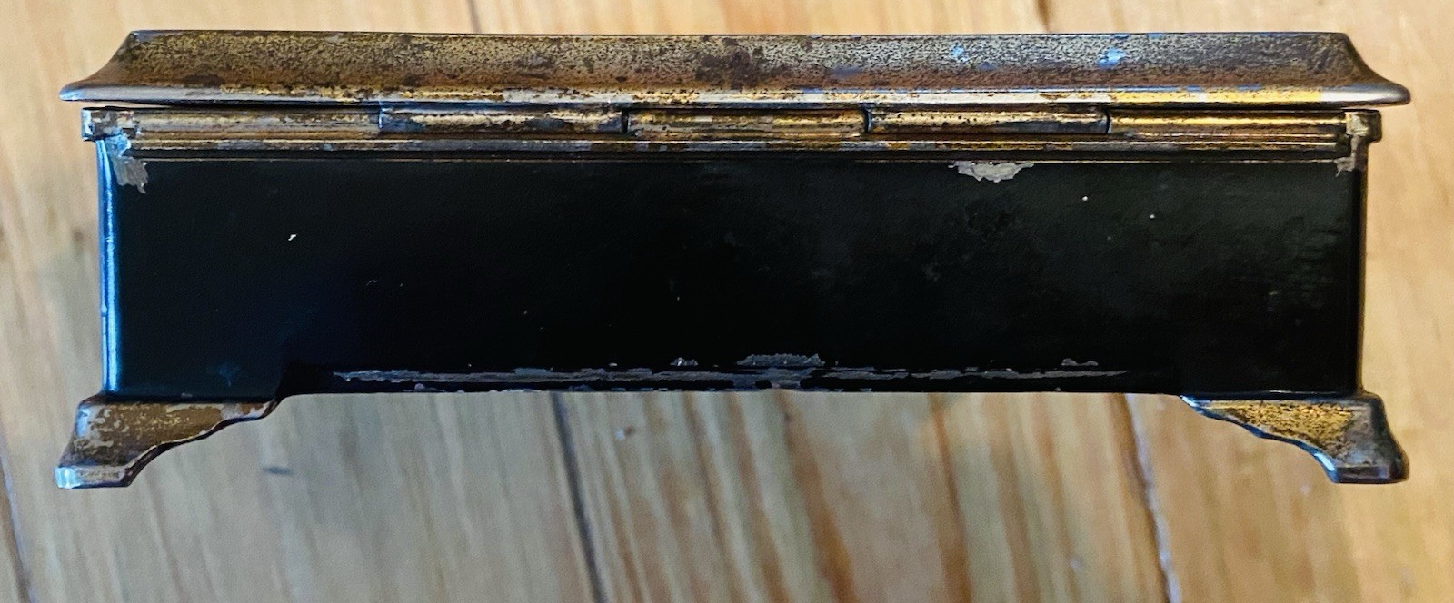 Vintage Yamatogumi Korea 38th Parallel Metal Box Hinged Footed Made In JapanI am not an expert on metals or vintage boxes so I can't confidently identify what this box is made from, but Yamatogumi was known for its silver plate. Made post 1953. It is very sturdy. Hinges are tight with no squeaking and the feet are firmly affixed. However, it definitely shows its age. Please see photos. Previous owner was the wife of a WWII U.S. Army Lt. Col. If you have any questions, please ask.B2