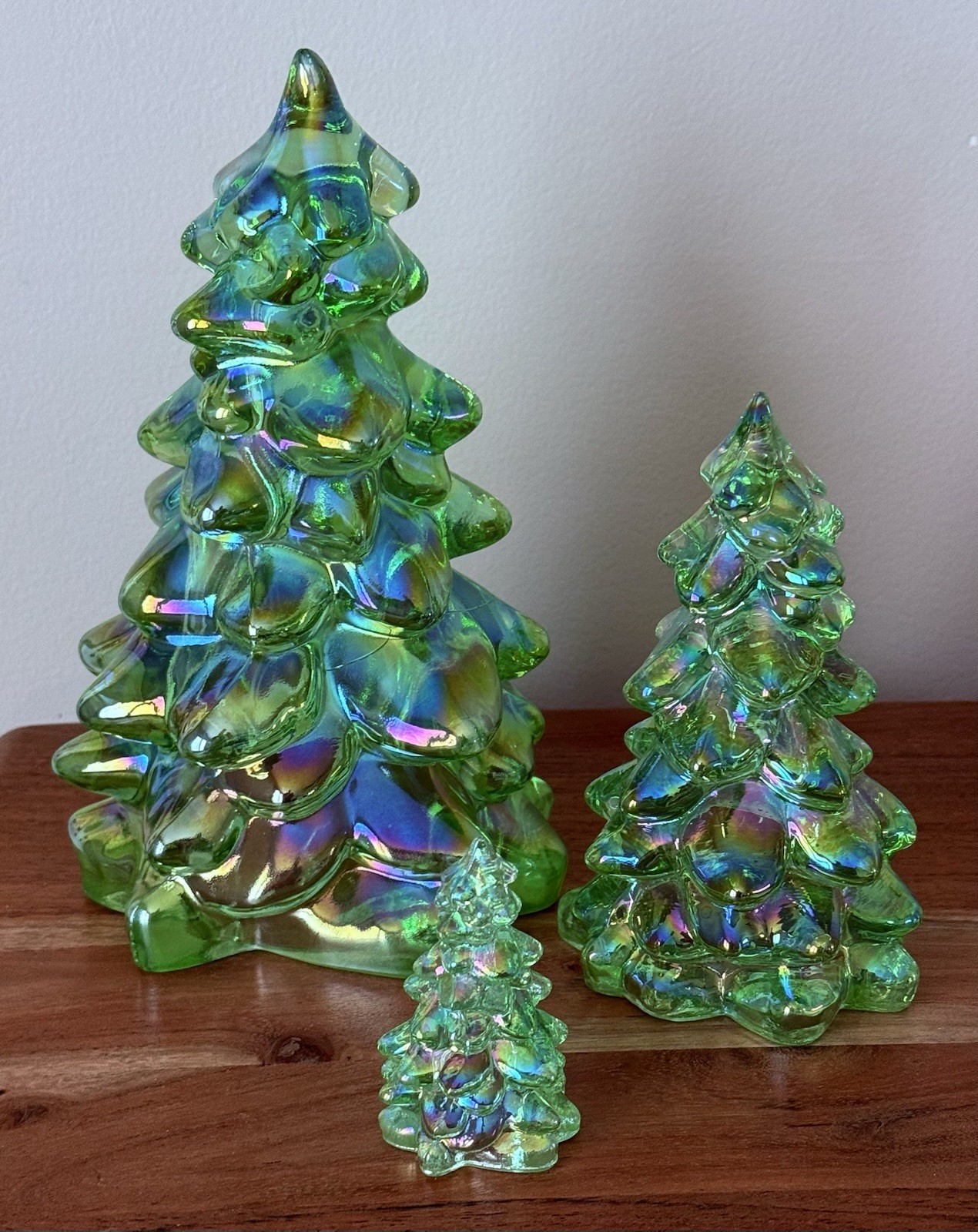 color reference and condition. This includes all 3 sizes (Large 8" tall, Med. 5.5" tall, & Small 2.75" tall) for one price. We have other sets & singles in different colors available in our eBay store - be sure to check out our other items. Thank you! NOTE: I use many colors of my trees all year in different holiday displays - they're not just for Christmas. They add depth & background to many of my shelves & are simply fabulous. In my opinion, if you like to decorate your home, and change things around seasonally - this is the BEST glass purchase anyone can make. These Mosser trees are perfect! Please be aware - glass varies slightly from piece-to-piece. Glass can also have straw marks, mold lines, surface inconsistencies, and even bubbles. We have examined all of our items and they are completely free of any chips or cracks. We will not accept returns or exchanges for common manufacturing "flaws" in the glass. This is part of the nature of glass and is considered normal. These items have passed inspection at Mosser Glass and also from us - so they are very good!