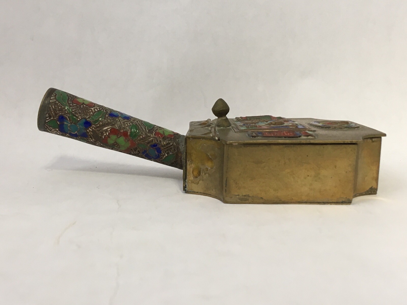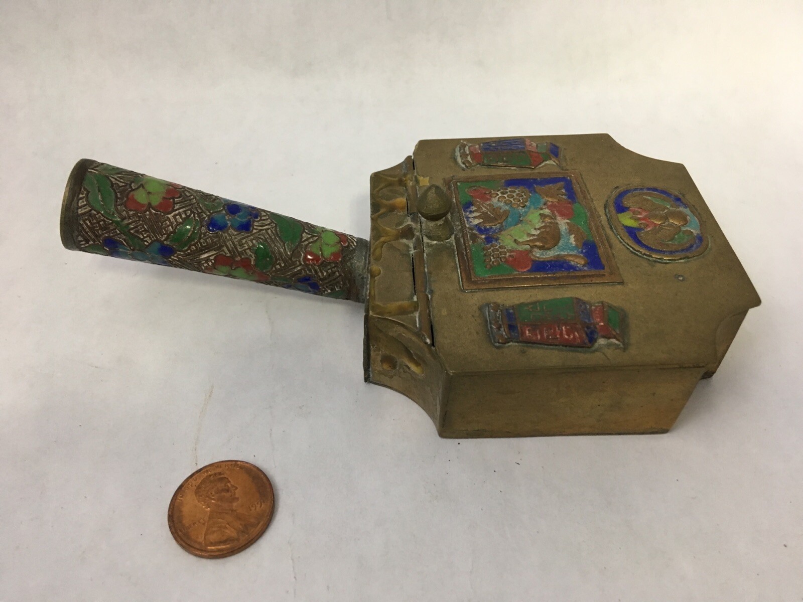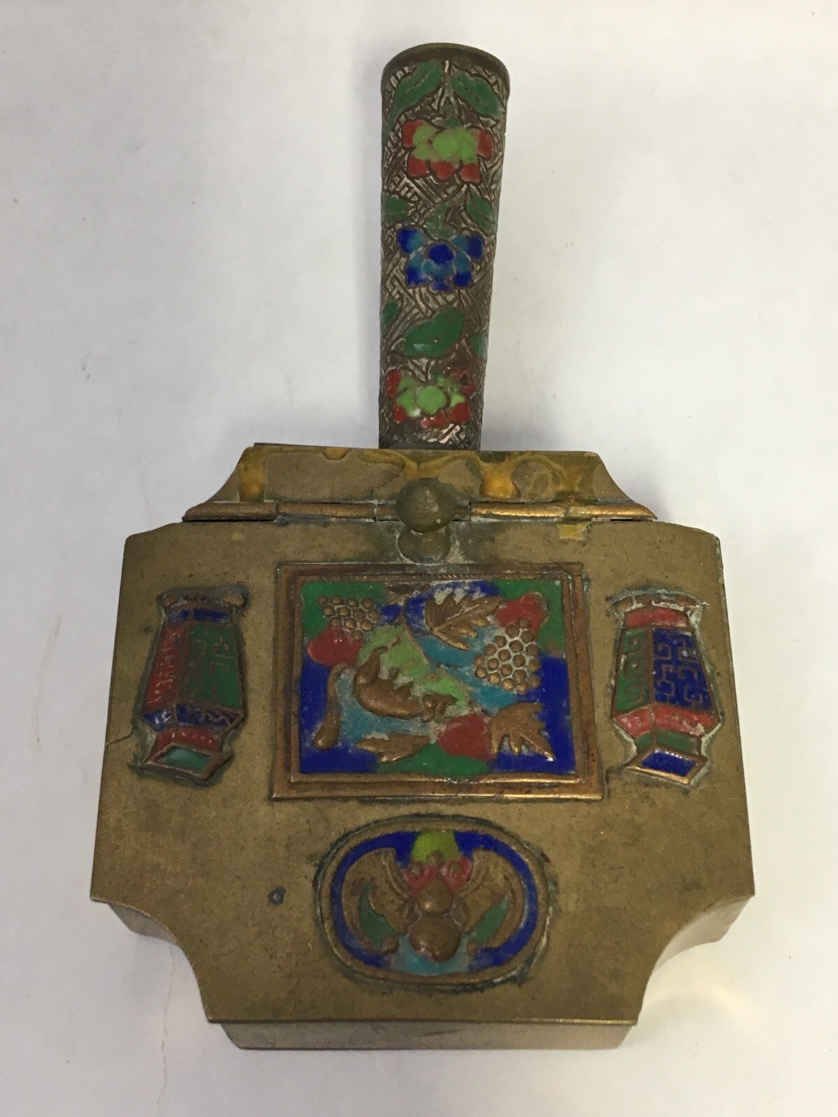 Chinese Enameled Brass Container Asian Design Hand Painted Iron WarmerMeasures 5 1/2” x 3” x 1 1/2”Some surface & scratching wear inside and out. There is some wax or glue on surface near back hinge. In overall nice vintage condition. See pictures for more details. ________________________________________________________We take pride in our packing and shipping. All our items are packed and shipped with care. We also like to recycle, so some of our items will arrive in re-used boxes with non-ebay labeling.We can combine shipping, just contact us and we will work it out how you want it.Thanks for taking a look. If you have any questions, we would be happy to answer them.