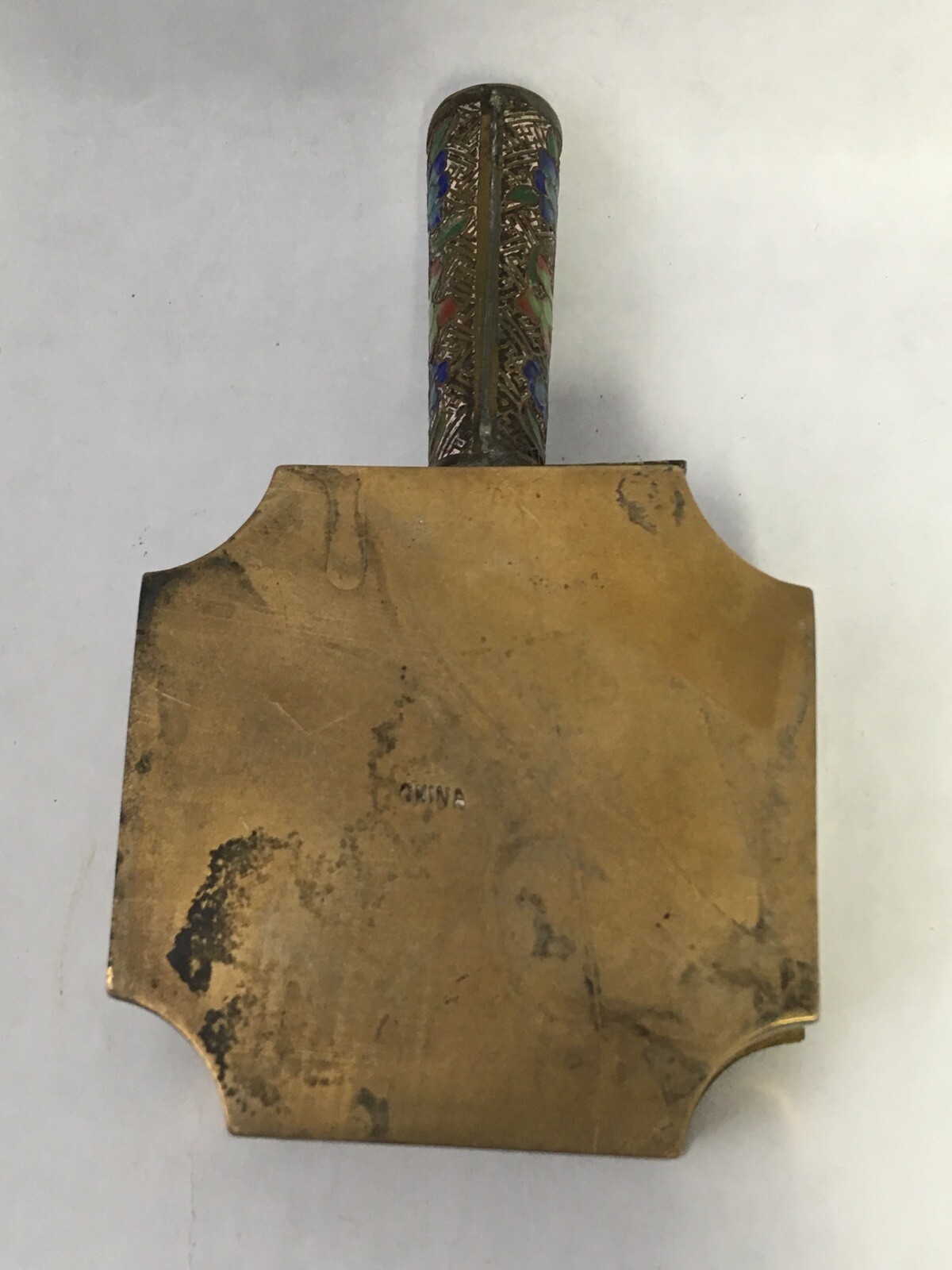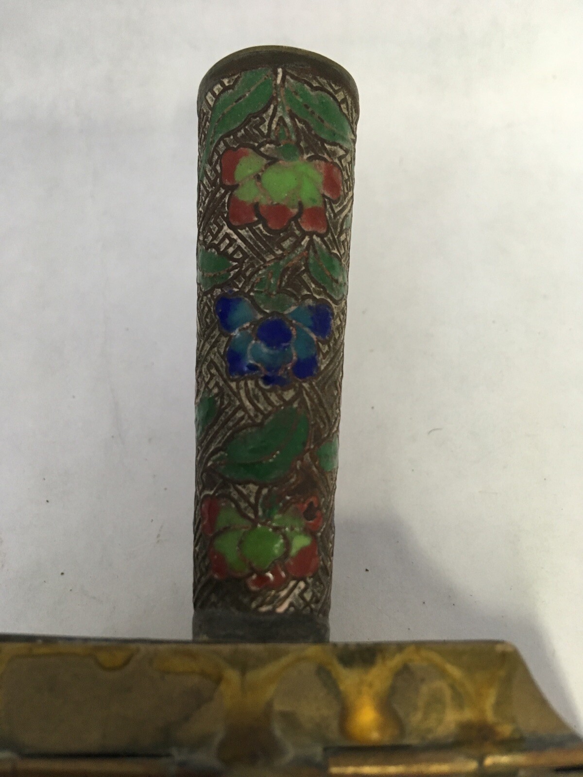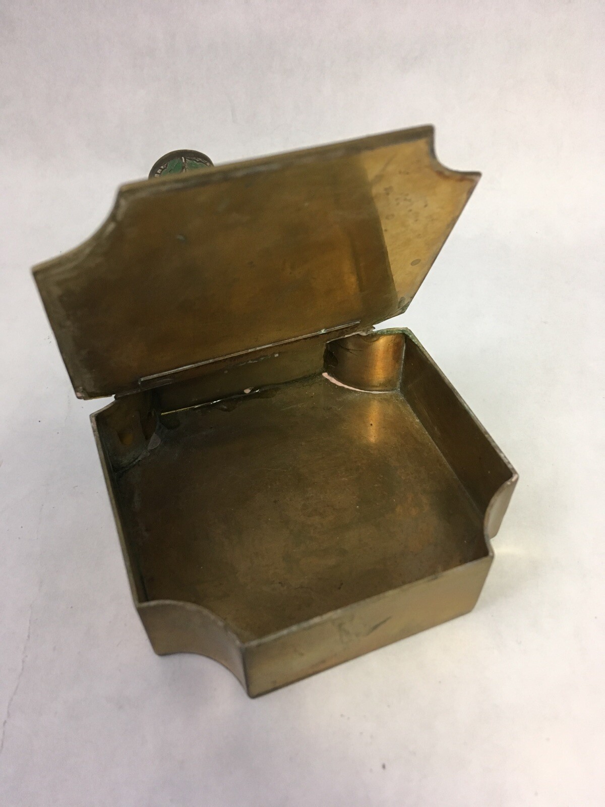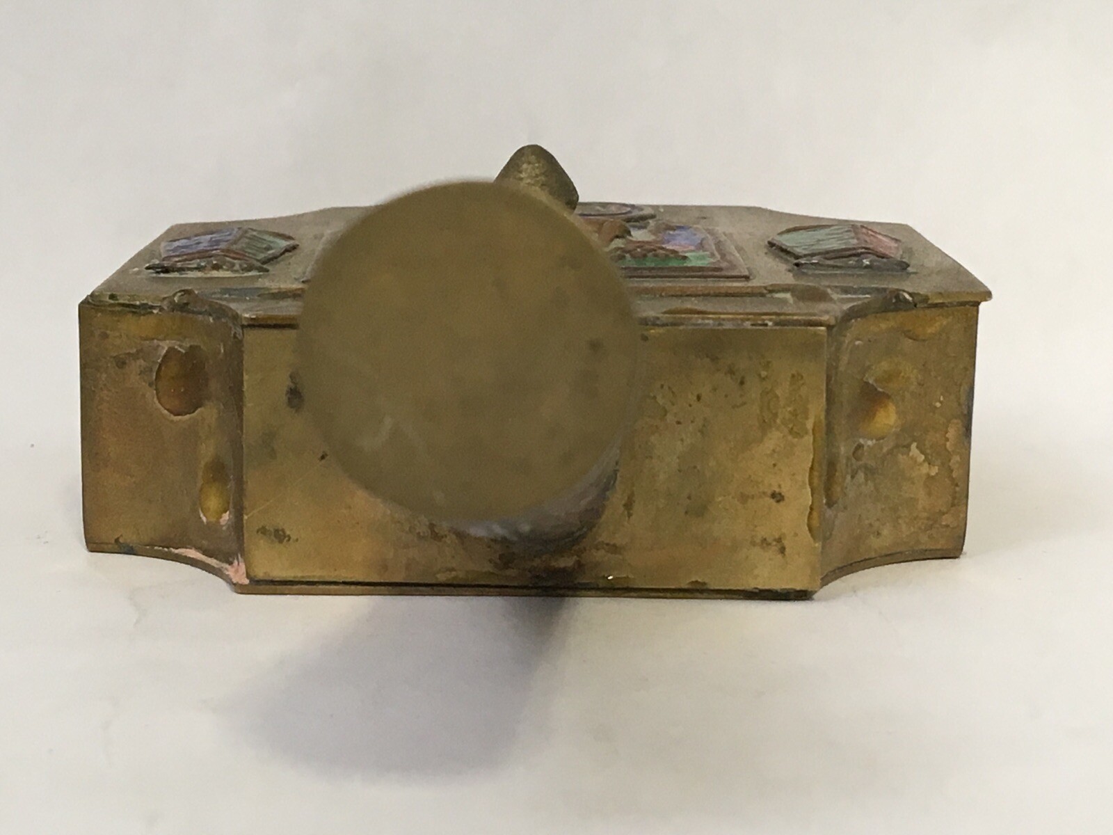 Chinese Enameled Brass Container Asian Design Hand Painted Iron WarmerMeasures 5 1/2” x 3” x 1 1/2”Some surface & scratching wear inside and out. There is some wax or glue on surface near back hinge. In overall nice vintage condition. See pictures for more details. ________________________________________________________We take pride in our packing and shipping. All our items are packed and shipped with care. We also like to recycle, so some of our items will arrive in re-used boxes with non-ebay labeling.We can combine shipping, just contact us and we will work it out how you want it.Thanks for taking a look. If you have any questions, we would be happy to answer them.