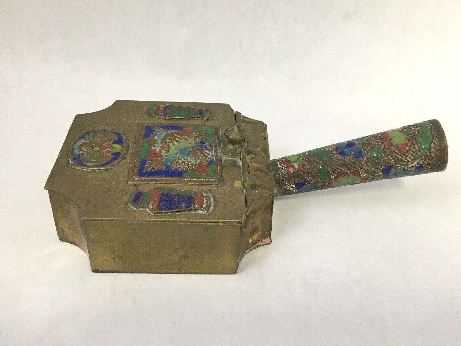 This vintage Chinese enameled brass iron warmer container is a collectible piece featuring an Asian-inspired design with hand-painted decoration. Condition: some surface and scratching wear inside and out, with some wax or glue residue near the back hinge; overall nice vintage condition. Check the listing for details and review the photos for closer views of the finish and any wear. Free shipping is included, making it a convenient option for collectors, decor use, or display in a curated vintage collection.