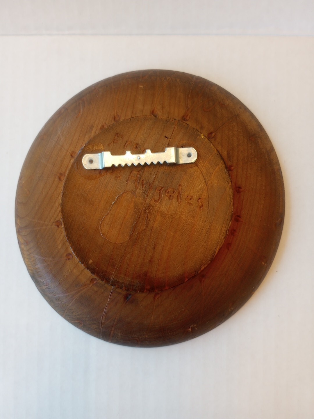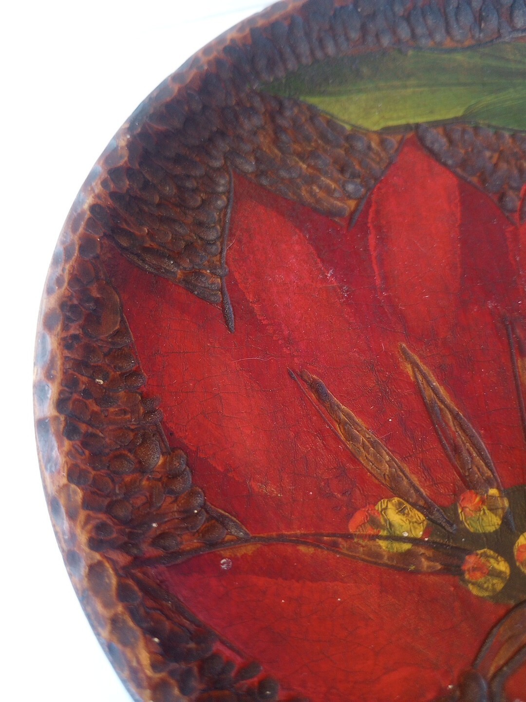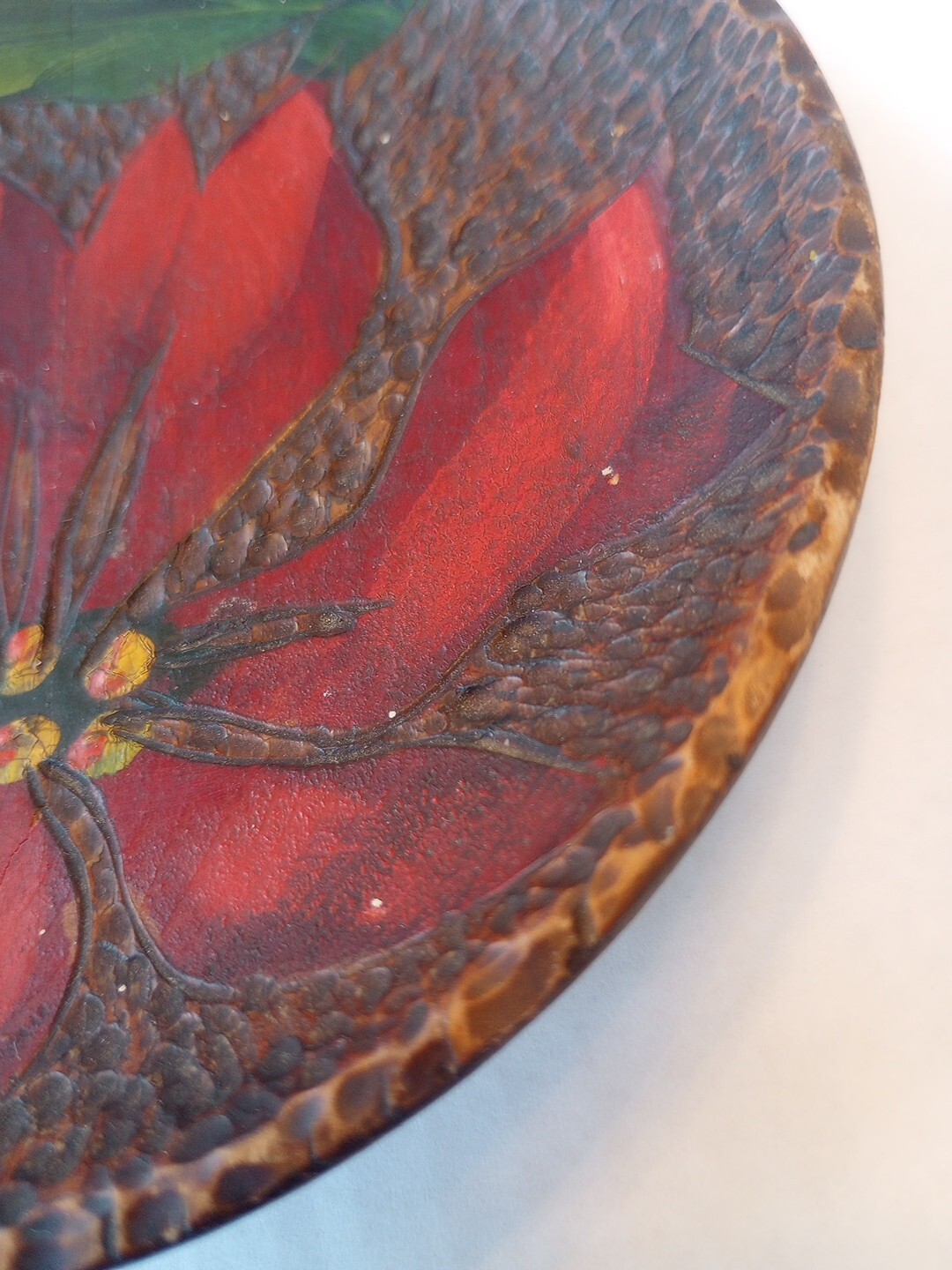 This vintage 6-inch wood burned pyography dish features a hand-painted poinsettia design and is listed in used condition. It may show normal signs of age, such as light wear or minor surface marks; check the listing for details. A nice option for holiday decor, small trinkets, or collectible display in a woodcraft or folk art collection. Free shipping is included, and the item will be packaged for safe delivery. Review the listing photos and notes for exact condition and any additional details.