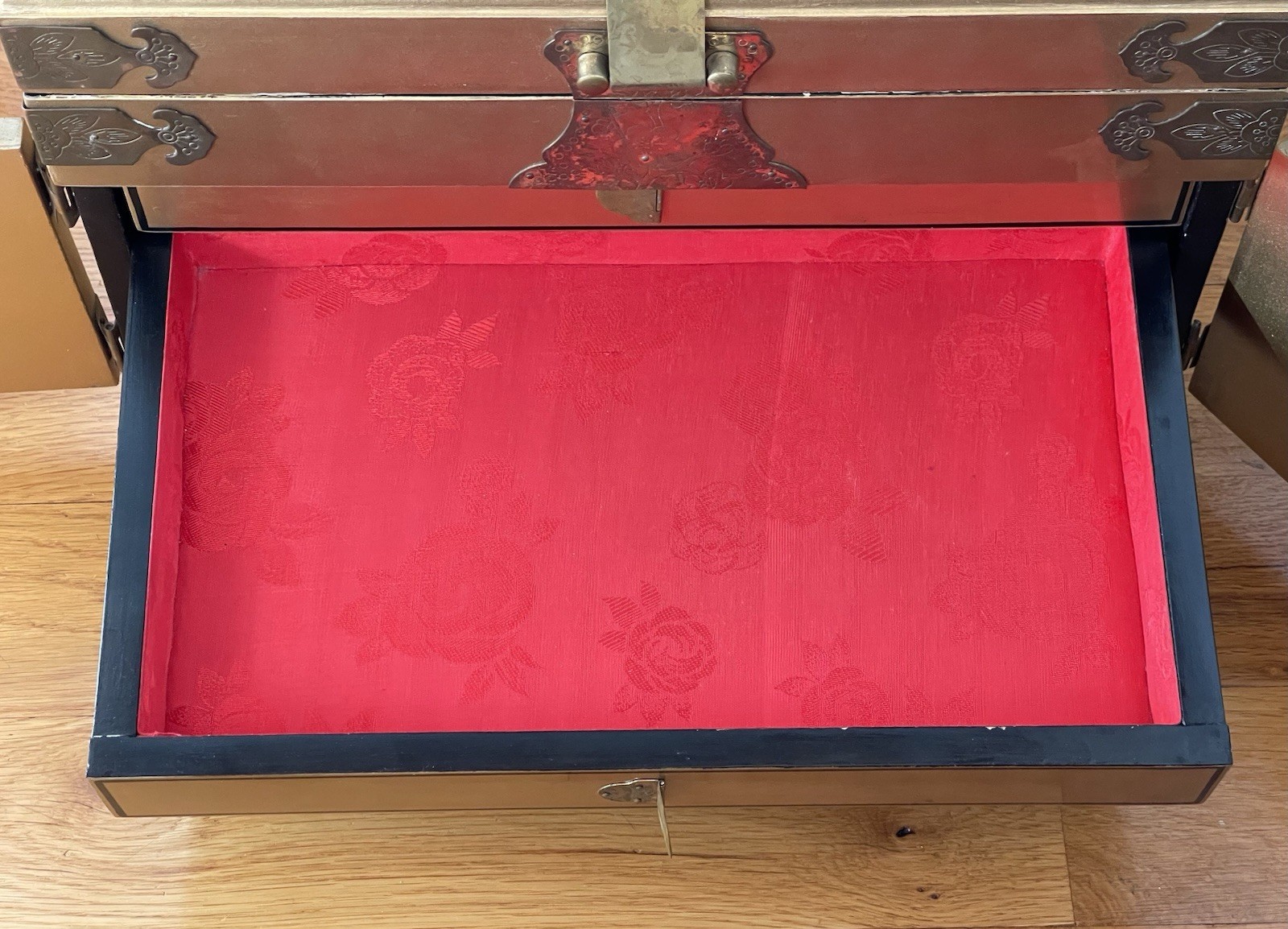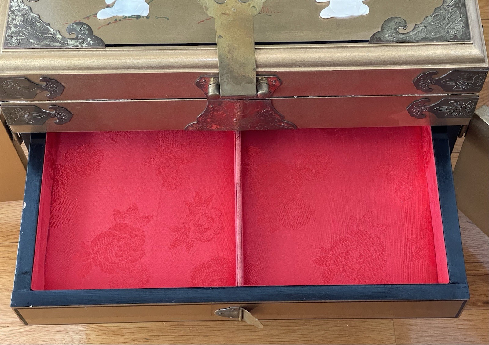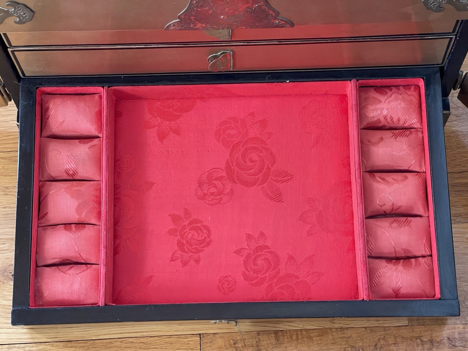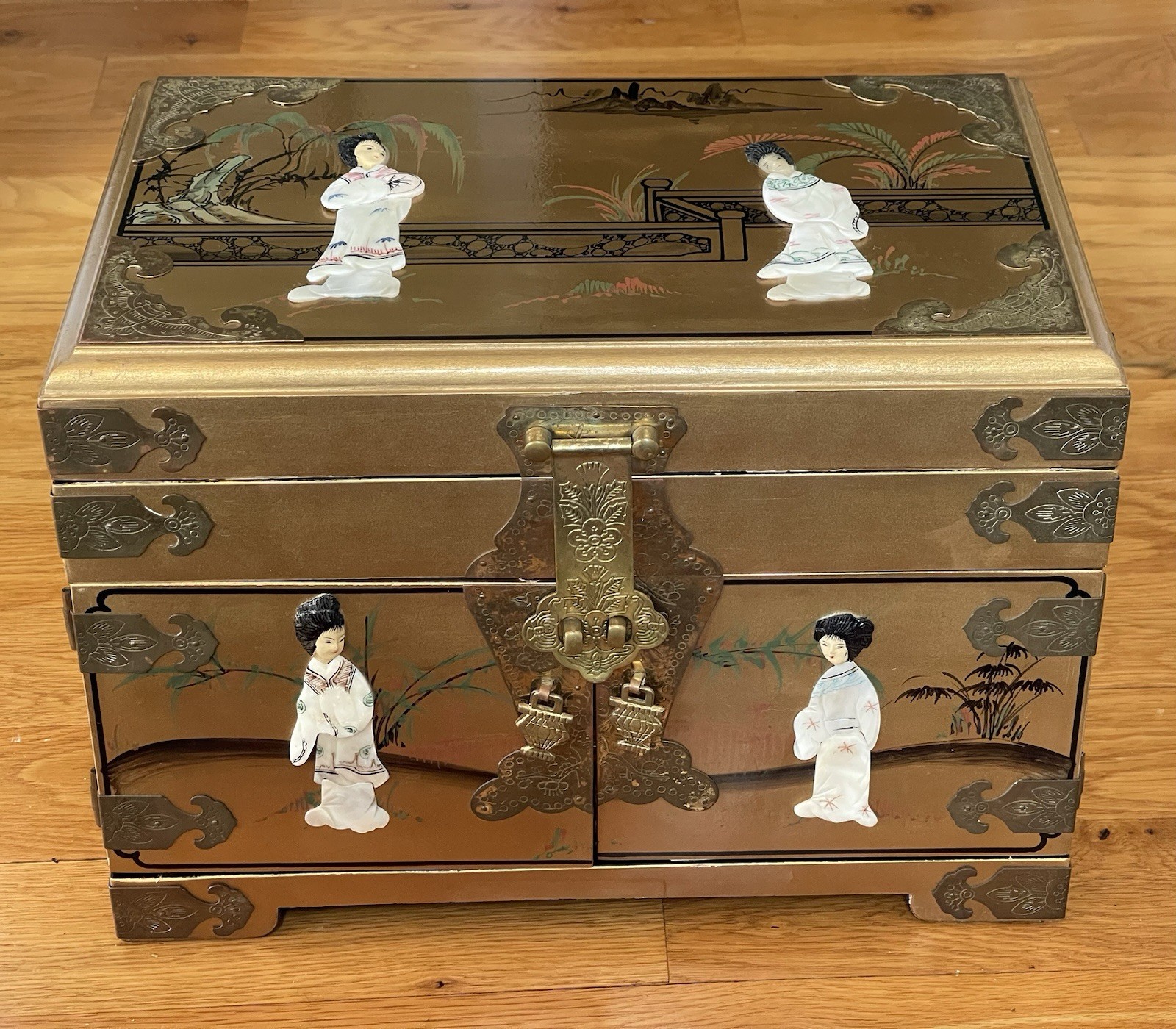 This vintage Chinese Asian lacquer jewelry box features a Geisha girls design and a multi-drawer layout for organizing jewelry and small collectibles. Condition is used; check the listing for details on finish wear, drawer function, and any marks from age or use. Approximate size is listed as 14" x 10" x 9"; check the listing for details and photos to confirm measurements and what is included. Ships with free shipping, and will be packed for safe delivery.