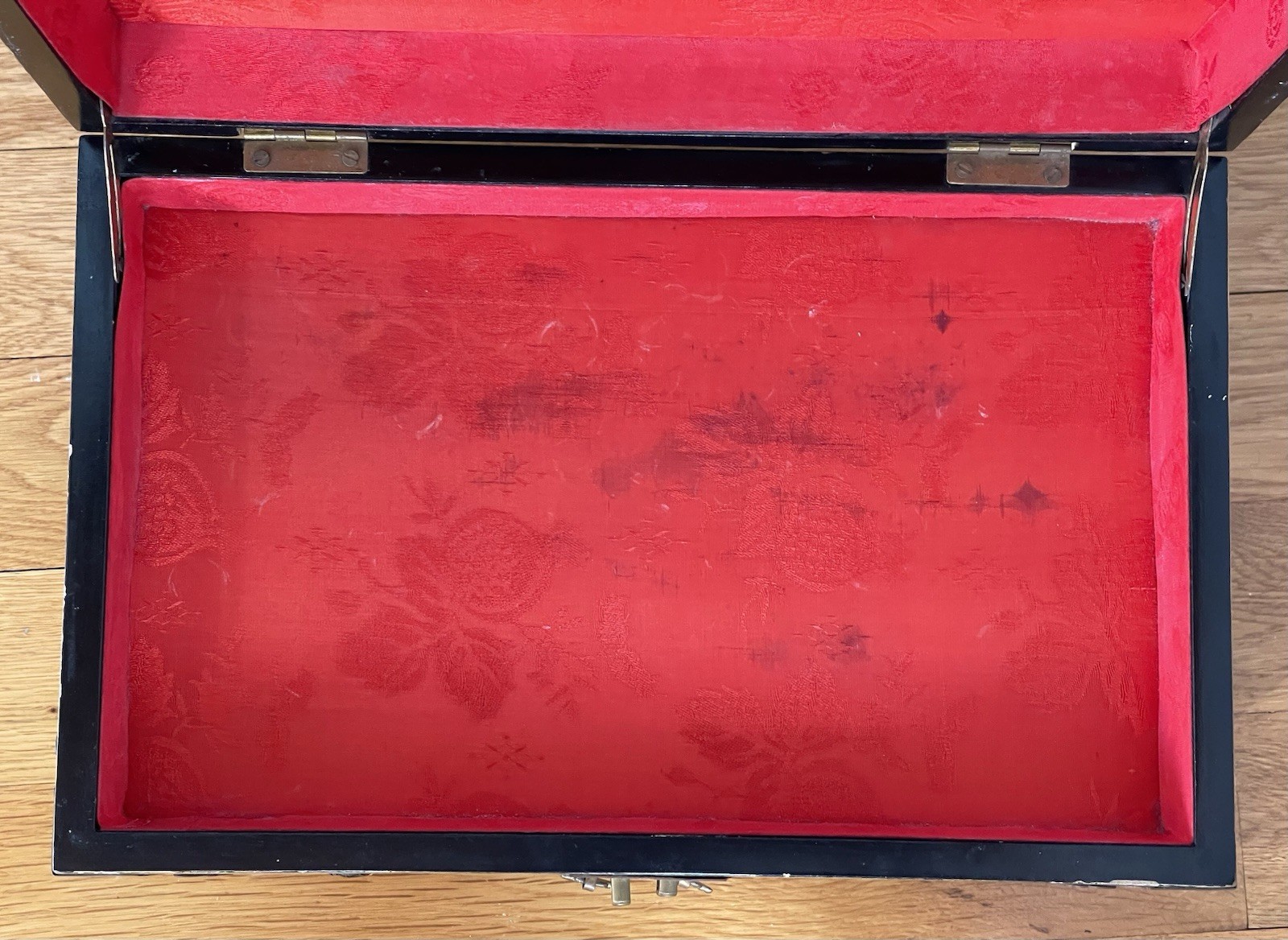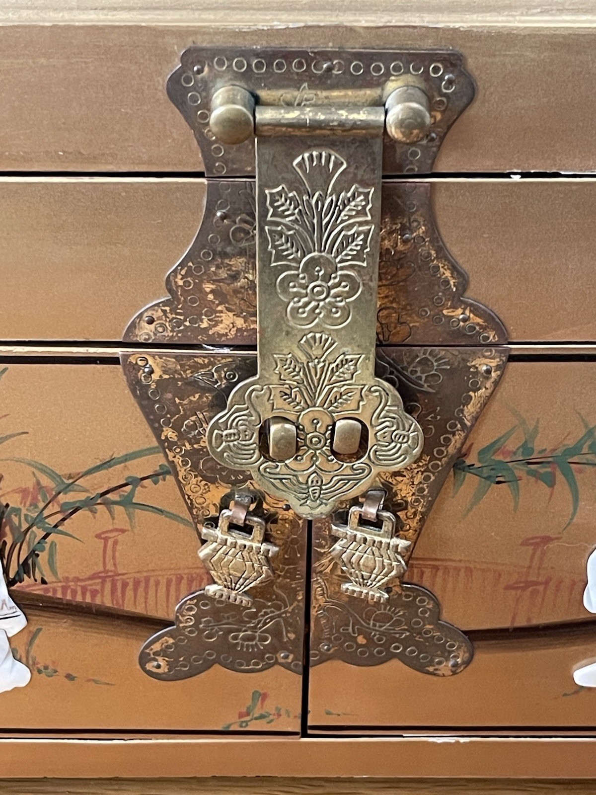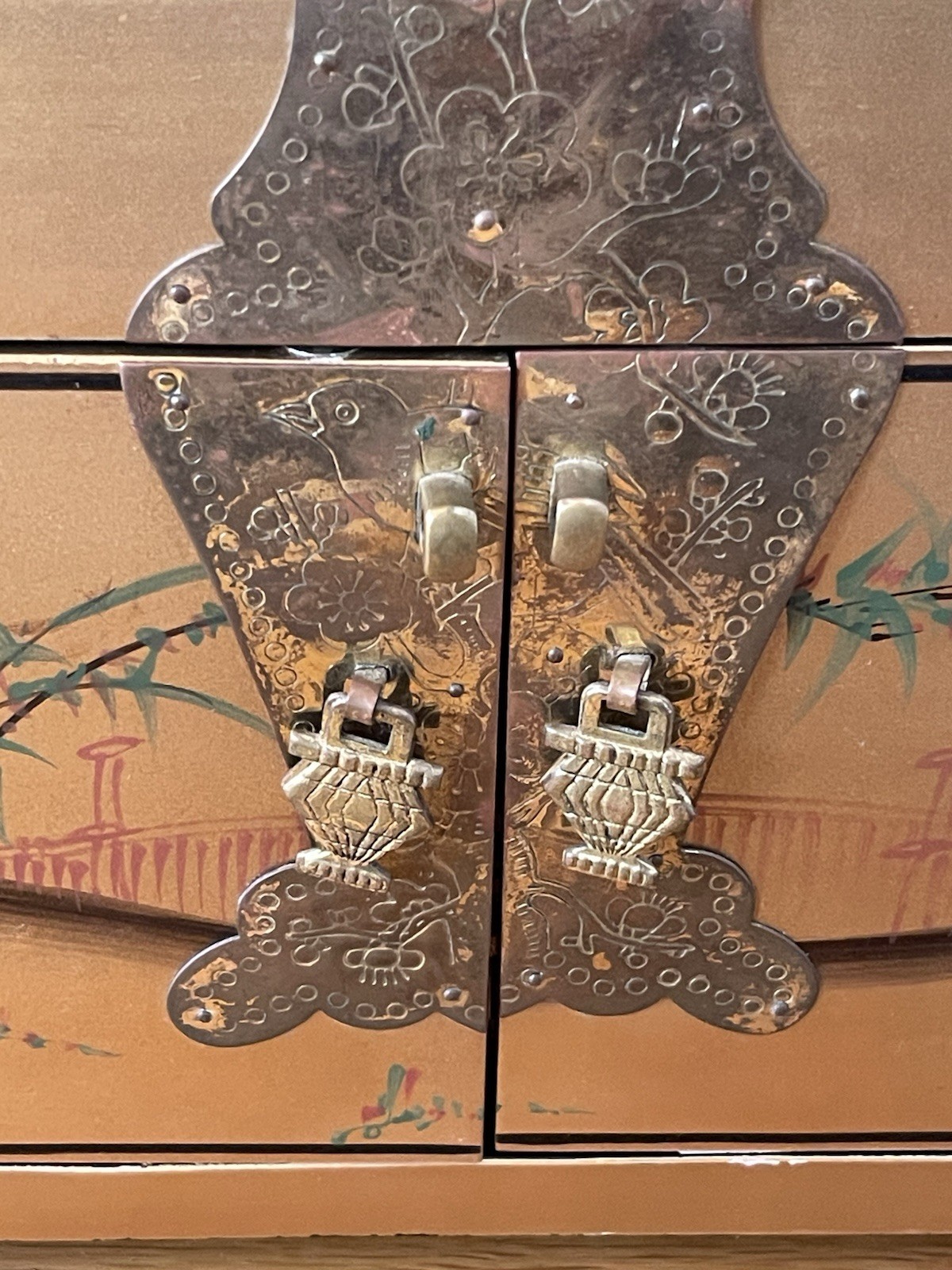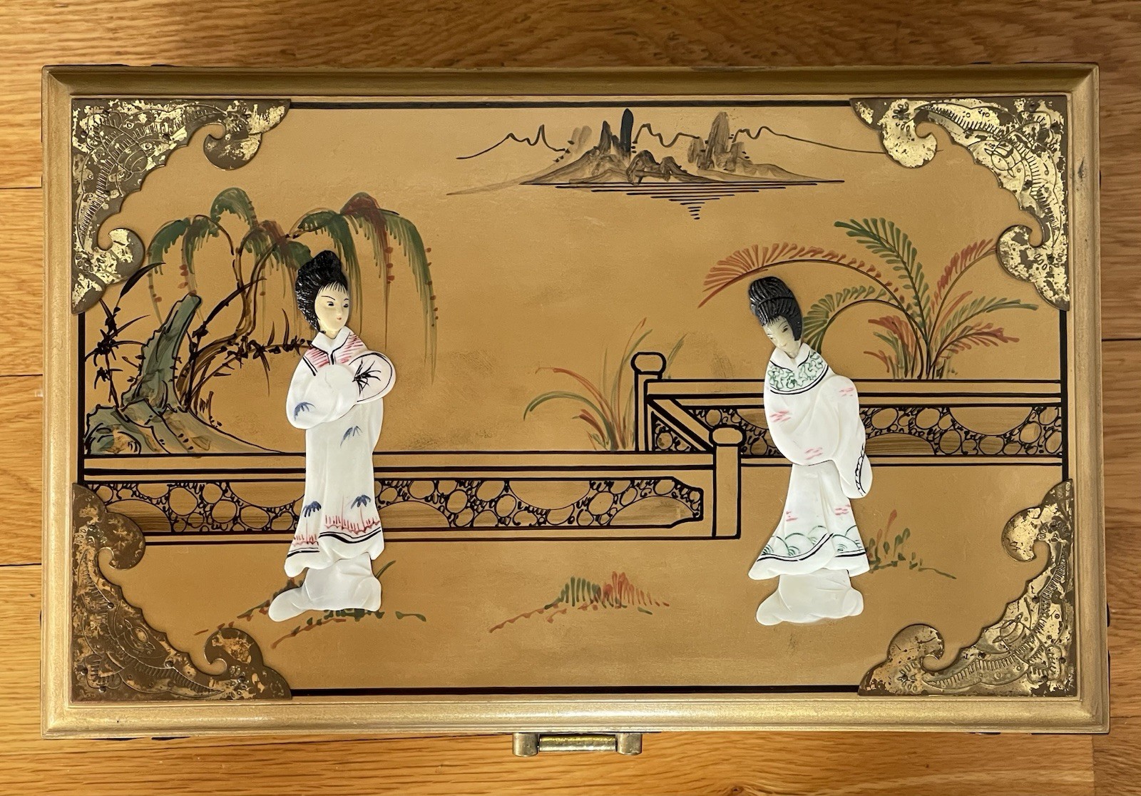 This vintage Chinese Asian lacquer jewelry box features a Geisha girls design and a multi-drawer layout for organizing jewelry and small collectibles. Condition is used; check the listing for details on finish wear, drawer function, and any marks from age or use. Approximate size is listed as 14" x 10" x 9"; check the listing for details and photos to confirm measurements and what is included. Ships with free shipping, and will be packed for safe delivery.