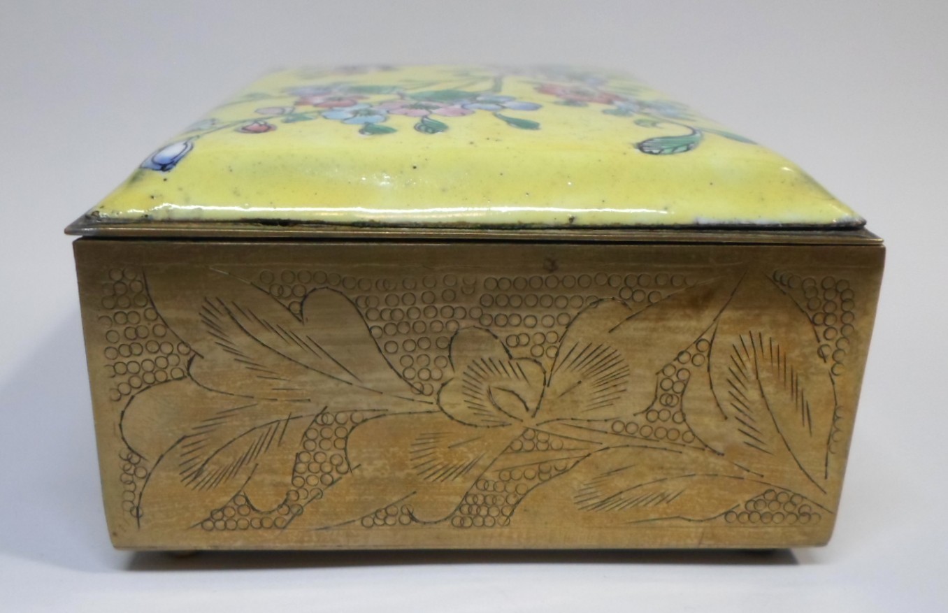 This is an antique brass, enamel and wood jewelry / trinket box made in China. The hinged lid features a lovely enamel panel of colorful flowers against a vivid yellow ground, the interior is lined in wood. The sides are decorated with engraved flowers and the bottom has four small button feet and the "China" mark as shown. It's in good condition without any breaks or cracks. It measures about 4" long, 3" wide and 2" tall with the lid closed. 2/12a 1lWe're dedicated to our customer's satisfaction, you may bid with confidence.We ship every day via US postal service Ground Advantage or Priority Mail.For international shipping quotes, please click on the gray "Shipping and payments" tab at the top of the description section above.Thanks for your bids, we appreciate your business!© Guerette Cosgrove Antiques