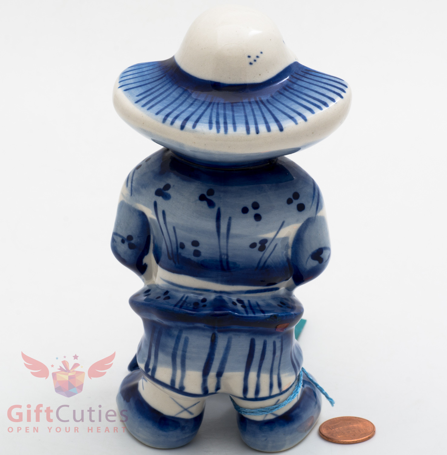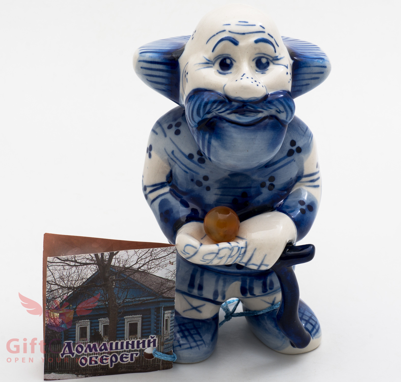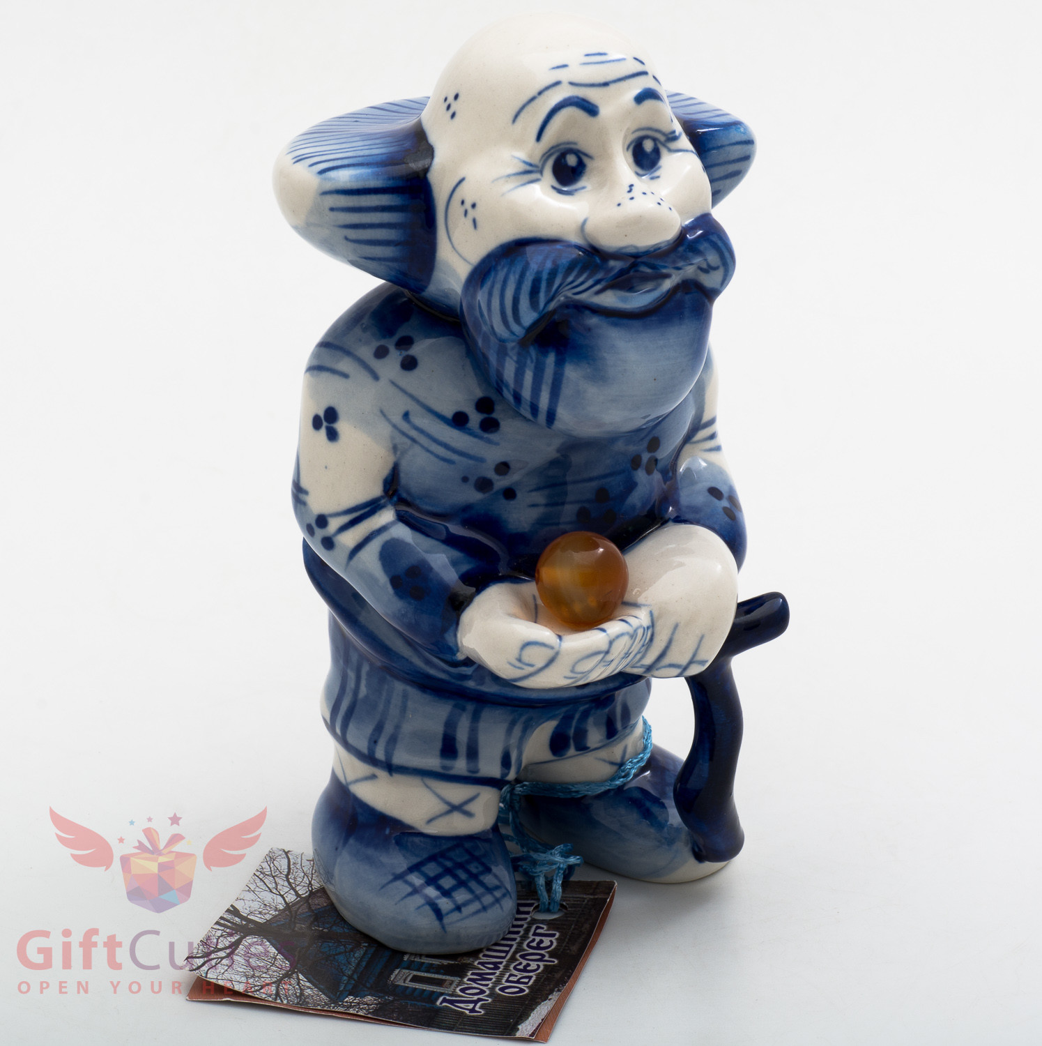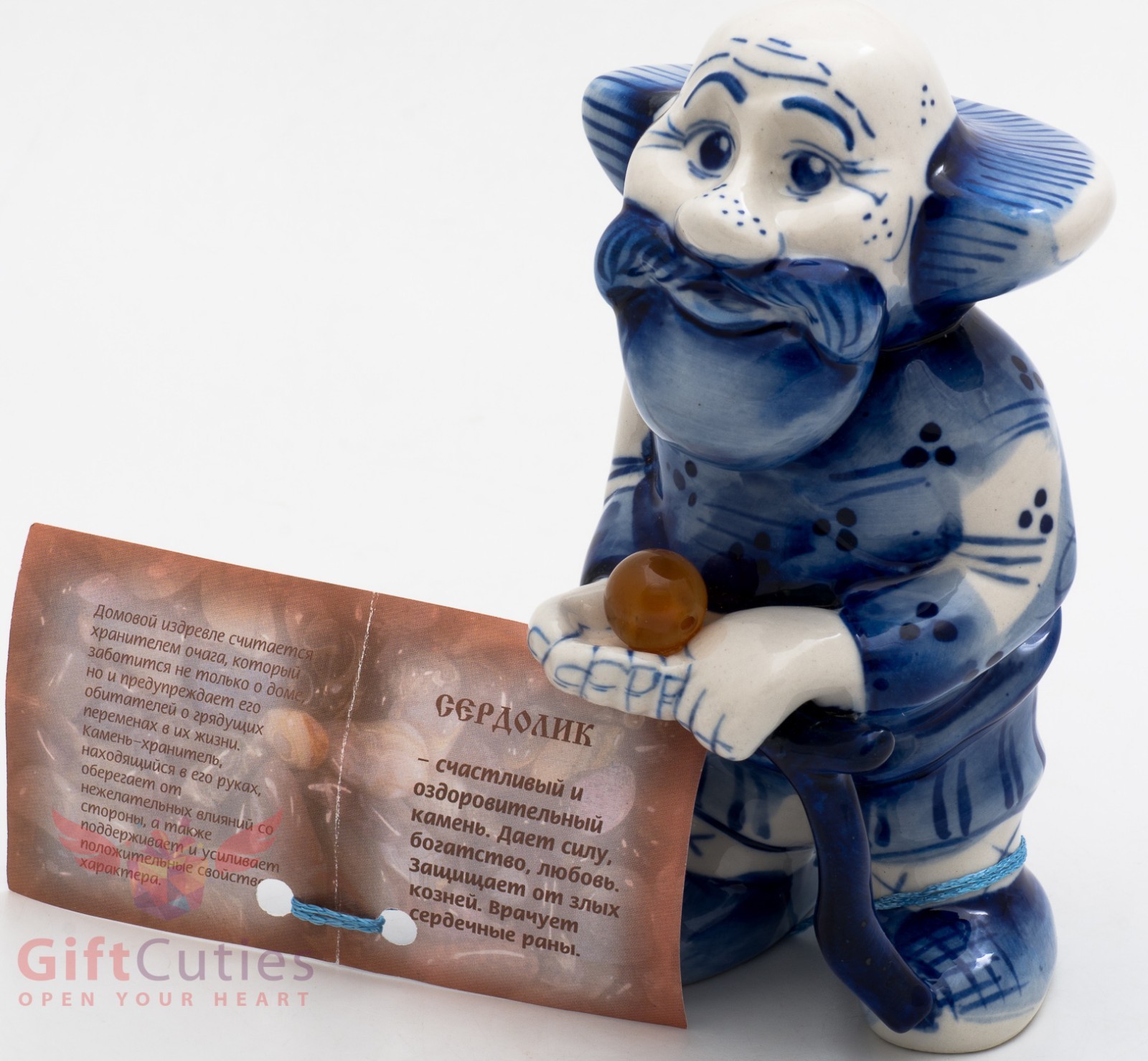 Gzhel home warding charm Оберег with Carnelian stone in hands Porcelain Figurine hand-painted Made in RussiaDimensions: 5.6" tall and 3.1" wide