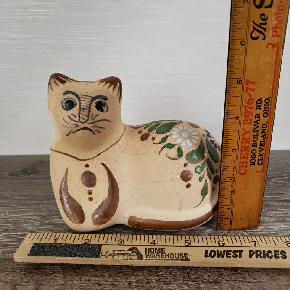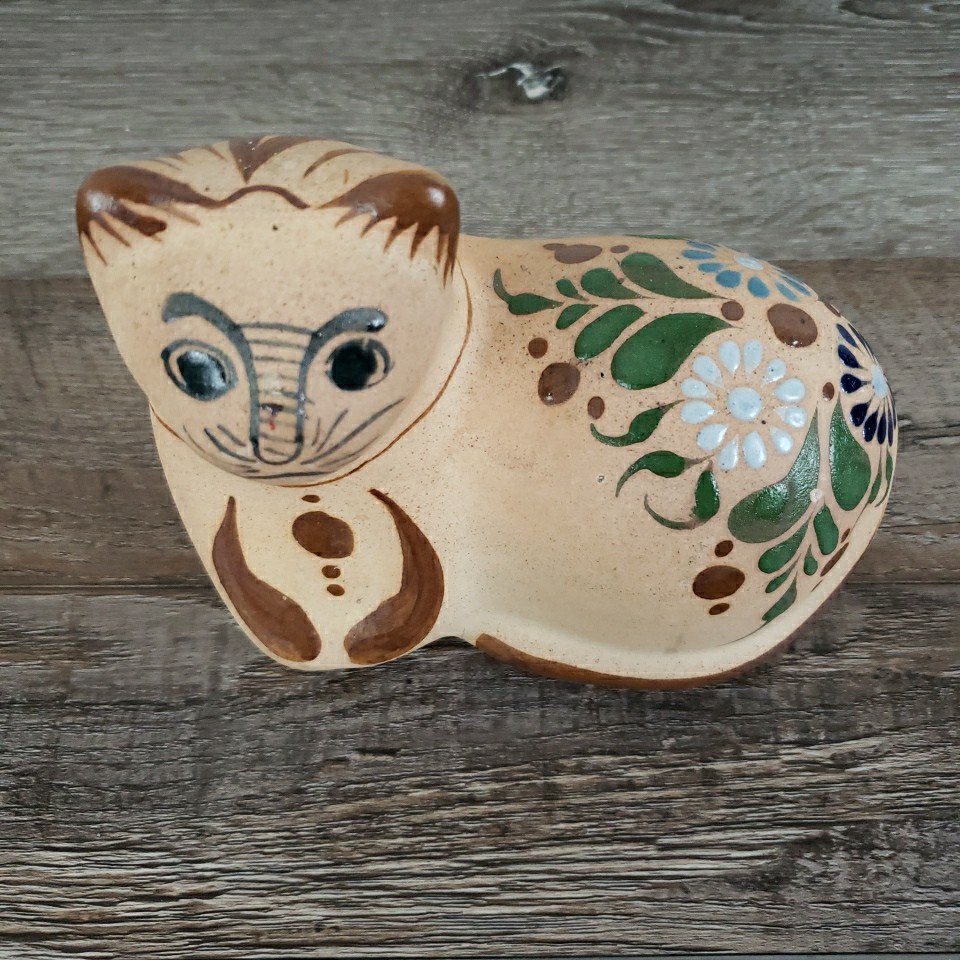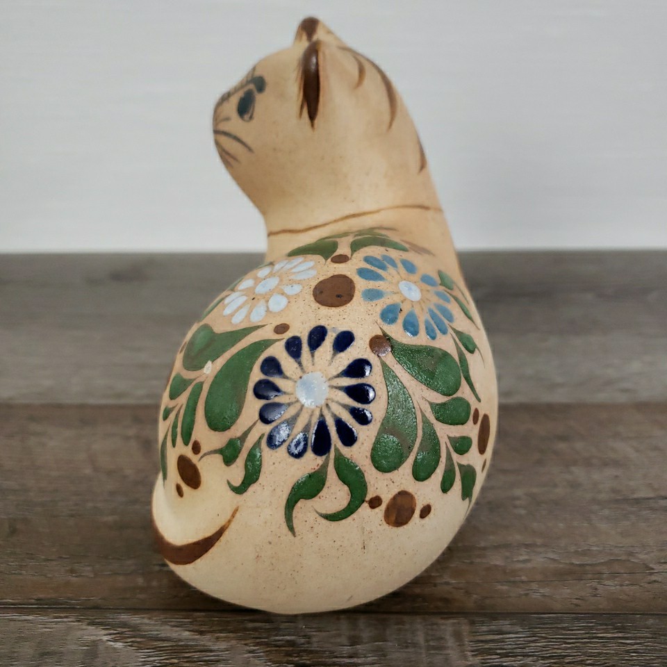 This used Mexican pottery cat figurine features hand-painted folk art styling with textured floral details. It’s a decorative collectible that can suit shelves, mantels, or curated folk art displays. Condition is used; check the listing for details on any wear, chips, or paint variation that may be present from age or handling. Free shipping is included, and the item will be packed to help protect it in transit. Check the listing for details.