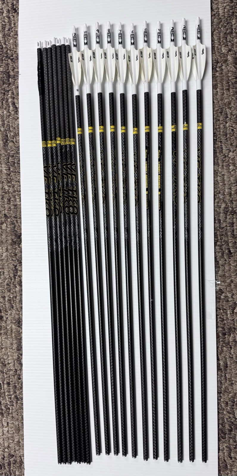 18 - VF TKO V1 300 SpineCarbon to Carbon = 26.75”AAE IP6 NocksAll in Great shape, several have never even been shotLove these arrows, just changed my DL and these are now too short for me.