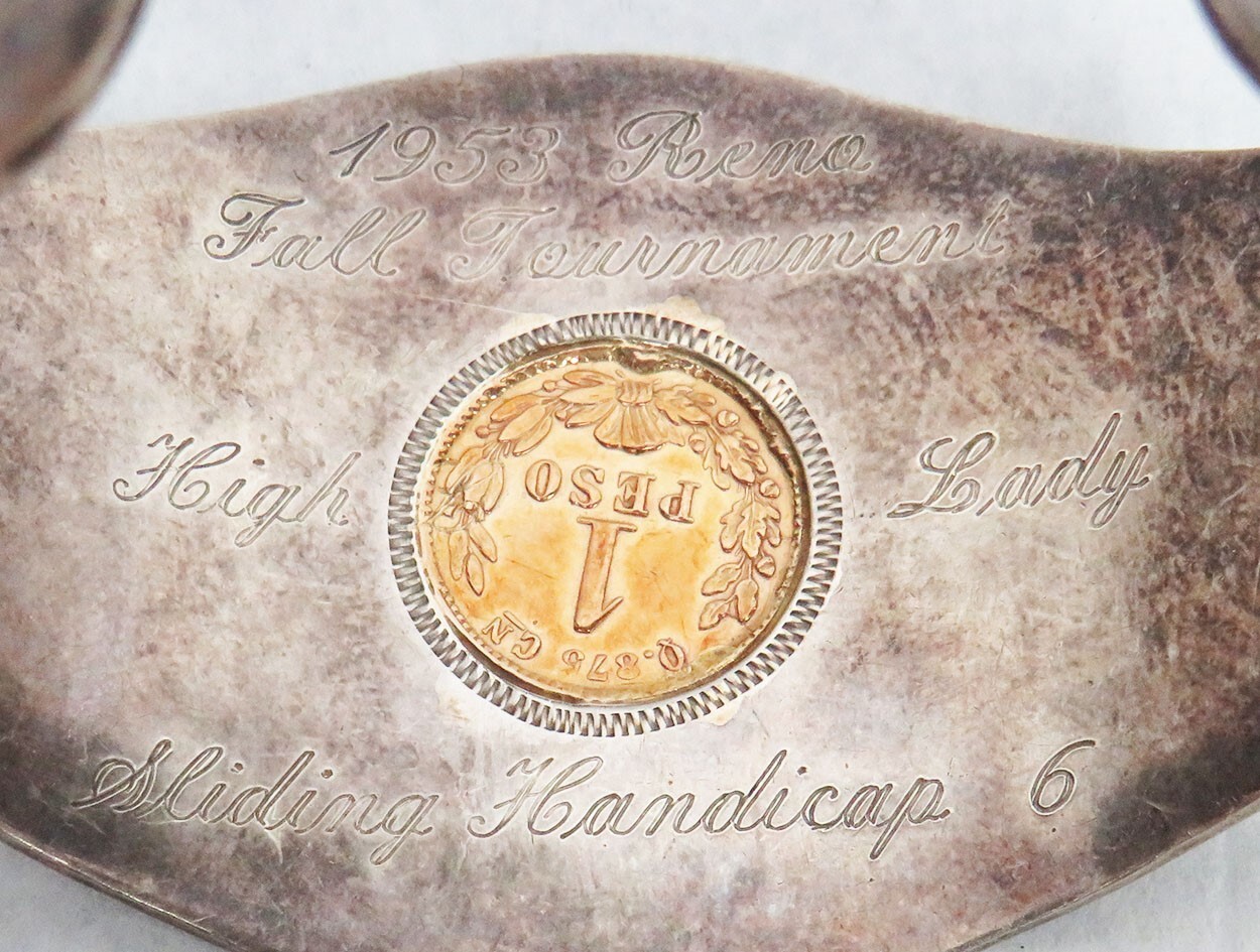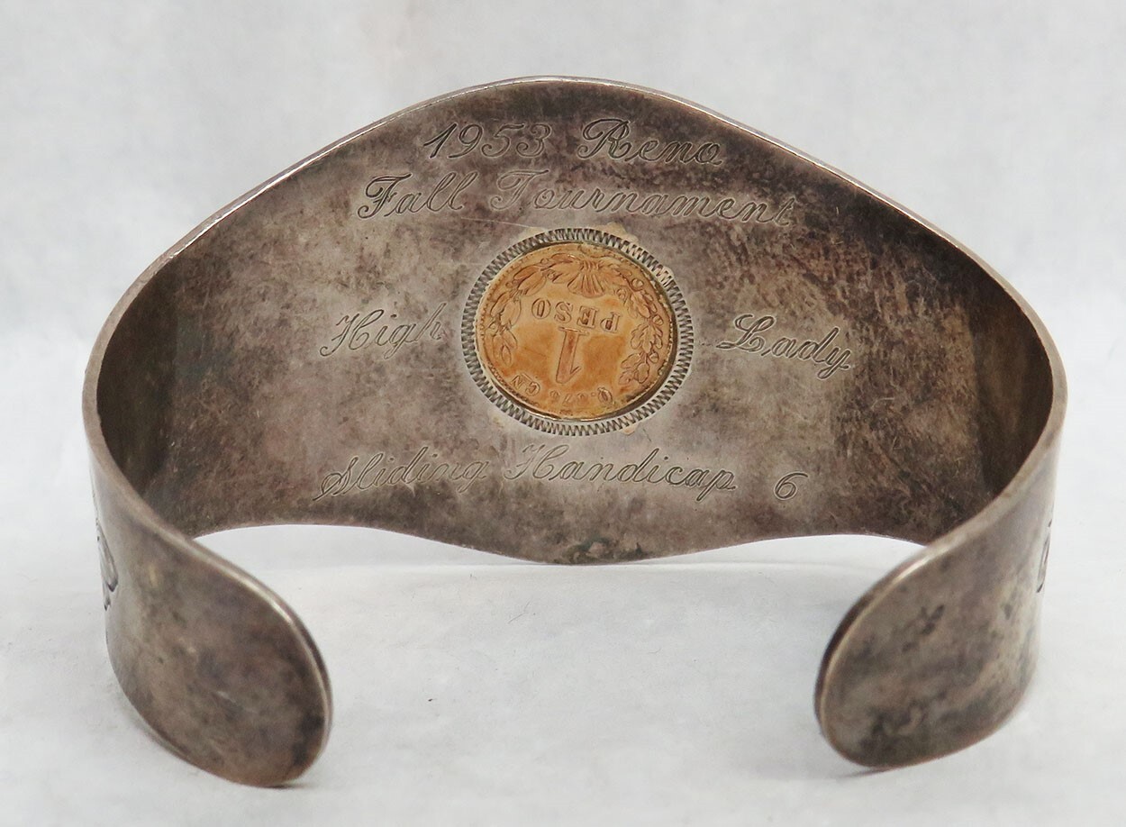 A RARE OLD RODEO CHAMPION BRACELET FROM RENO NV. BRACELET WAS MADE IN STERLING SILVER, ORNATELY HAND ENGRAVED, WITH A 1899 CN MEXICAN GOLD 1 PESO IN CENTER COIN CONTAINS 1.292 GRAMS OF GOLD AND IS 25 MM IN DIAMETER "COIN WAS MINTED AT THE CULIACAN MEXICO MINT WHICH WAS LOCATED IN THE CITY OF CULIACAN IN THE NORTHWEST PART OF MEXICO IN THE STATE OF SINALOA." THE BRACELET IS ENGRAVED ON THE BACK "1953 RENO, FALL TOURNAMENT, HIGH LADY, SLIDING HANDICAP 6" WITH AL OF IT'S.ORIGINAL PATINA THE ENTIRE DIAMETER IS 7 INCHES TOTAL WEIGHT IS 35.4 GRAMS USA shipping is per item. All packages fully insured. Shipments over $200 value is signature required.You can arrange pickup from our Fort Lauderdale storefront locationOur business hours are Monday - Friday 10:00am-5:00pm ESTFlorida Sales Tax applicable to invoice totals under $500 on any NON USA minted itemsINTERNATIONAL SHIPPING & DELIVERY*Import taxes and duties are NOT included in the item price or shipping charges. We cannot declare any package as a "gift", ”sample”etc.*We do combine shipping on international auctions won.*We now ship solely via USPS Priority Mail International or Fedex International foryour additional tracking and security and ensure delivery to customs.FEEDBACK Feedback will automatically be sent upon initial feedback received. Feedback will get left within 48 hours of confirmed delivery eBay sales tax collection eBay will calculate and add the applicable sales tax at checkout. The buyer will pay both the cost of the item along with the sales tax. eBay will collect and remit the tax. Sellers are not able to opt out of selling items into the states listed above or opt out of eBay automatically collecting sales tax. Based on applicable tax laws, eBay will calculate, collect, and remitsales tax on behalf of sellers for items shipped to customers.