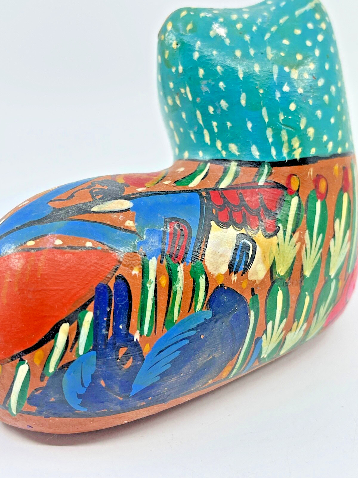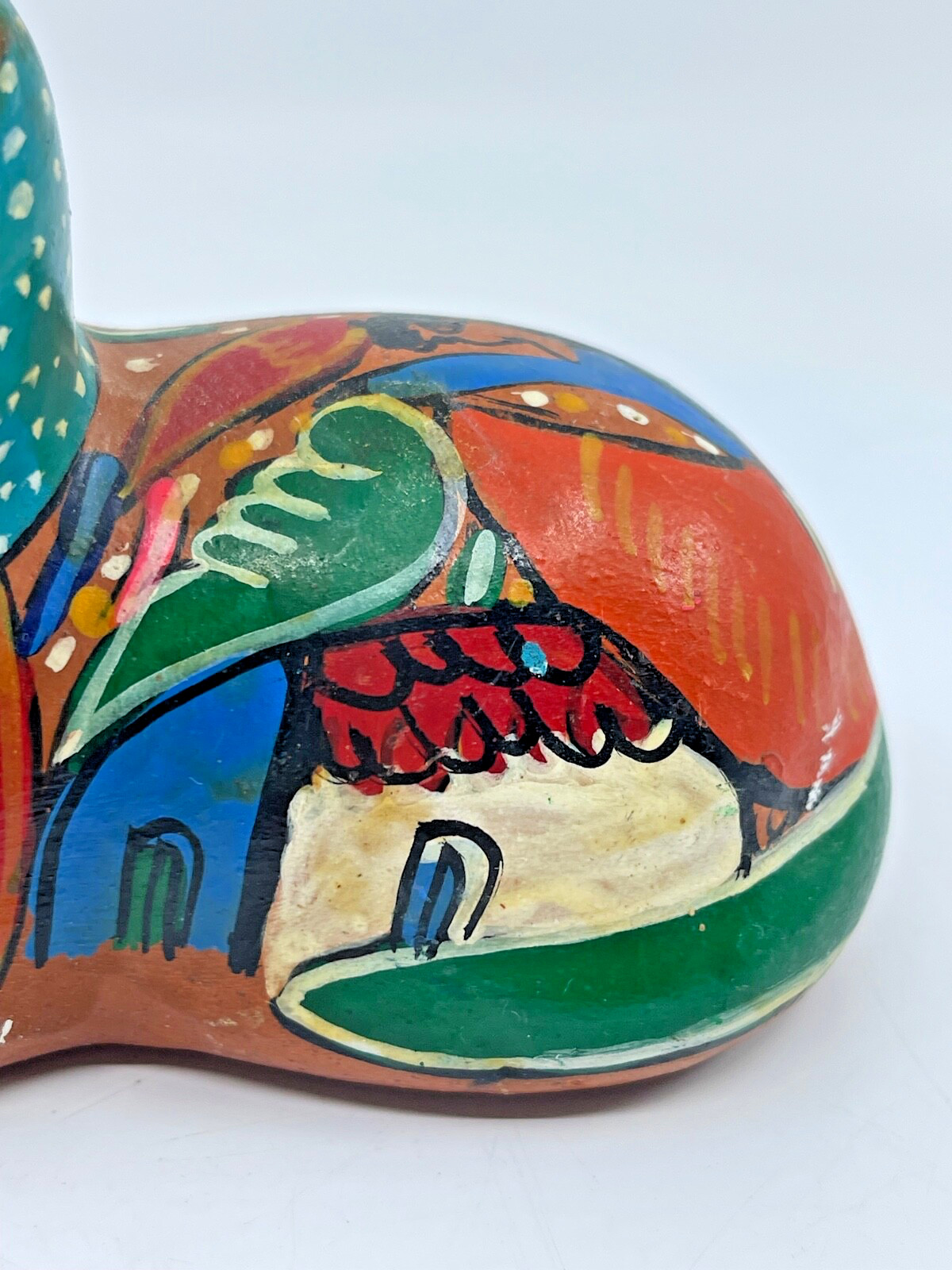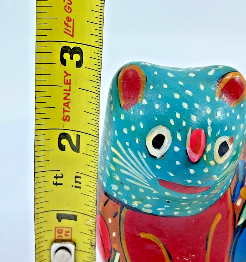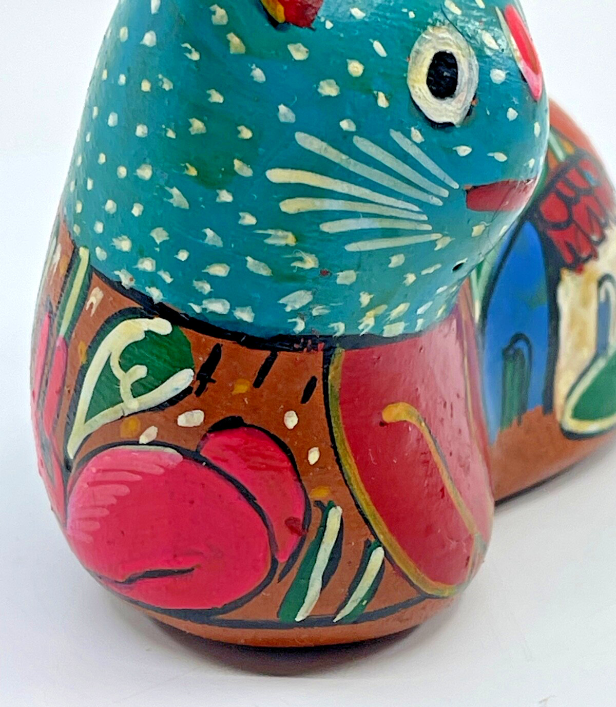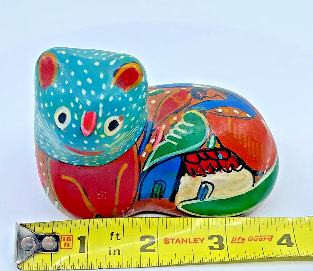 This vintage Mexican pottery folk art cat ceramic figure sculpture, measuring 3.5 inches in length, is a beautifully handcrafted piece that embodies the rich cultural heritage of Mexico. With its unique design and Mexican provenance, this figurine captures the essence of Mexican folk art and craftsmanship. Perfect for collectors or those interested in Latin American cultures, this charming sculpture adds a touch of authenticity and tradition to any farmhouse or rustic decor setting.