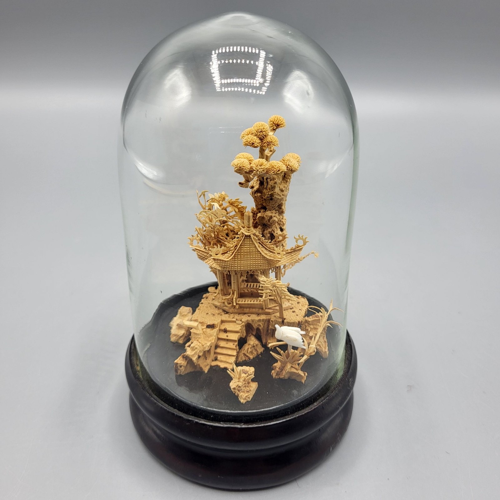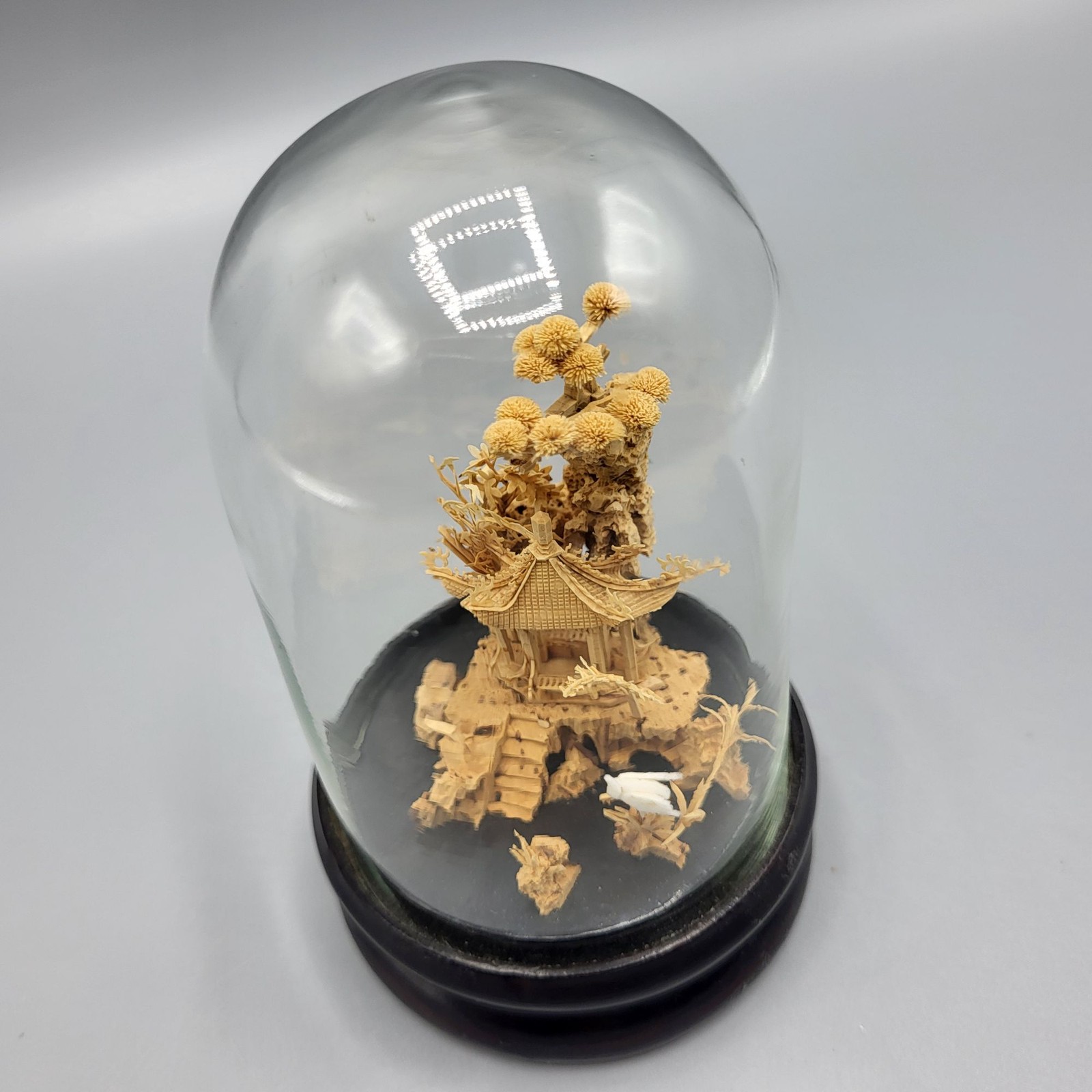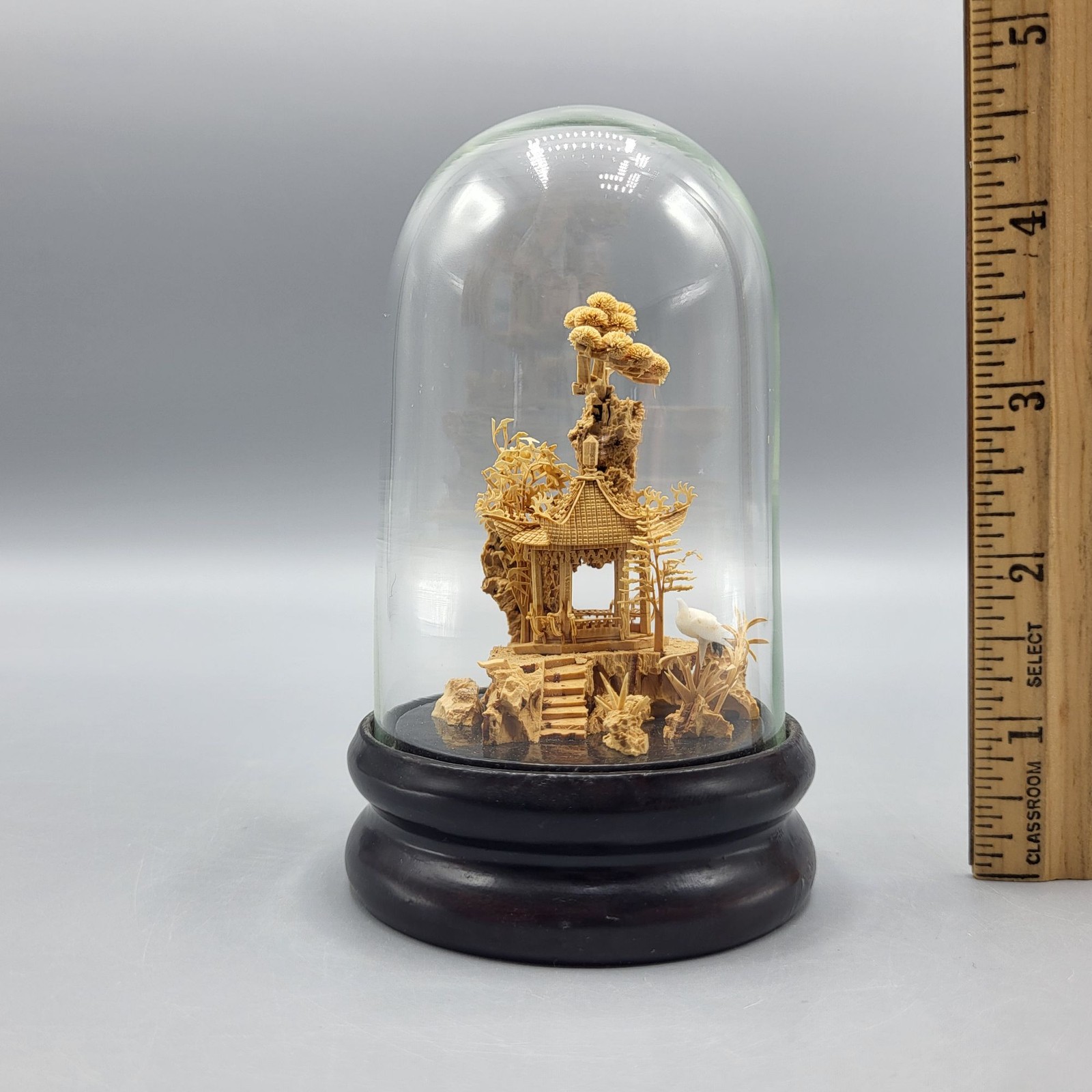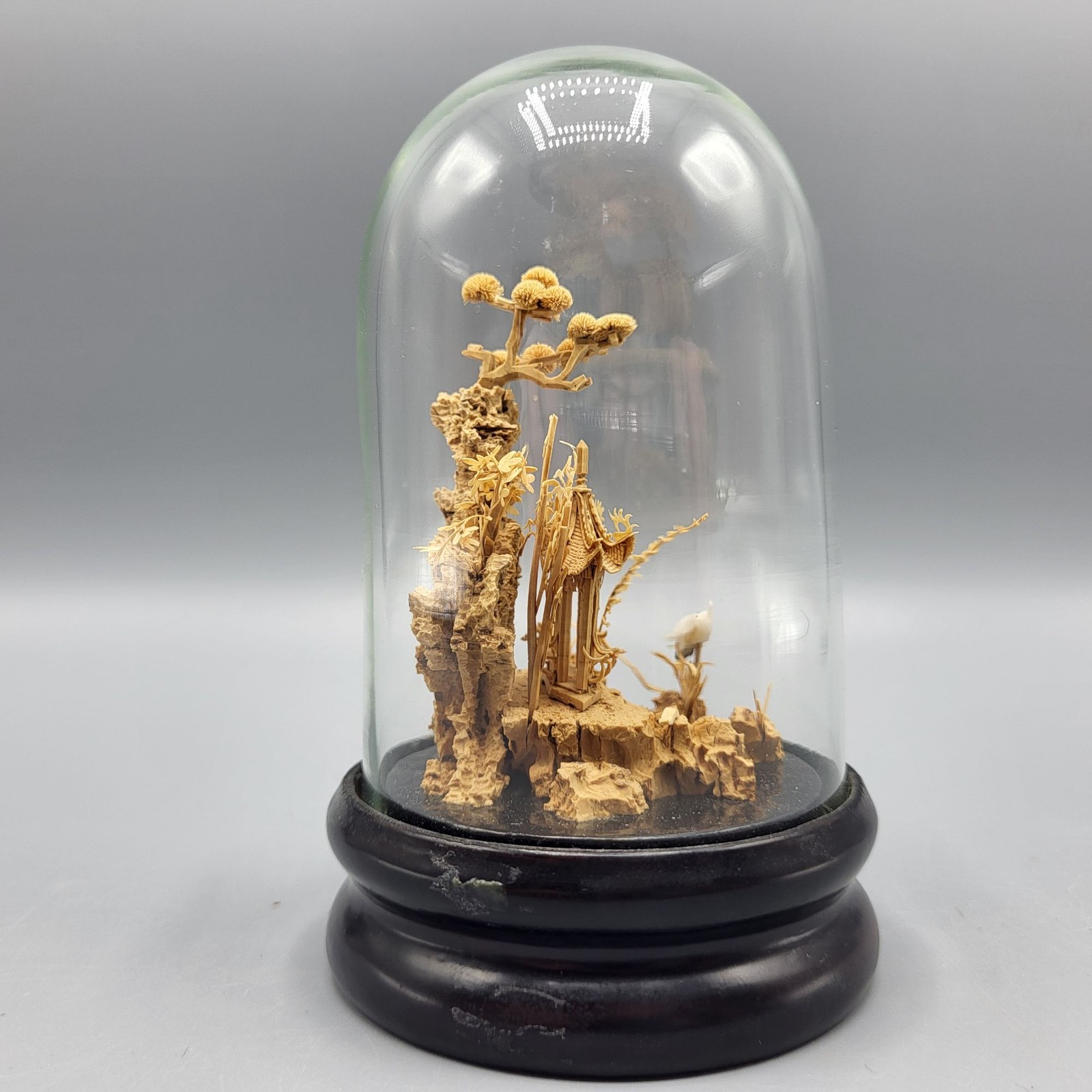 This vintage Chinese carved cork diorama under a glass dome features a dark wood base and makes a distinctive shelf decor collectible. Condition: pre-owned and in good condition overall with visible wear from age and light use; the crane figure is missing its head. The item is sold as pictured, so please review the listing photos for exact details on materials, size, and any other imperfections. Free shipping is included. Check the listing for details.