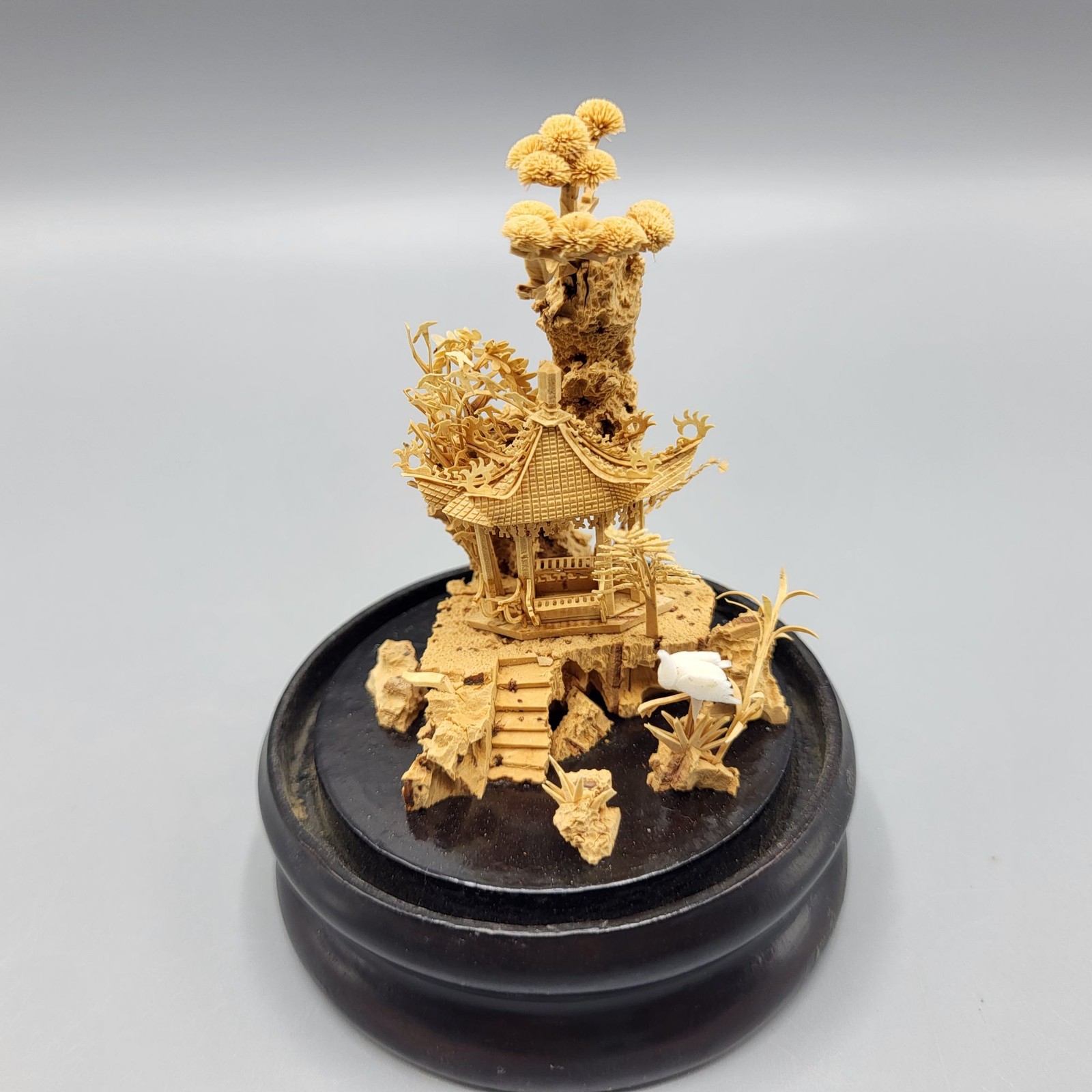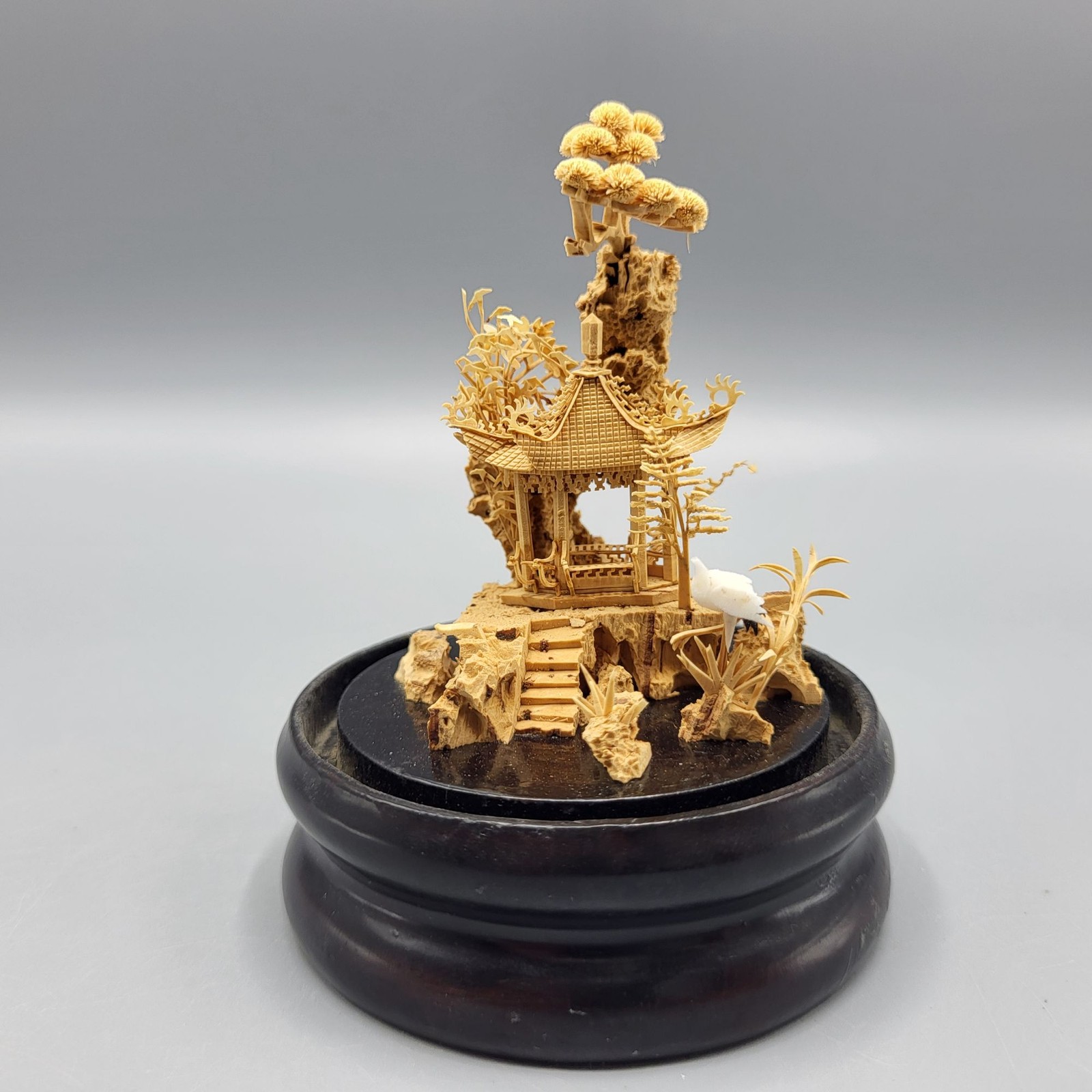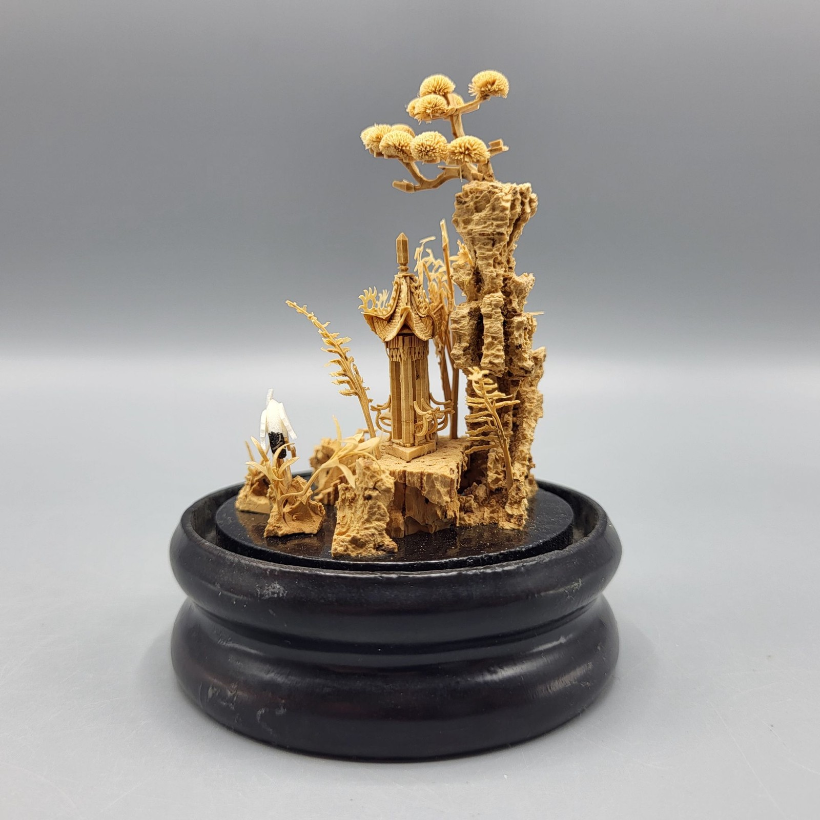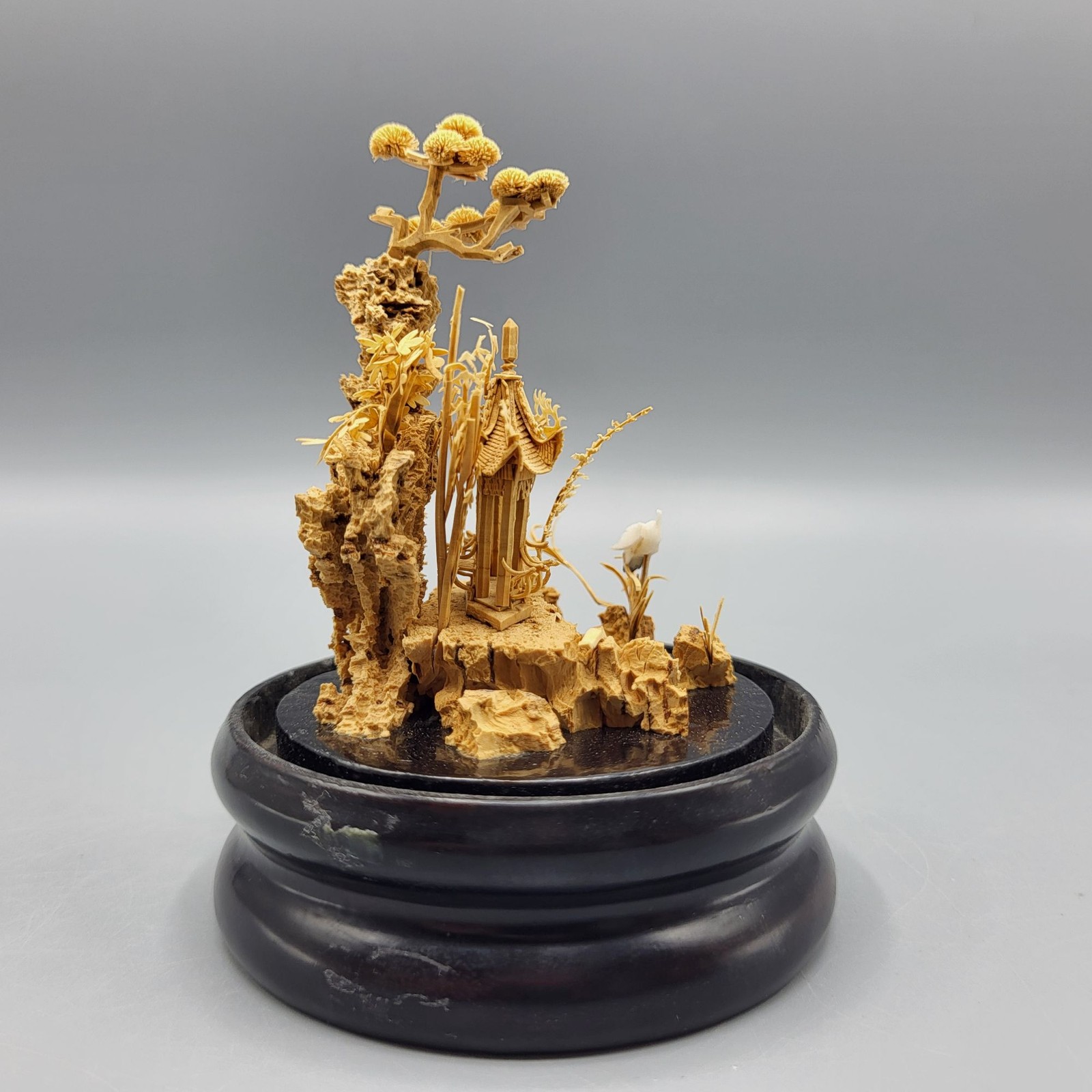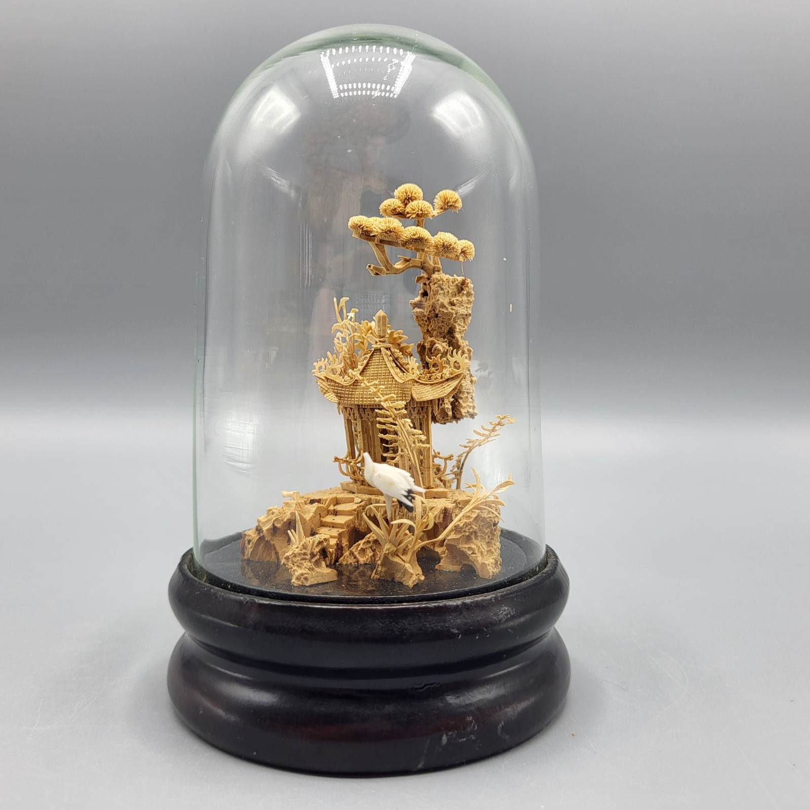 This vintage Chinese carved cork diorama under a glass dome features a dark wood base and makes a distinctive shelf decor collectible. Condition: pre-owned and in good condition overall with visible wear from age and light use; the crane figure is missing its head. The item is sold as pictured, so please review the listing photos for exact details on materials, size, and any other imperfections. Free shipping is included. Check the listing for details.