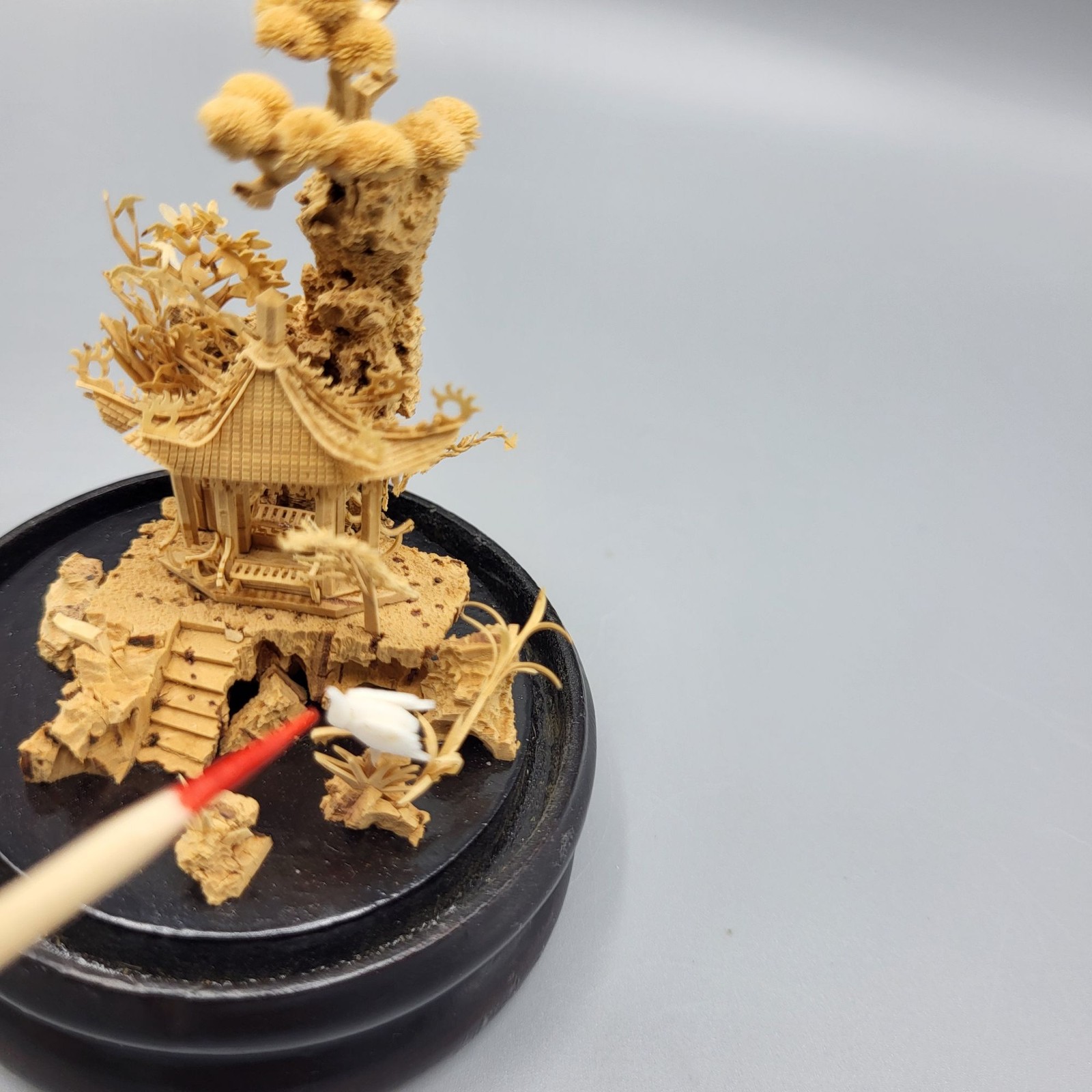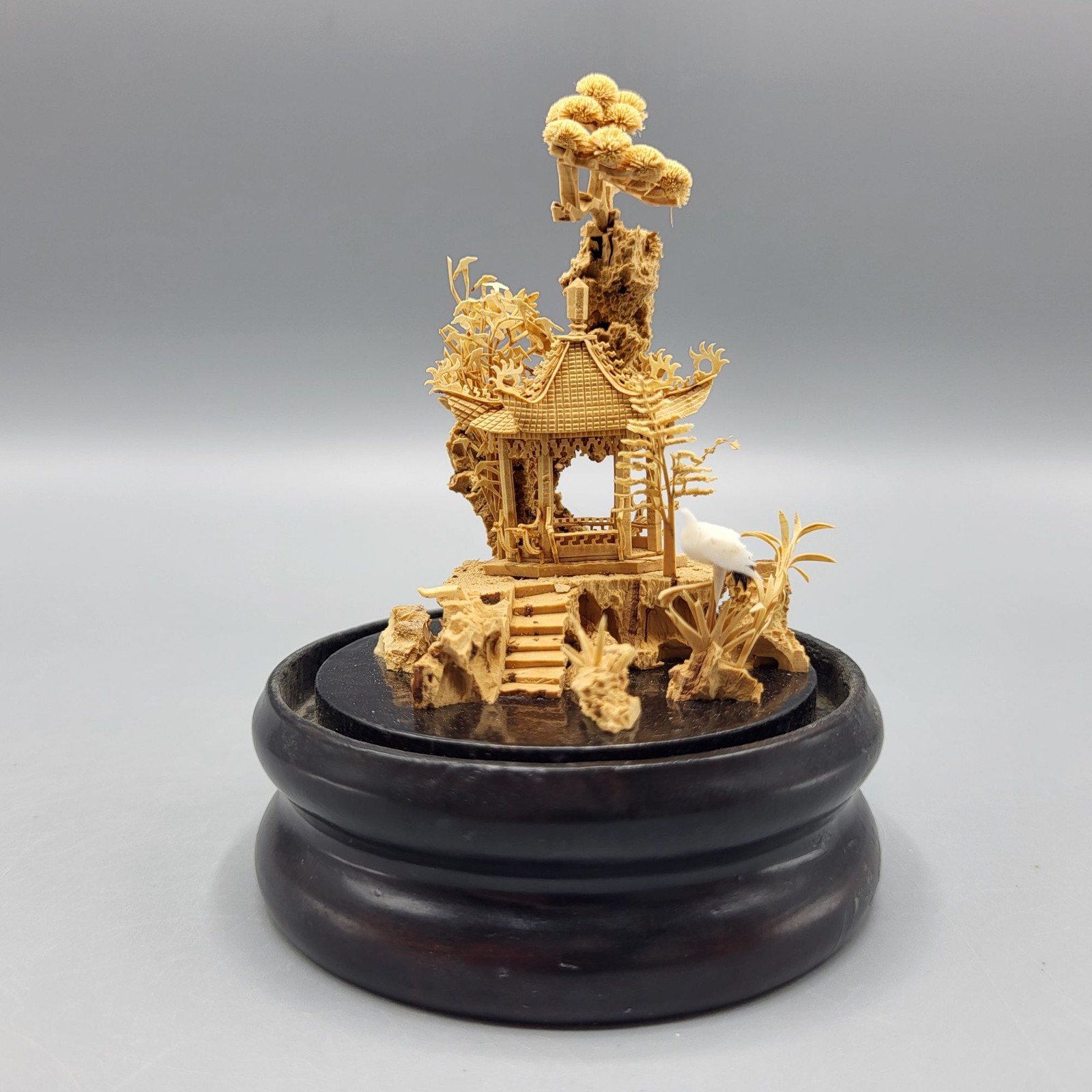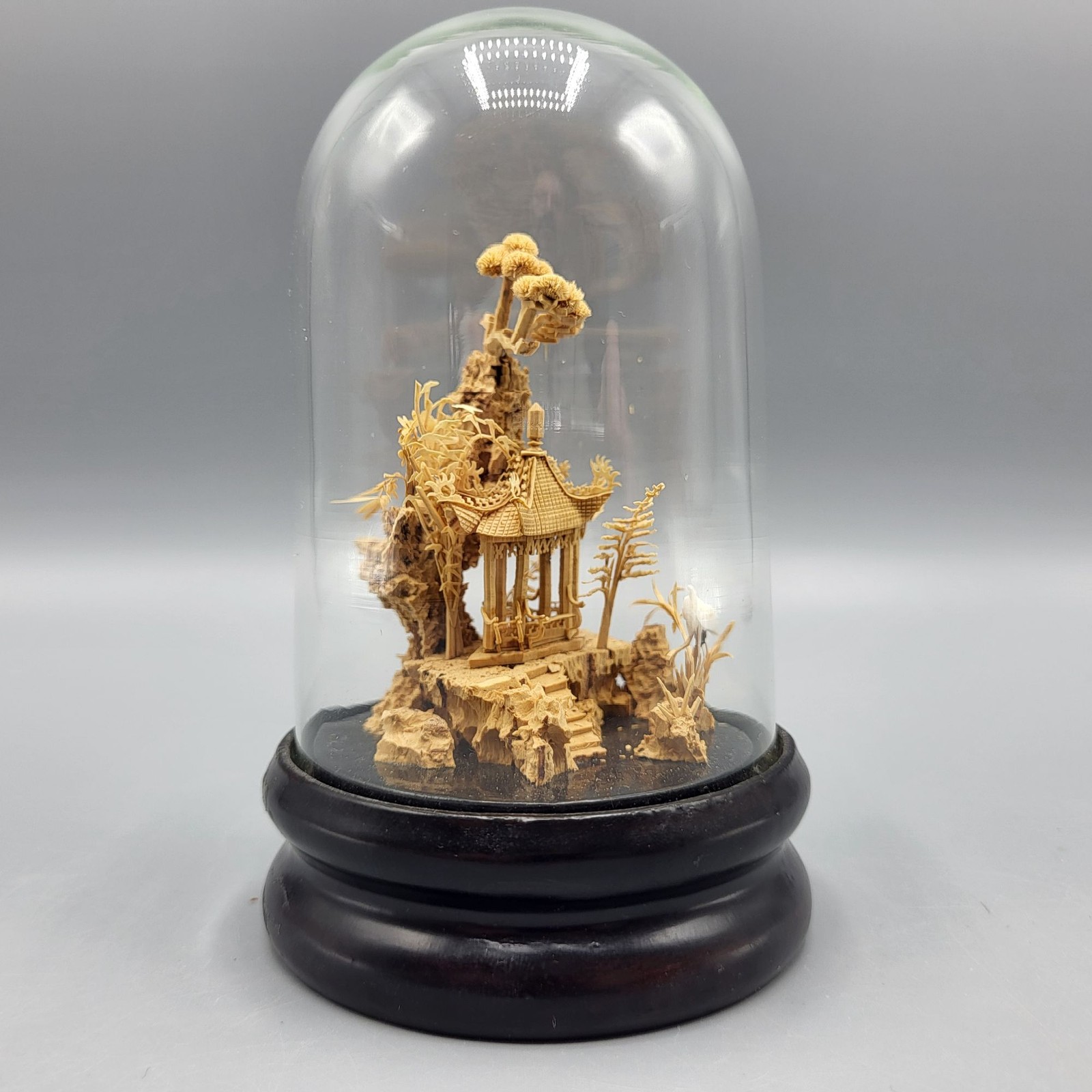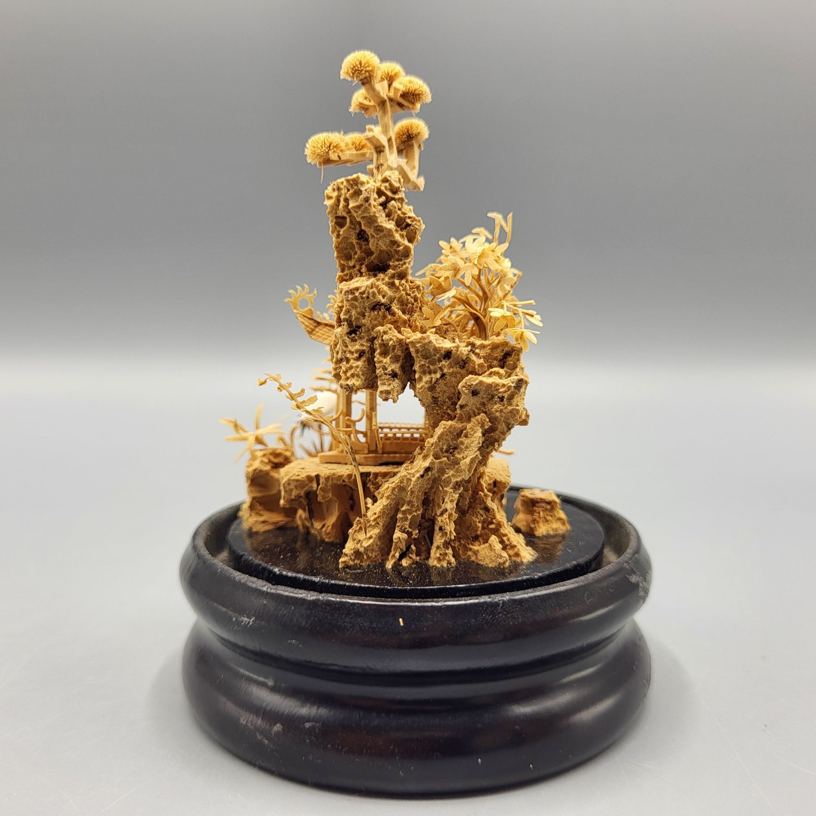 This vintage Chinese carved cork diorama under a glass dome features a dark wood base and makes a distinctive shelf decor collectible. Condition: pre-owned and in good condition overall with visible wear from age and light use; the crane figure is missing its head. The item is sold as pictured, so please review the listing photos for exact details on materials, size, and any other imperfections. Free shipping is included. Check the listing for details.