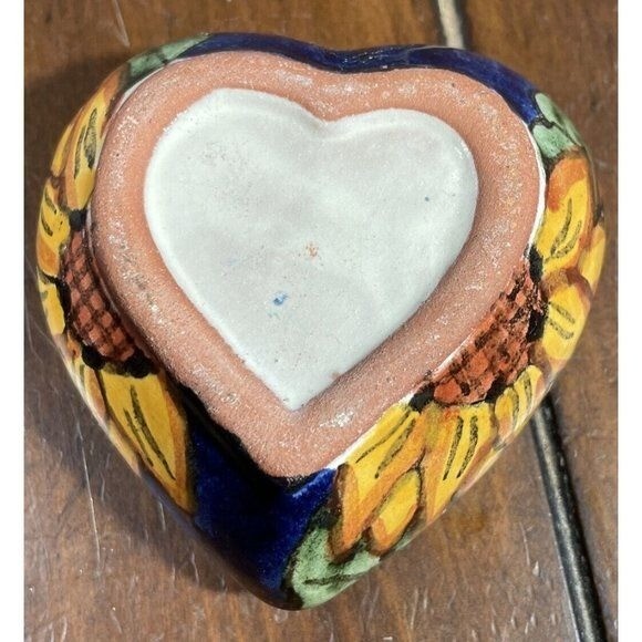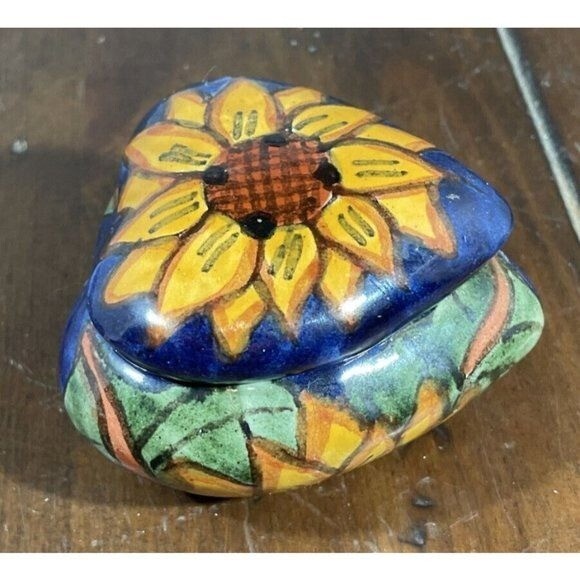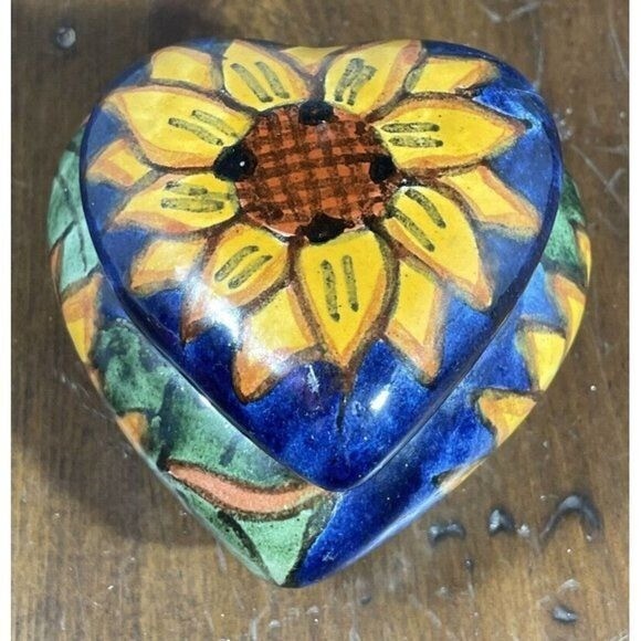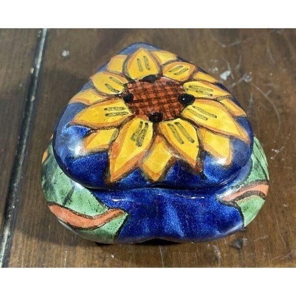 This used Mexican Talavera pottery heart-shaped trinket box dish features a sunflower-style design and works well for holding small jewelry or keepsakes. It fits in Collectibles and can be displayed on a dresser, vanity, or shelf for a colorful folk-art accent. Condition is listed as used; check the listing for details on any wear, marks, or size. Free shipping is included, and the item will be sent as described in the listing.