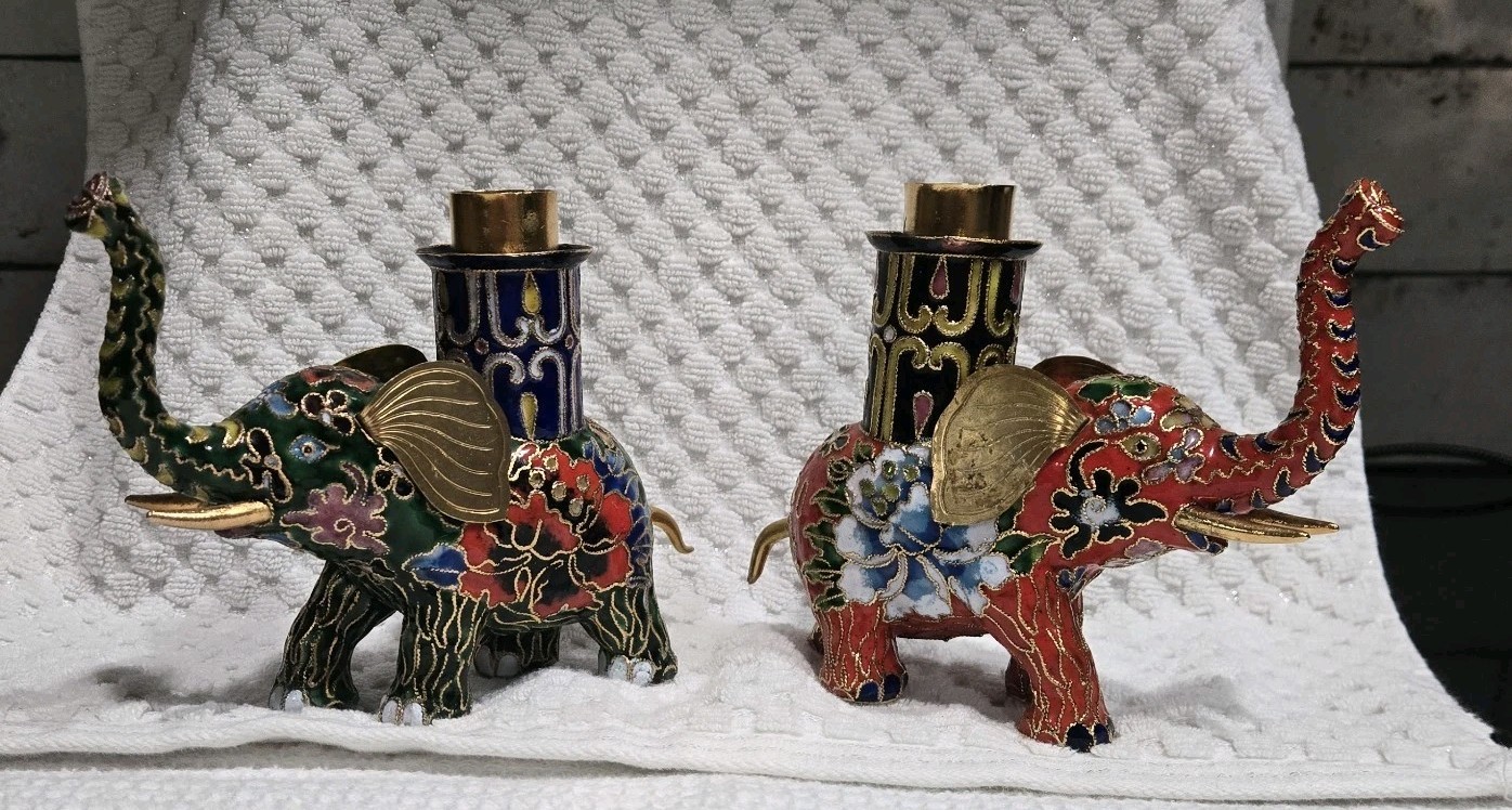 This set of 2 vintage cloisonné brass and enamel elephant candle holders is a collectible decorative accent for shelves, tables, or gift displays. The items are listed as used, so expect light wear consistent with age and prior use; check the listing for details on any specific marks or imperfections. Candle holder size is noted as approximately 4.5" x 5.5" each; check the listing for details on fit and candle type. Free shipping is included, and the set is sold together as pictured.