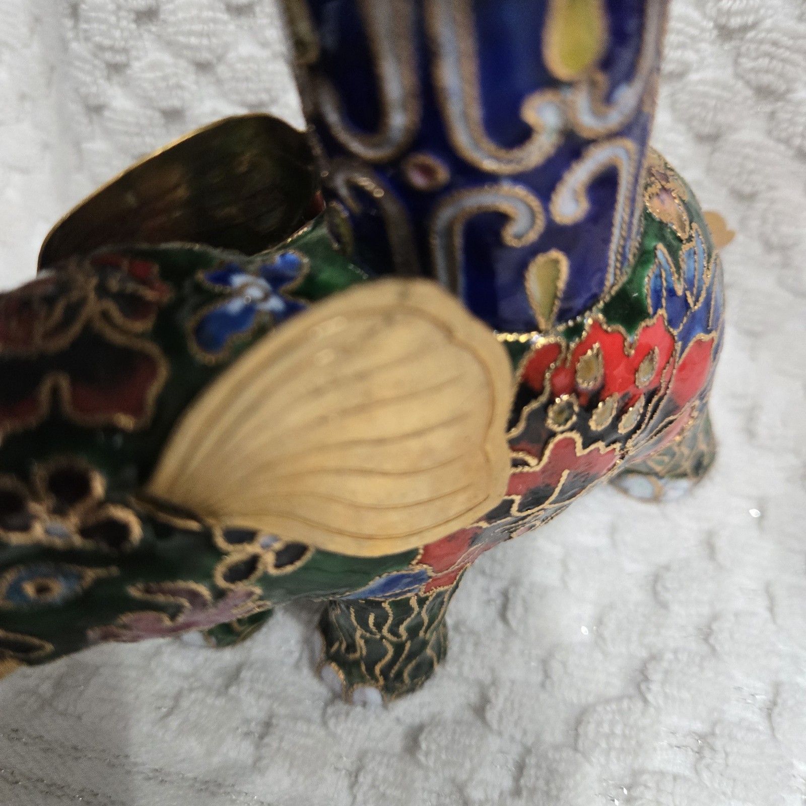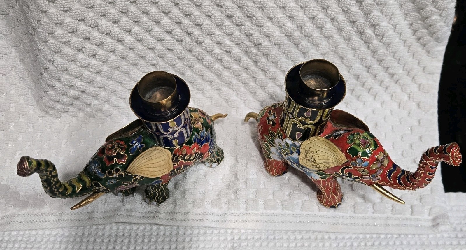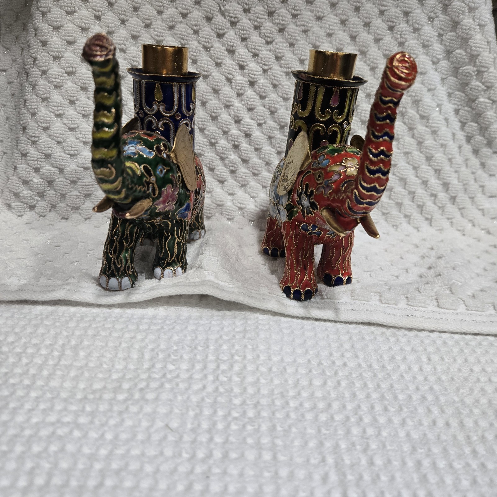 This set of 2 vintage cloisonnne brass and enamel elephant candle holders hails from China, showcasing traditional Chinese craftsmanship. With intricate designs and a cultural significance, these candle holders are a unique addition to any collection. Standing at 4.5"x5.5", they are a charming representation of Asian culture and history. Perfect for collectors or those looking to add a touch of elegance to their home decor. Used. Some tarnish on the ears.