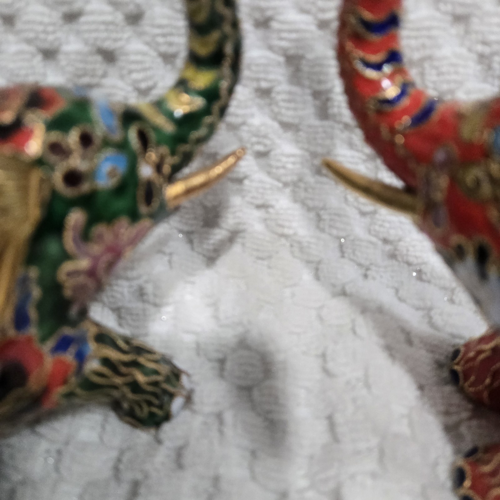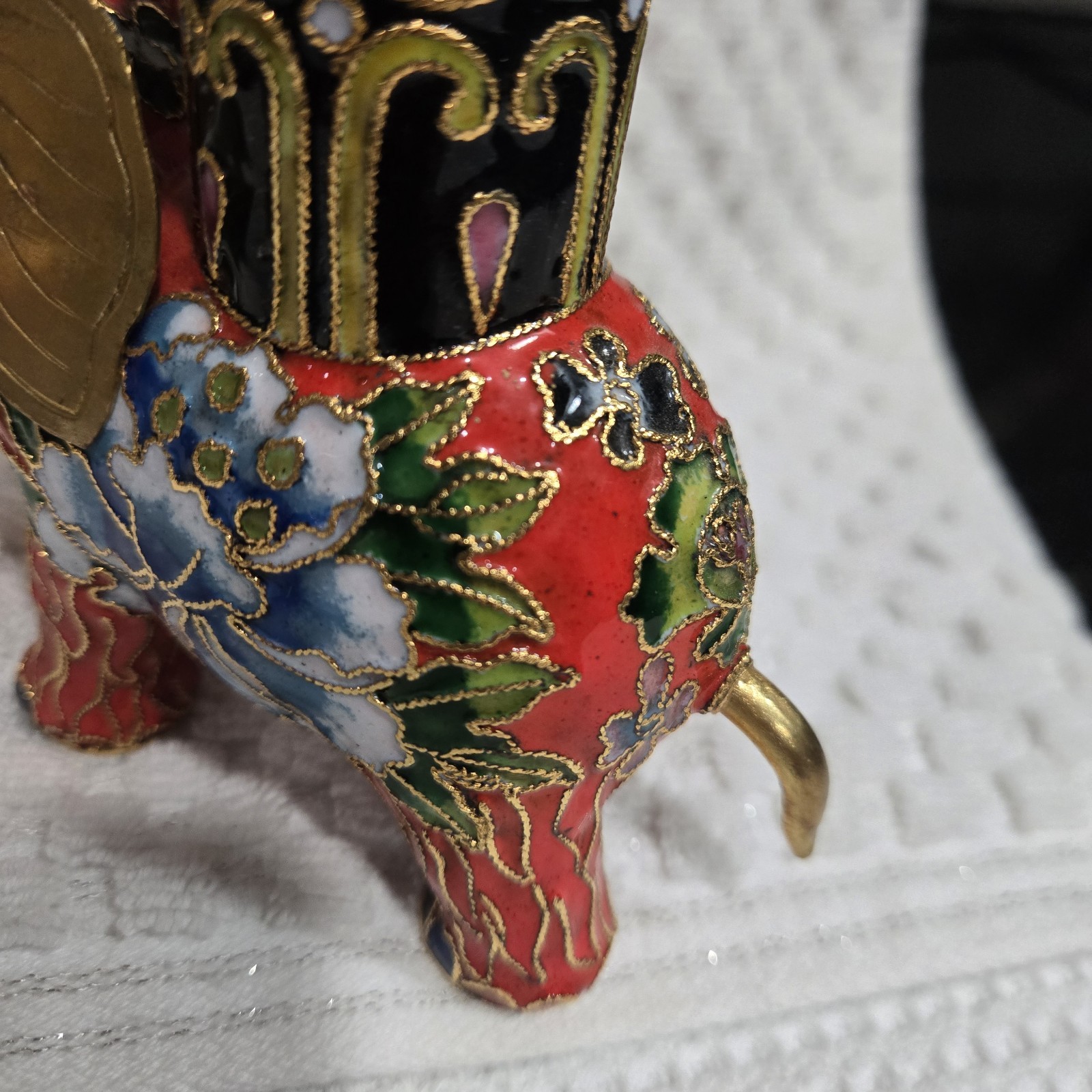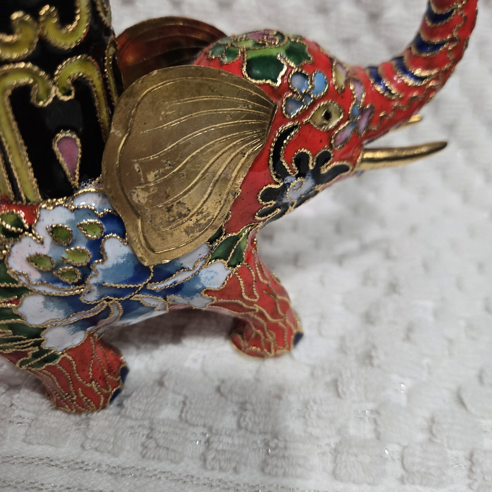 This set of 2 vintage cloisonnne brass and enamel elephant candle holders hails from China, showcasing traditional Chinese craftsmanship. With intricate designs and a cultural significance, these candle holders are a unique addition to any collection. Standing at 4.5"x5.5", they are a charming representation of Asian culture and history. Perfect for collectors or those looking to add a touch of elegance to their home decor. Used. Some tarnish on the ears.