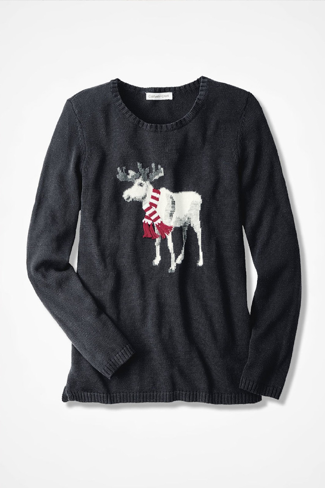 Product DescriptionEnjoying a warm welcome, the handsome fellow on this mid-weight sweater evokes a festive air in his red-and-white scarf with real tassel fringe. Sizing & Fit Misses 26" long; Petites 24"; Women's 28" Hits low hip Relaxed fit Long SleevesFabric & Care Cotton/acrylic Ribbed trim Machine wash Imported