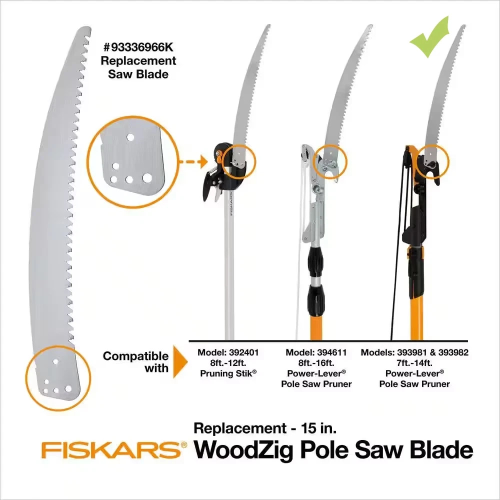 14 Foot Power-Lever Extendable Pole Saw with 15-inch blade and 1-1/8 inch capacity Pruner by FISKARSA Combination Tree and Tall Scrub Lopper, Pruner and Branch SawAVAILABLE FOR LOCAL PICK-UP ONLY - LOCATED IN BALTIMORE, MARYLANDReach high branches easily with the Power-Lever Extendable Pole Saw and Pruner, offering two cutting options and extending up to 14 ft. Its exclusive Power-Lever design boosts leverage for greater cutting force. The oval-shaped poles are lightweight yet durable, minimizing flex, helping you guide the cut, and matching the natural grip of your hand. A double locking mechanism keeps the pole securely extended for improved control. The sharp, long-lasting steel pruner—treated with a low-friction coating—cuts smoothly, resists gumming, and offers better rust protection for branches up to 1-1/8 in. For larger limbs, rely on the robust 15 in. WoodZig saw.The saw’s triple-ground teeth slice efficiently through both green and dry wood, while its bi-directional cutting pattern reduces binding and sawing fatigue. A comfortable, non-slip grip and balanced head make long jobs less tiring, and the included blade cover protects the teeth in storage and transport.Designed for backyard pros and weekend warriors alike, this pole saw disassembles for compact storage and is compatible with standard extension poles if you need even more reach. Maintenance is simple: a quick sharpening keeps the saw at peak performance, and an occasional drop of oil on the pruner pivot preserves smooth action.Safety features include a bright-orange end cap for visibility, a tether hole for securing the tool when working at height, and rounded edges on the handle to reduce snagging on clothing. Backed by a limited warranty and built with replaceable parts, the Power-Lever Extendable Pole Saw and Pruner is a durable, no-nonsense choice for keeping trees tidy without calling in the professionals.HighlightsPower-lever technology maximizes leverage for more cutting powerIncludes 1 fully hardened, precision-ground steel pruner and 1 sturdy 15 in. wood zig sawOval-shaped pole greatly reduces flex, allows you to control the direction of the cut and fits the natural shape of your hand for improved comfortPruner cuts branches up to 1-1/8 in. thick and features a low-friction coating for smooth cuts, reduced gumming and enhanced rust resistanceLength: 7 ft. to 14 ft.DetailsBlade MaterialSteelFeaturesBypass Blade, Corrosion Resistant, Replaceable Head, Saw Attachment, SerratedGarden Tool Handle StyleConvertible, Ergonomic, Long HandleHandle MaterialFiberglassMaximum Cutting Thickness (in.)1.125 inPower TypeManualDimensionsBlade Length (in.)1.25 inHandle Length (in.)156 inProduct Width (in.)8.0 in