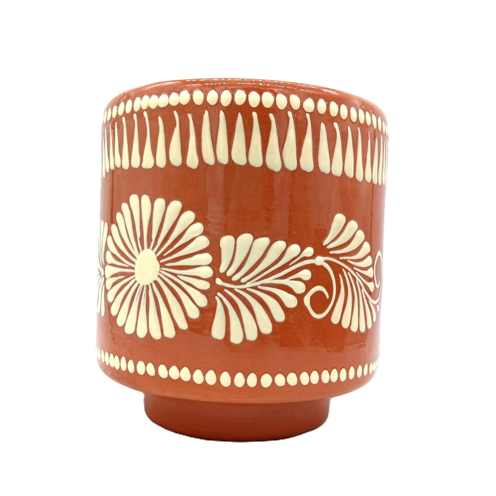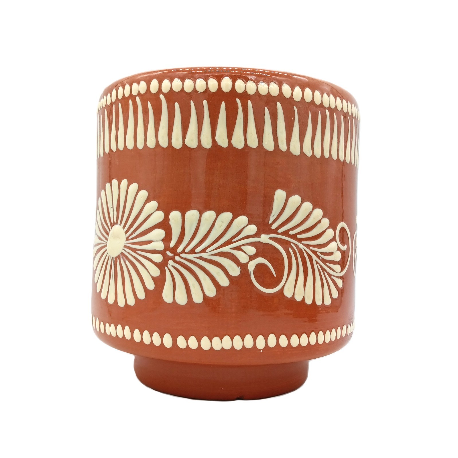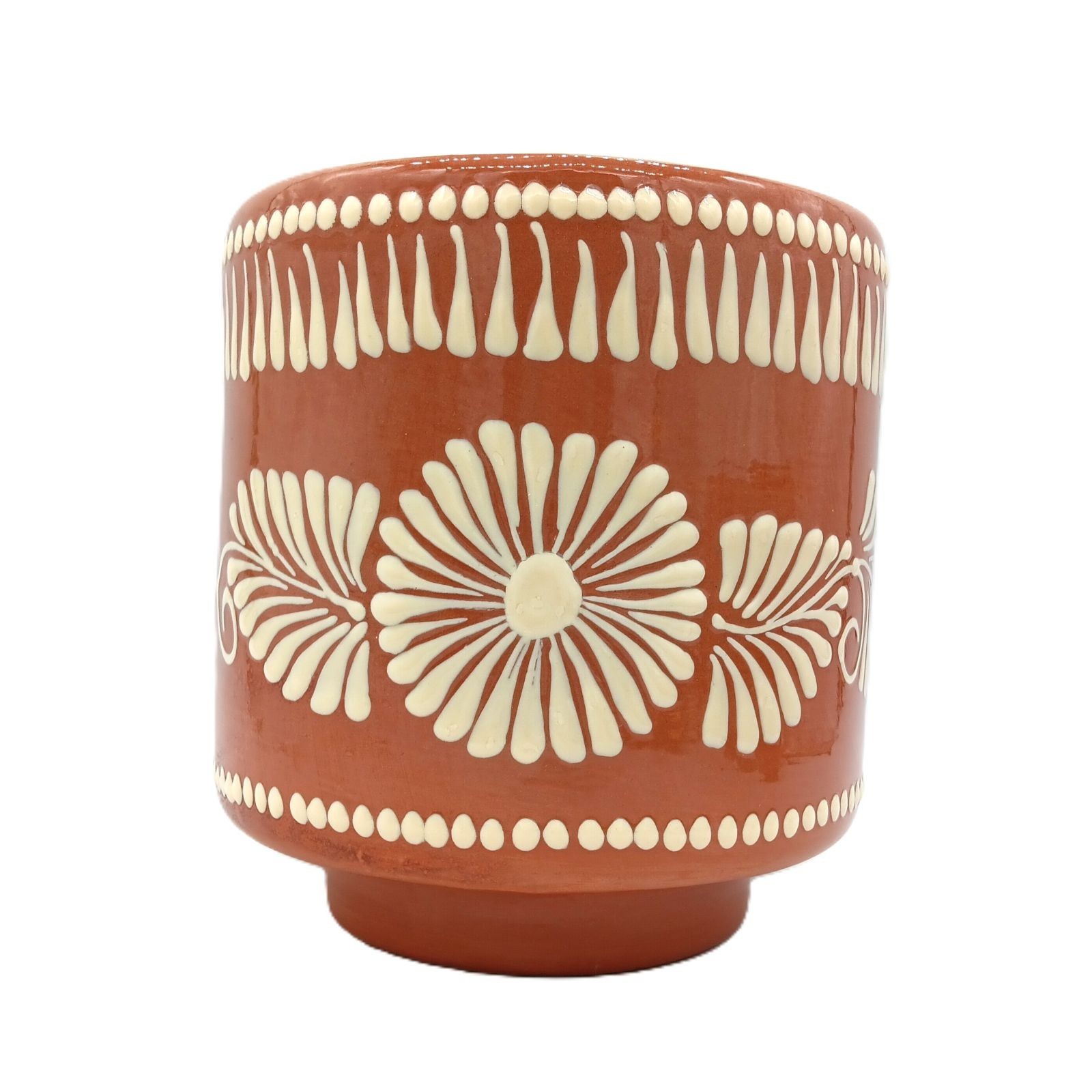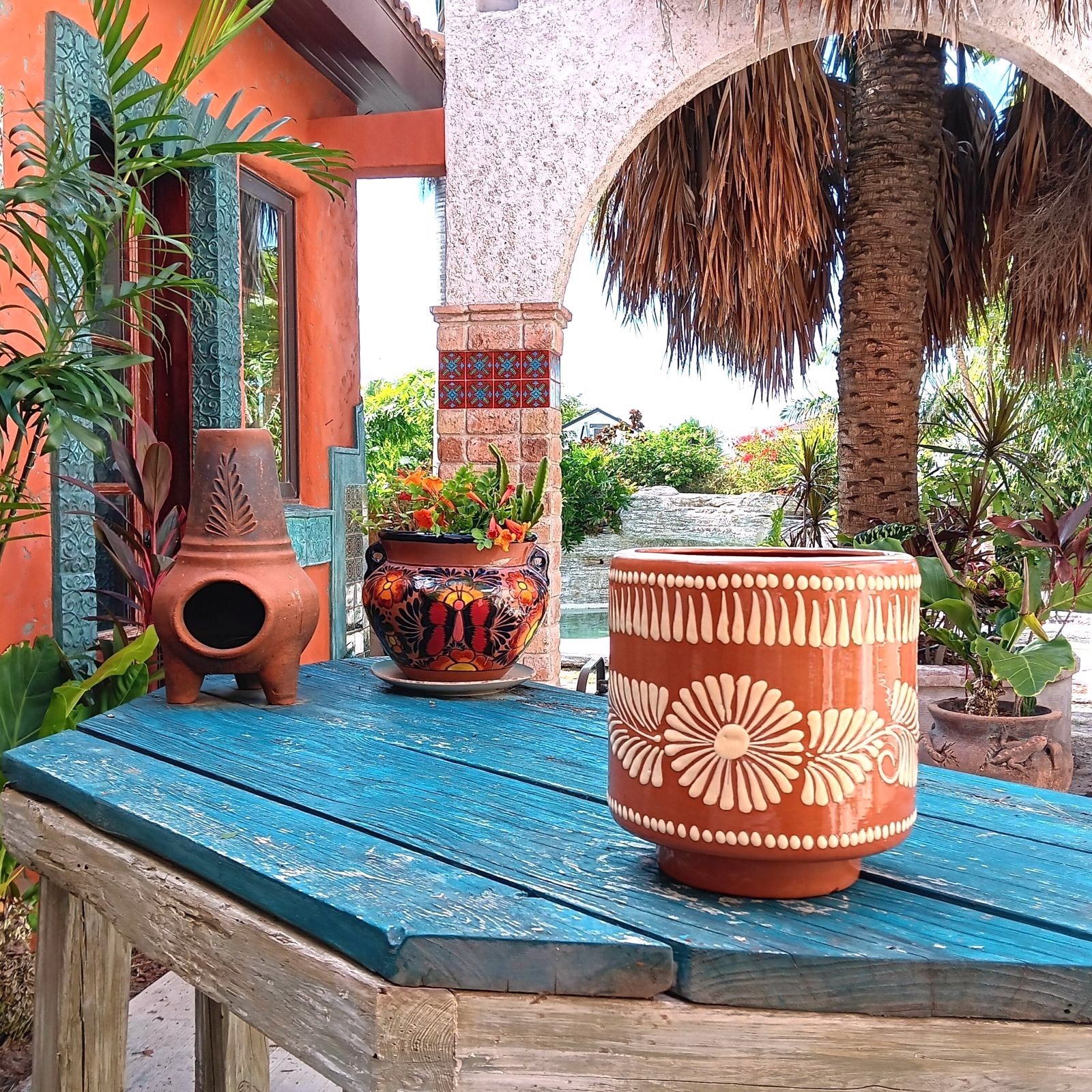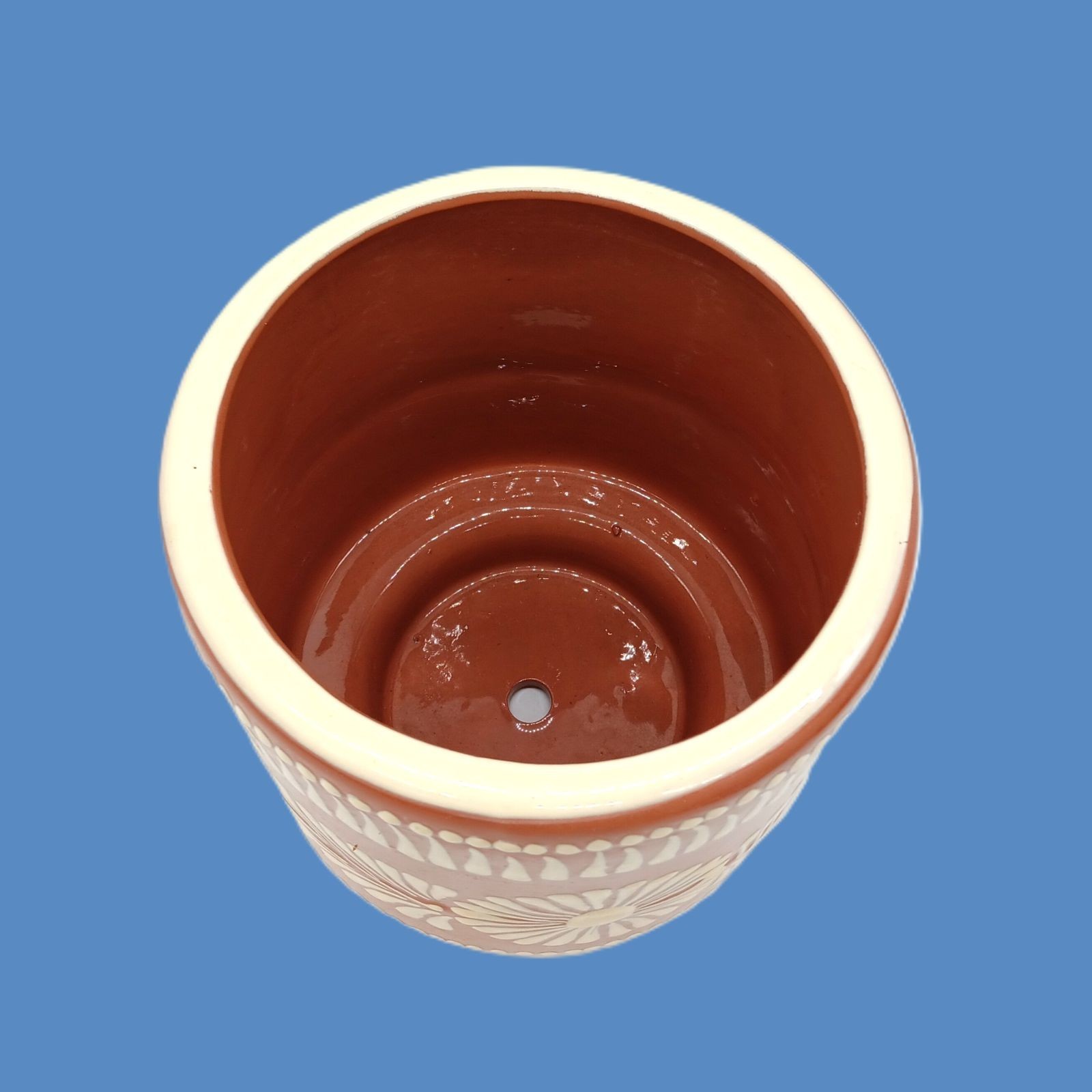 This is a lovely natural style pottery planterHandmade in Mexico by a quality pottery producerMade in the engobe clay / ceramic / talavera barro styleIntricate hand-painted detail in a cream