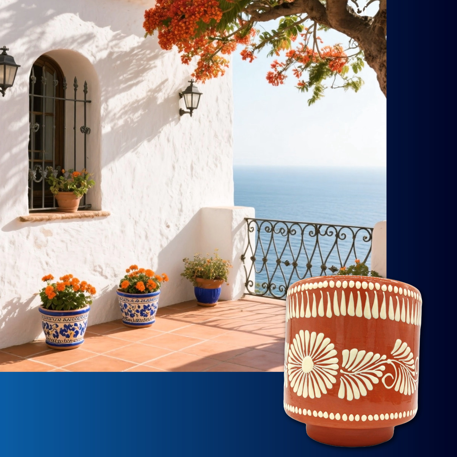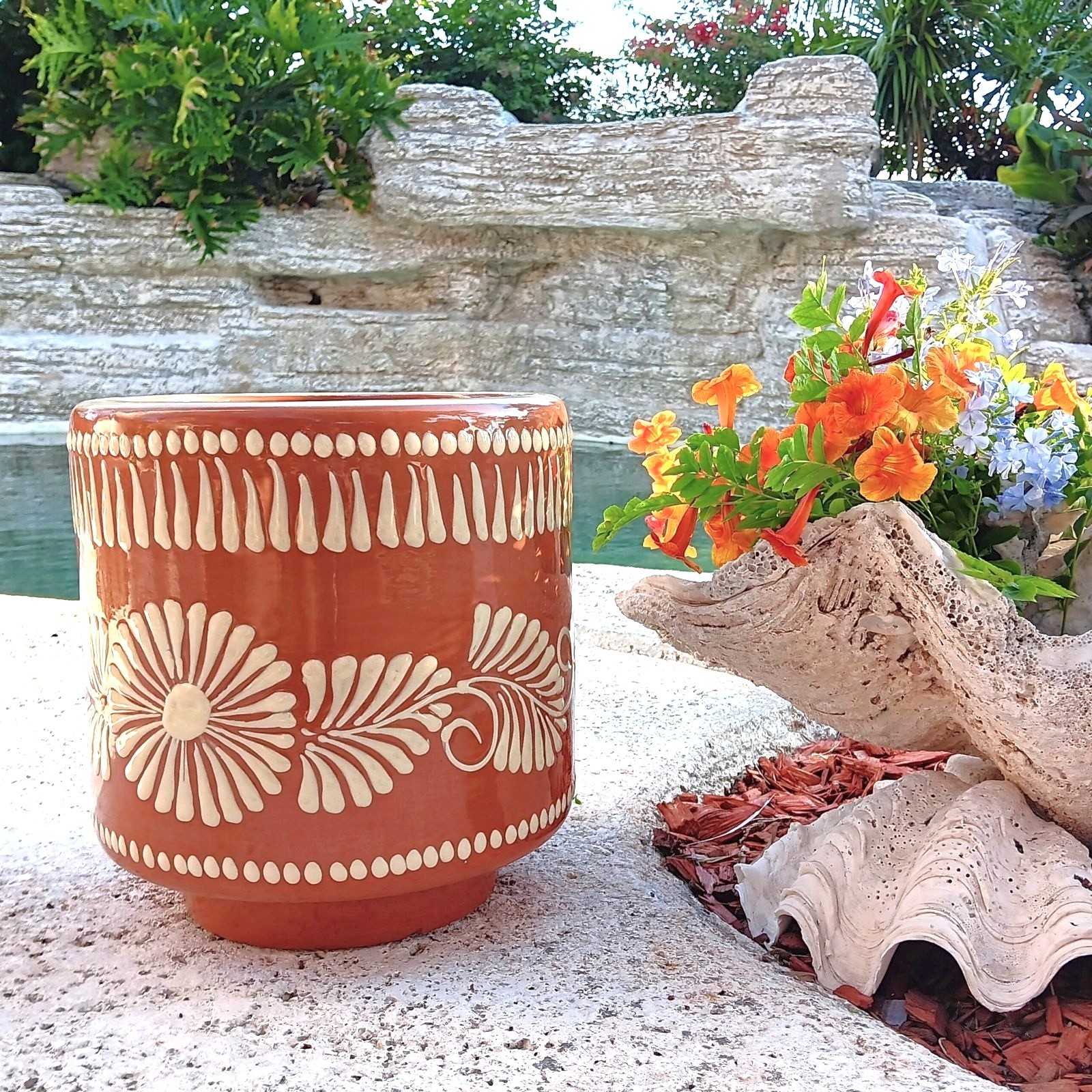 color floral and scroll pattern on terracottaThick, heavy and strong fired with a hole to drain10.5" tall by 10" wideCapacity 3 gallonsA unique, collectible flower pot for your rustic, natural, minimalist or Mediterranean styleWe have several rustic planters and kitchen pieces in our eBay store, including more in the talavera barro style. Click here to viewTechnique: Engobe pottery consists of a slurry clay base poured into thick molds, then coated with a slip of finely ground natural clays colored with pigments and oxides from the mountains of central Mexico, then fired and hand painted with detailed, beaded relief artwork, then fired again to impart a durable sealed ceramic finish