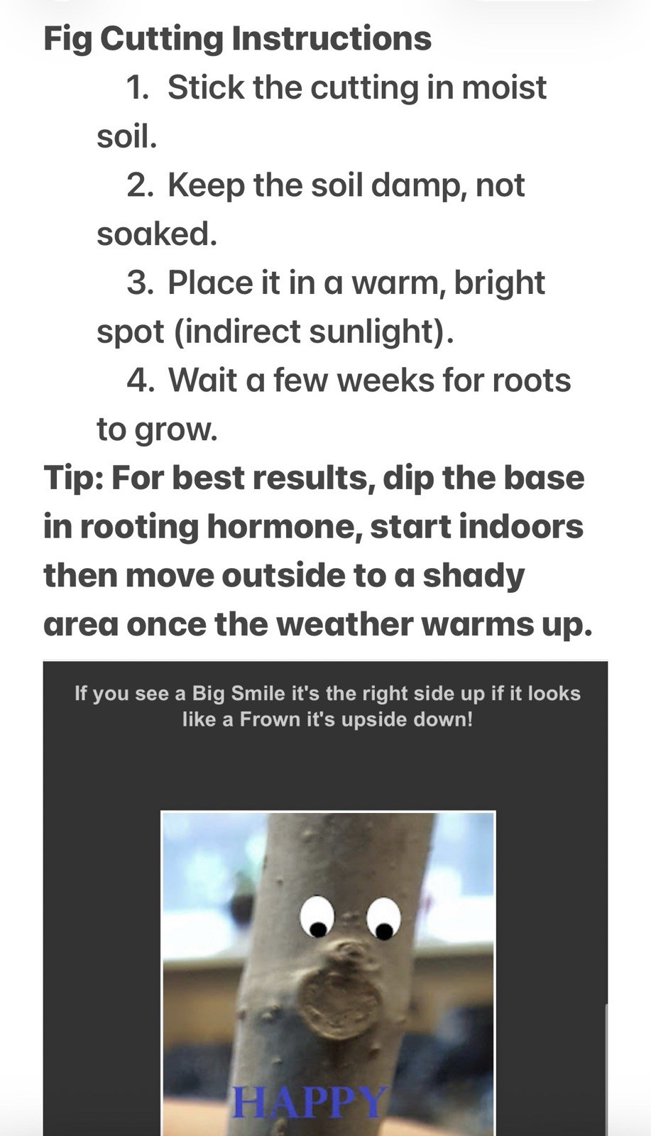 Shop fig tree cuttings and choose the variety that fits your garden plans. This listing is in the Home & Garden category and is priced at $4.99 with free shipping. The item condition is not provided, so check the listing for details. You will receive plant cuttings intended for propagation; availability may vary by variety. Review the listing for what is included, expected quantity, and any care or rooting notes from the seller. If you have questions about the specific variety or how it will ship, check the listing for details.