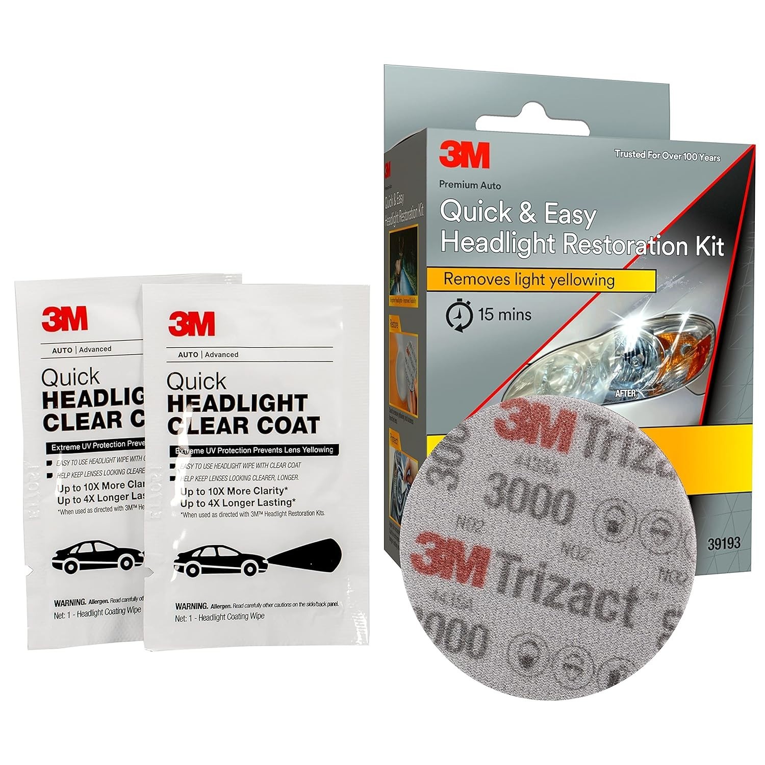 About this itemKIT INCLUDES: 3M Trizact Refining Disc 3000 grit (2) 3M Quick Headlight Clear Coat WipesFor use on plastic lenses – headlights, taillights, fog lights, directional lights and more3M abrasive technology removes yellowing and buildup without damaging plastic lens surfaceEasy to use – choose a kit with no tools required, or for use with a common household drillSave hundreds vs. replacing headlight lenses