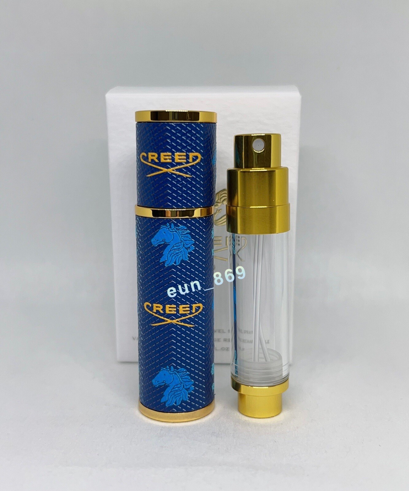 This Creed blue and gold leather refillable travel spray atomizer is a compact 5ml (0.16oz) accessory for carrying fragrance on the go. Condition is New and listed as NIB. Free Shipping is included. Check the listing for details on what is included, compatibility, and any packaging specifics. This item is categorized under Collectibles and may be suitable for display, gifting, or completing a Creed accessory set.