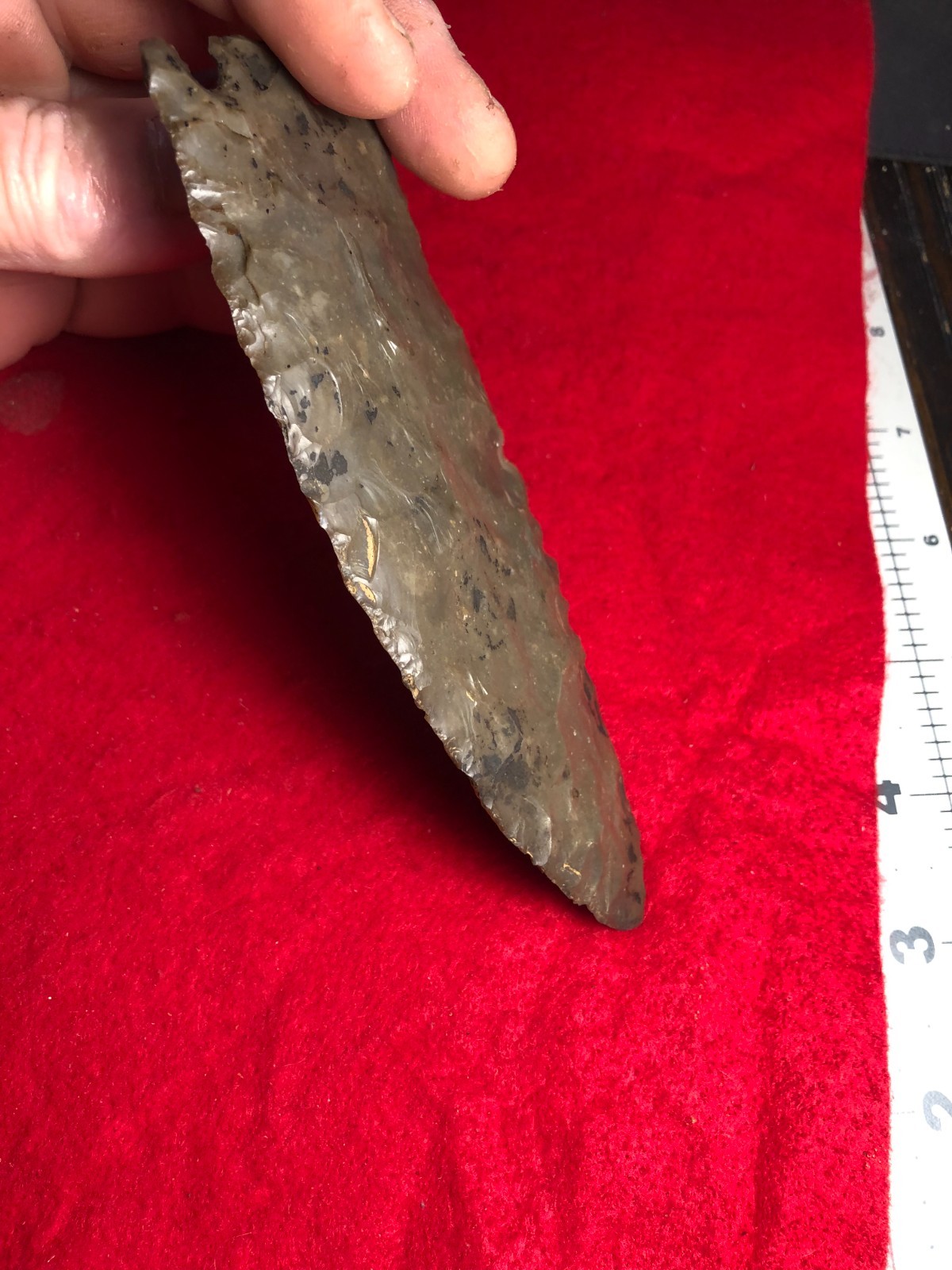 The Point to be Taken here is ... DON'T LET THIS ONE GET AWAY!!➡ Very Fine Texas Base Tang Knife Point➡From an old Ar. Collection. ➡ Made Of Georgetown with Patina. Nice Material➡ Measures in at 5-7/8" x 2" ➡ Its type is from the Woodland Era.As you can see, I have very good pictures from different angles so that you can zoom in on the patina, use-wear, flake pattern etc. If you have any questions please feel free to ask. Then bid according to your personal knowledge, experience and personal criteria. Here on eBay, you will find many sellers offering G10's after G10's every week of the same type and every style. Don't be fooled by a piece of paper. You are the one making the investment so..."KNOW WHAT YOU ARE BUYING BASED ON WHAT YOU KNOW" eBay community should be a format for collectors of all levels to feel confident enough to buy what they want and realize the value of communication and friendships. Educate yourself, study, learn and grow as a collector. Then find a seller who is honest enough to offer an item for exactly what it is, either Real or a Representation. **PLEASE WAIT TO PAY UNTIL YOU ARE FINISHED BIDDING!** ***PLEASE FOLLOW & CHECK OUT MY OTHER LISTINGS!Daily Auctions to Buy it Now listings! Also at the end of each month I will be offering a "out with the old and in with the new inventory sale" it will be as a special promotion campaign!*****If you would like to buy multiple items I am happy to combine shipping. Buyer Satisfaction is a must. If this relic doesn't meet your standards upon receiving simply return for a full refund**Thank You!......WHEN YOU CANT FIND EM IN THE FIELD, FIND EM IN YOUR MAILBOX!**Keep Watching For New Relics Every Week!**