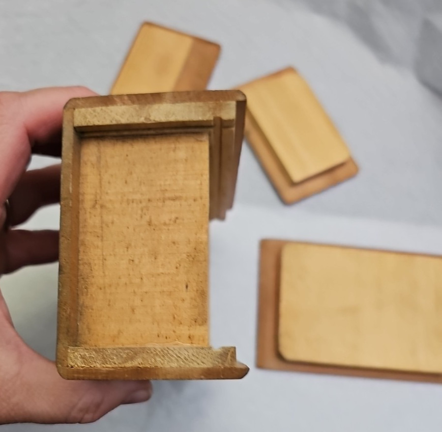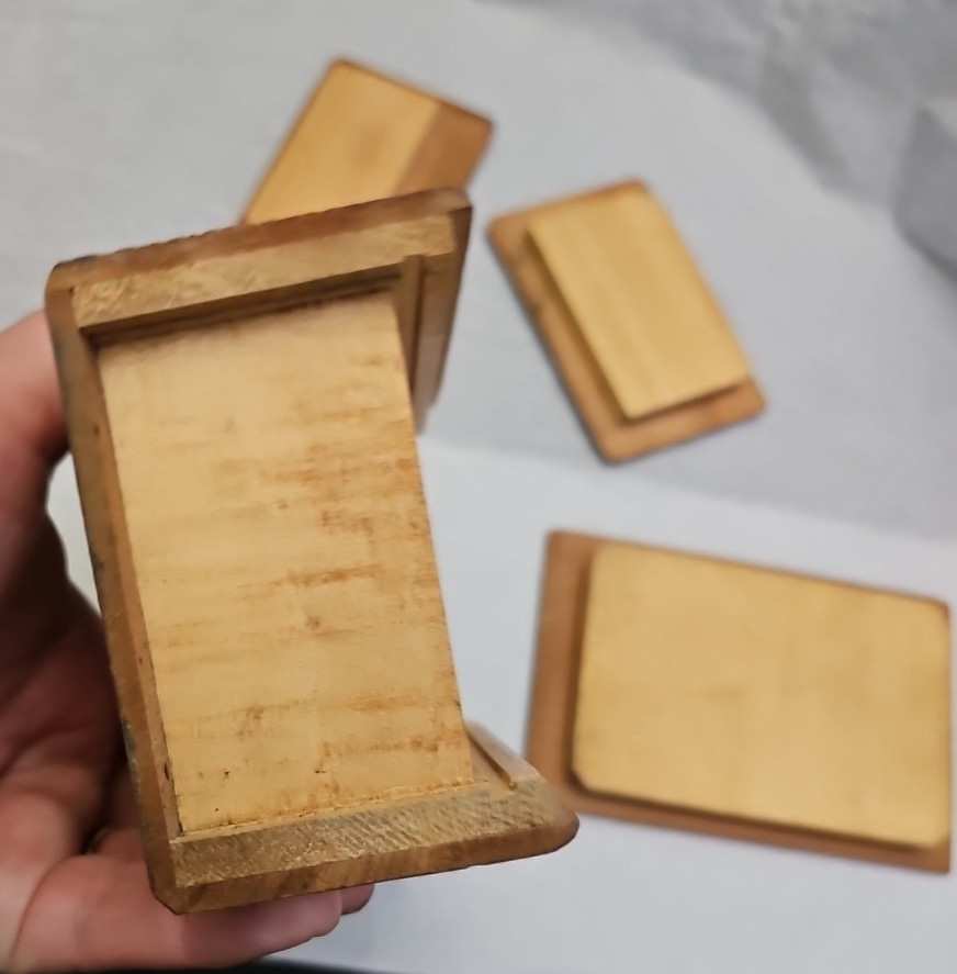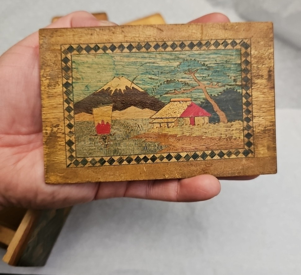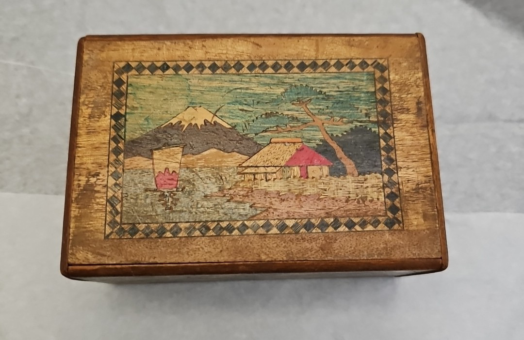 You are bidding on a Vintage Japanese Inlaid Wood Puzzle Box Mt. Fuji Scene Marquetry Japan 1950s. This item is preowned in good condition and does show signs of wear on the sides. This item does need some cleaning and proper oil care. There are a few lifted areas on the edges. This is a great puzzle box if you are a collector. The measurements of this item are 4 3/2L 3W,2"H. Please feel free to ask questions before bidding. Please use pictures as part of the description for this item. All bids are final thankyou and happy bidding.