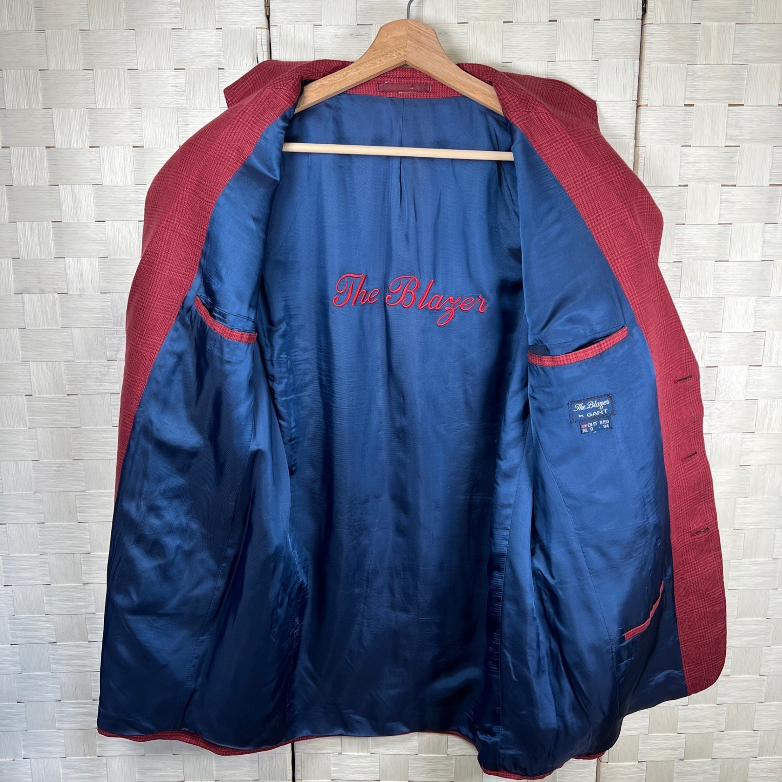 A men's GANT "The Blazer" sport coat in a striking red plaid pattern. This jacket features a classic notched lapel, three-button front closure, and decorative button cuffs. The interior is lined with a smooth navy blue fabric embroidered with "The Blazer" in red script. Two flap pockets are situated on the front, and a welt pocket is found on the left chest.Pre-owned but in excellent condition See photos for measurements (Please compare the measurements to something similar you already own.)All items stored in a smoke free homeHave questions before you buy? Just ask! We're happy to help!Happy virtual thrifting!Keywords: GANT blazer, sport coat, plaid jacket, linen blend, menswear, tailored, smart casual, business casual, preppy, sophisticated, fall fashion, spring fashion, classic style, designer, luxury, old money, party jacket, beach wedding, wedding guest