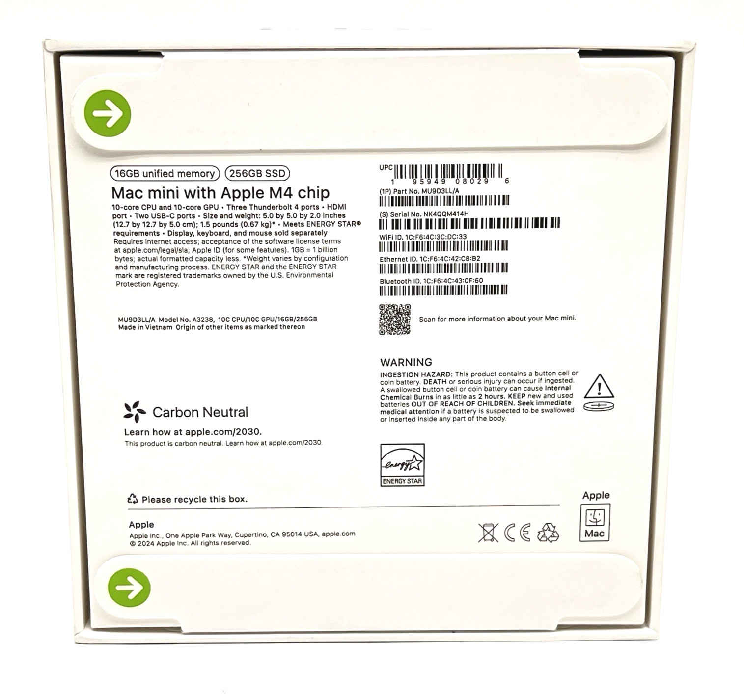 Apple M4 processor with 10 cores at 4.4 GHz (4 performance cores and 6 efficiency cores) 16 GB integrated unified RAM (not upgradeable) 256 GB integrated unified flash storage Integrated 10-core GPU Wi-Fi 6E (802.11ax), Bluetooth 5.3, two front USB-C ports (up to 10 Gb/s), and a 3.5 mm headphone jack Three Thunderbolt 4 (USB-C up to 40 Gb/s), HDMI 2.1, and Gigabit Ethernet on the back Dual-monitor support Compact size, all-aluminum unibody design Factory erased and restored, running macOS 15.7.2