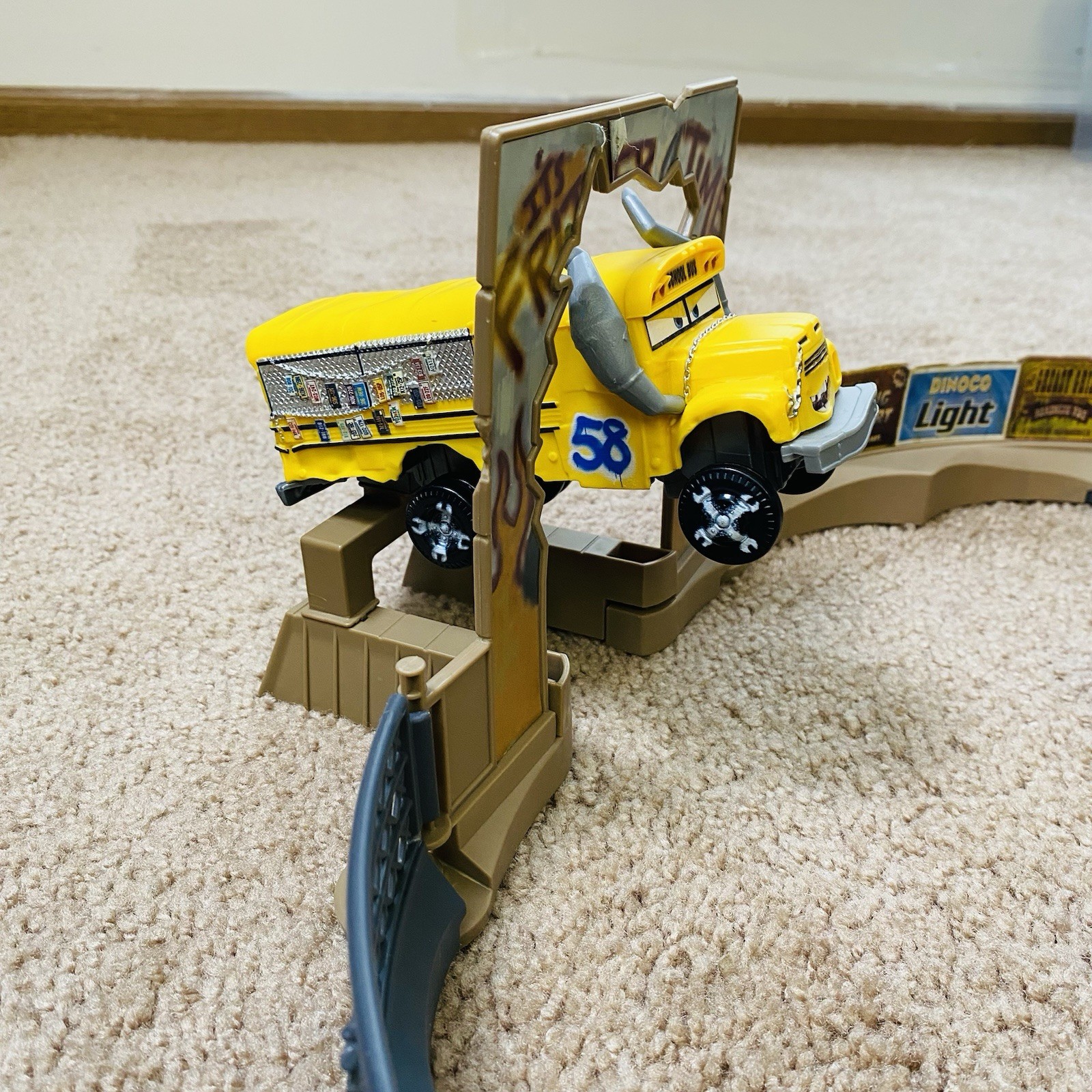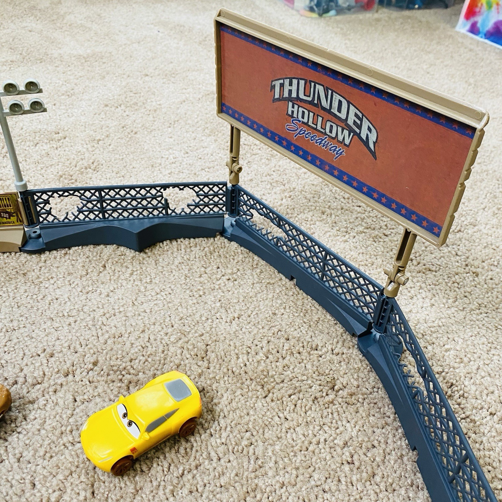 Preowned condition almost complete place it. It is missing one of the track fences the brown collar on the left side of Miss Fritz signed entrance. It comes with two vehicles which are original to the place it in Cruz Ramirez, which was sold separately. Please see all photos for details. Let me know if you have any other questions about this items.