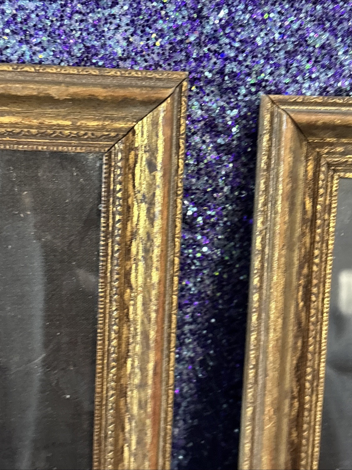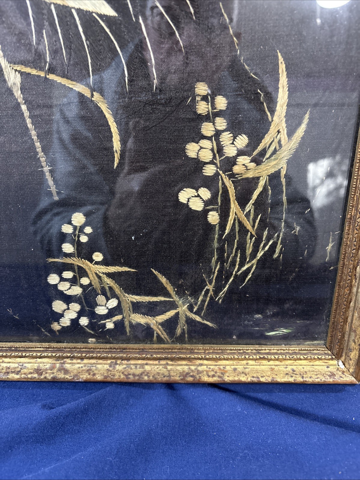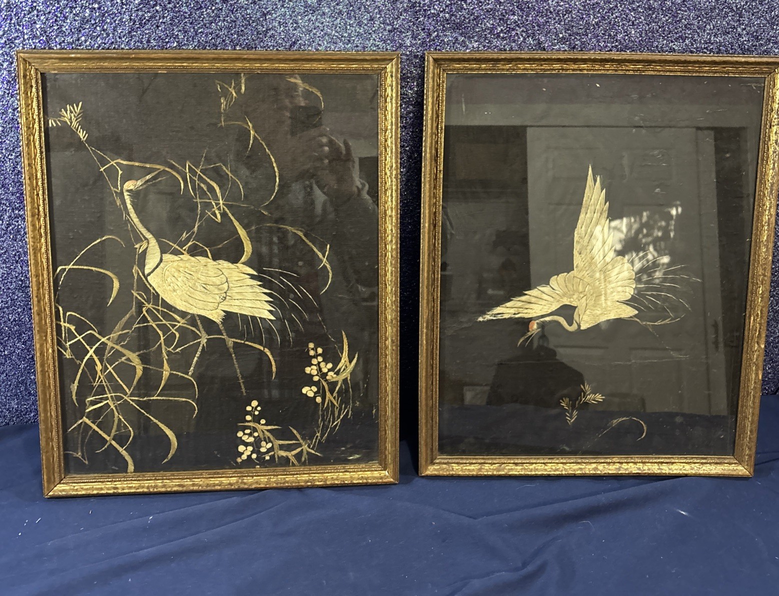 Antique pair of Chinese silk embroidered cranes. Judging by the ornate solid wood gold colored frames, we judge these birds to be 80 to 120 years old. Overall excellent condition for their age. Glass is intact. Original paper coverings over the back of the frames have done very well to keep them safe.Each framed crane measures 17 1/2 x 21 3/4.Non-standard