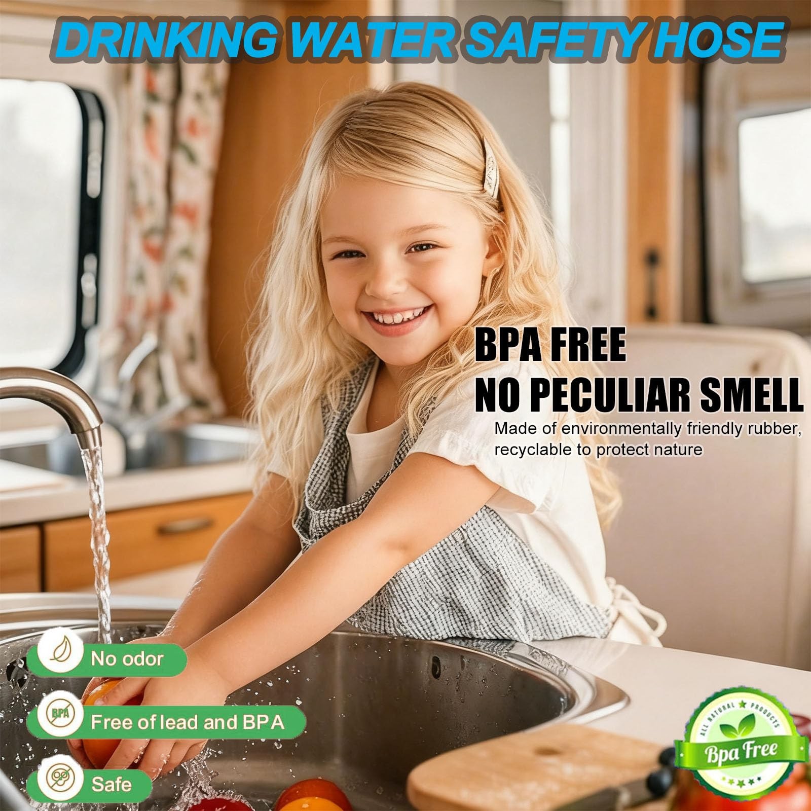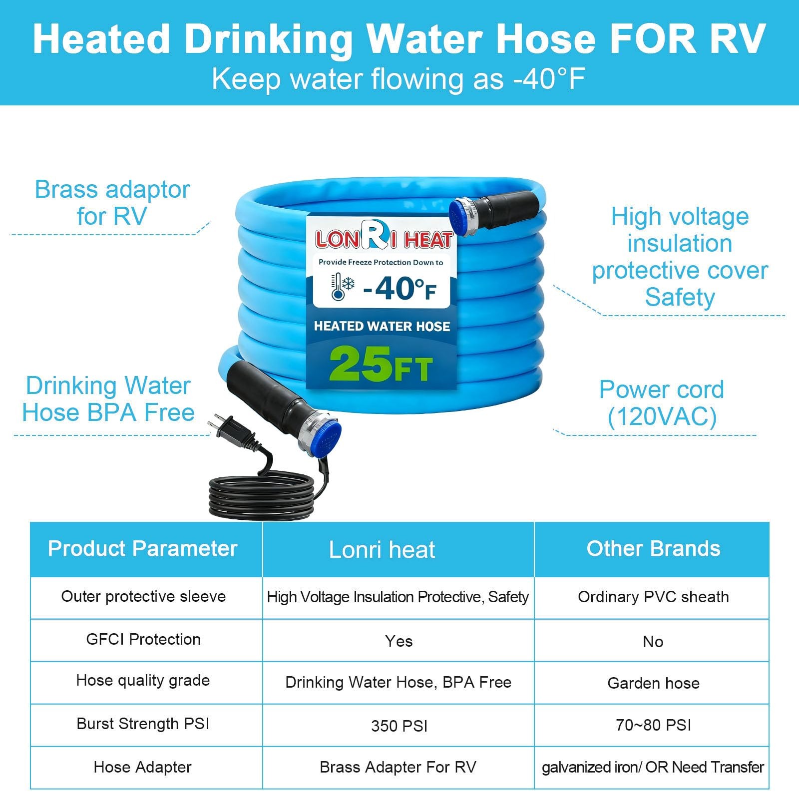Never Freeze Again: The Ultimate Heated Drinking Water Hose for Extreme Cold Keep Water Flowing Even at -45°F:Say goodbye to frozen hoses! Our heated water hose is engineered with an automatic temperature control system that activates when ambient temperatures drop below 37.4°F. It ensures continuous water flow even in extreme conditions as low as -45°F, making it ideal for RVs, farms, gardens, and outdoor use in winter. Safe for Drinking Water & Eco-Friendly:Made from lead-free and BPA-free materials, this hose is certified safe for drinking water. It has no odor and ensures clean water for drinking, cooking, washing, and bathing—perfect for RVs, camping, and household use. Smart Energy-Saving Thermostat:Equipped with an intelligent built-in thermostat, the hose automatically powers on when temperatures near freezing and shuts off when above 55.4°F. This not only protects the hose from damage but also conserves energy, giving you peace of mind and lower electricity costs. Durable, Explosion-Proof & Easy to Install:Constructed with a thick, wear-resistant PVC outer layer and hydraulic explosion-proof reinforcement, this hose is built to last. It features standard 3/4" GHT (Garden Hose Thread) brass connectors, making it compatible with most US faucets and RV inlets—no extra fittings needed. Safety First with GFCI Protection:Designed for safety, the hose must be plugged into a GFCI-protected outlet. The high-voltage insulation protective sleeve and UL-certified plug ensure safe operation in all conditions. Remember: always uncoil the hose before powering up to avoid overheating. Everything You Need:Includes 1x Heated Water Hose, 1x 3/4" GHT Adapter, 2x Thermal Insulation Cotton (at pipeline joint), 1x Teflon Tape, 1x Storage Bag. Setup is a breeze! Technical Specifications: Hose Type:Drinking Water Safe, Lead-Free & BPA-Free Max Pressure:350 PSI Temperature Range:Operational from -40°F to 55.4°F (Auto On/Off) Voltage:120VAC Connector:3/4" GHT Brass Adapter Outer Layer:High-voltage Insulation Protective PVC Certification:UL Certified Plug, GFCI Protection Required Warranty:2-Year Limited Warranty