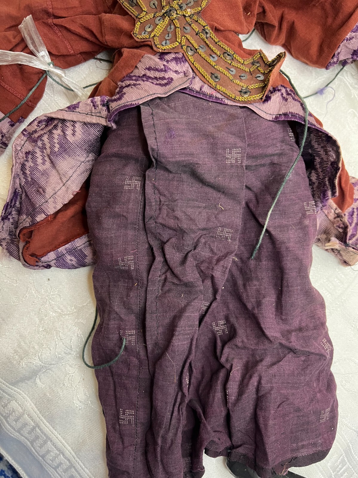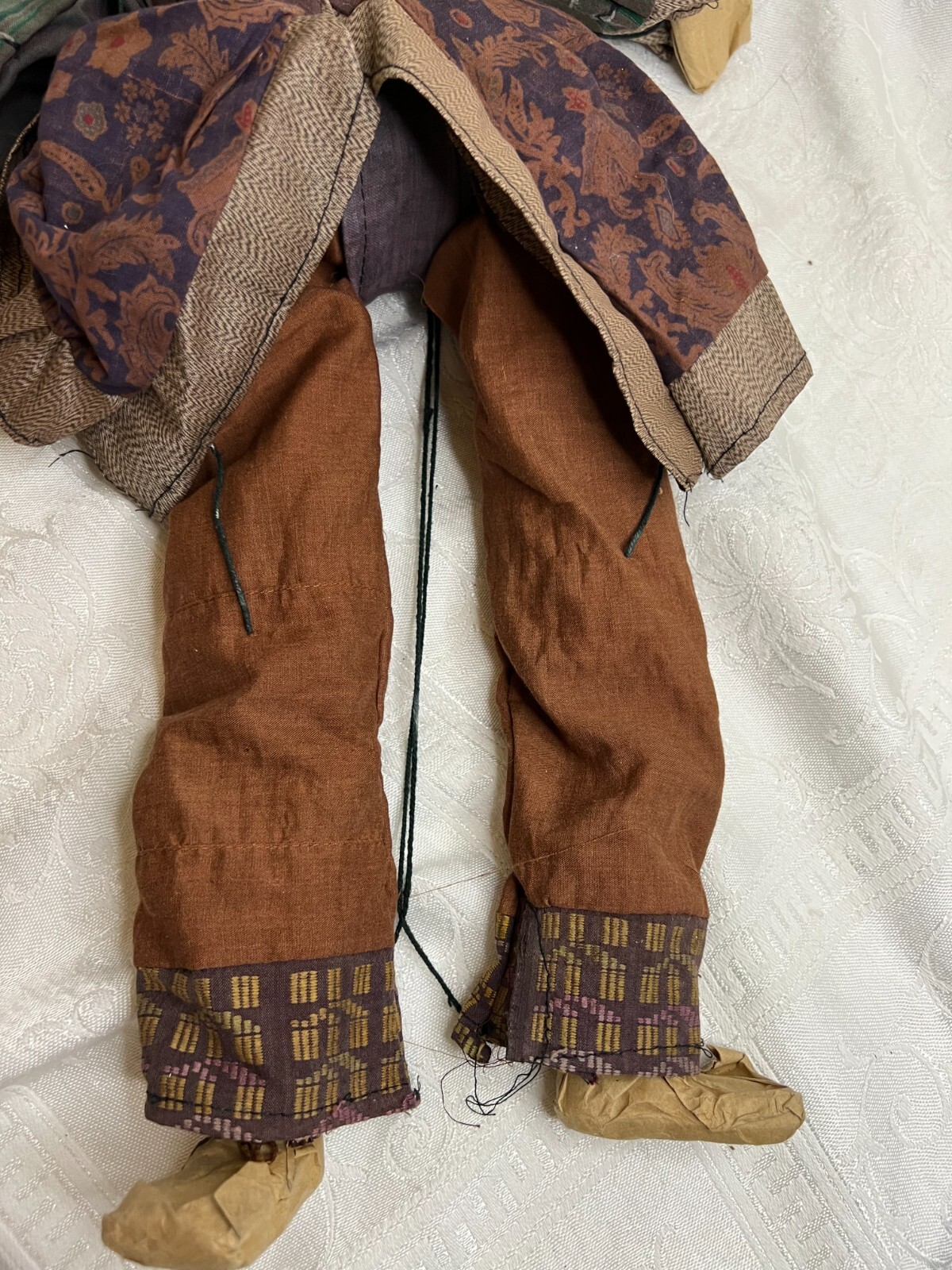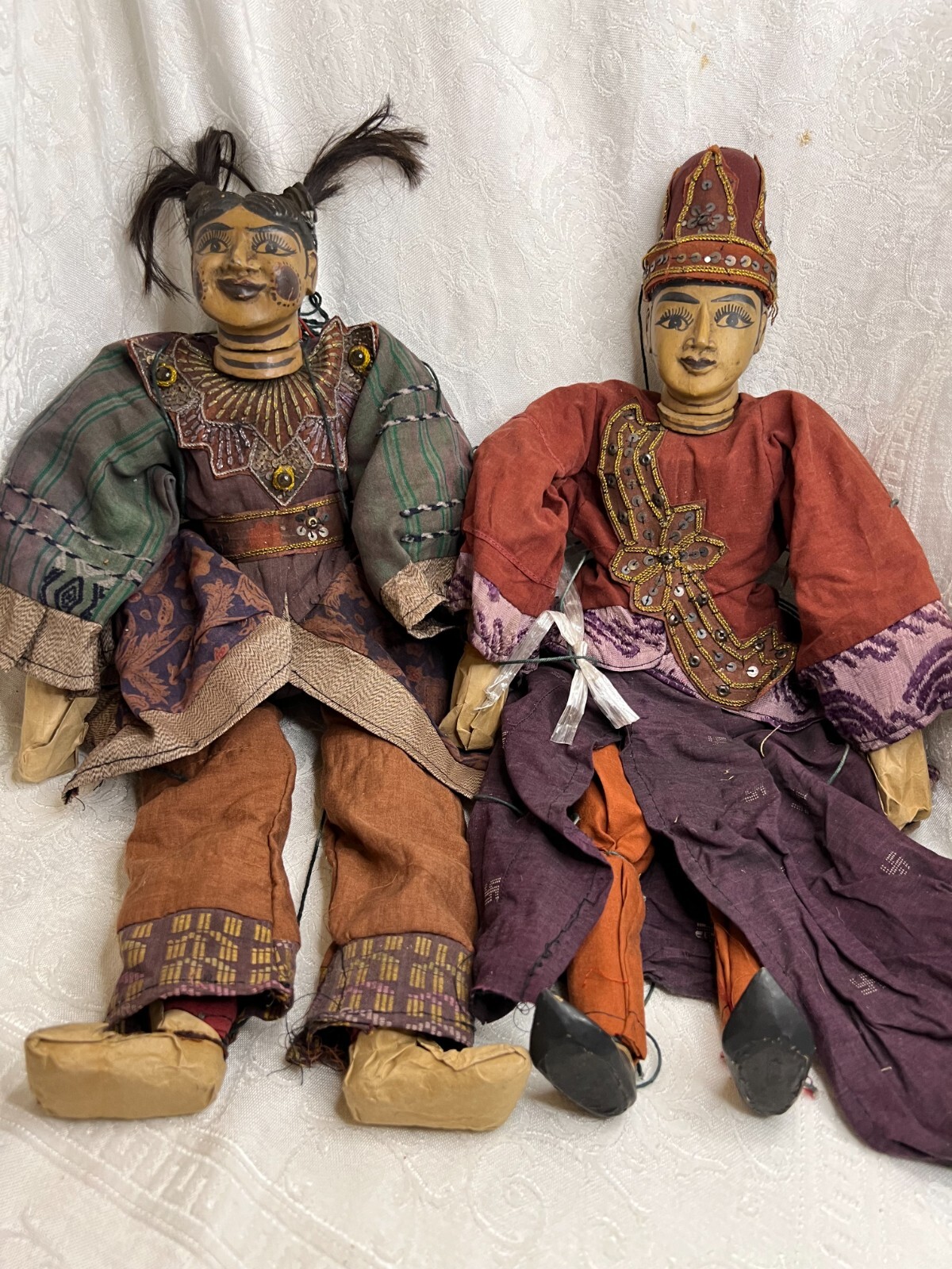 PAIR ANTIQUE VTG CARVED WOODEN BURMESE DRESSED THAI MARIONETTE STRING PUPPETs I don't know a lot about these except to describe them and pass on the research. They are hand carved wood and hand painted. The dress looks traditional and very well done. The hands and feet are still covered with paper, so I am not sure if these were ever used. They may have been stored away for a lot of years. I saw one other puppet like this one that sold, it was described as an antique. They stand about tall 22" tall.