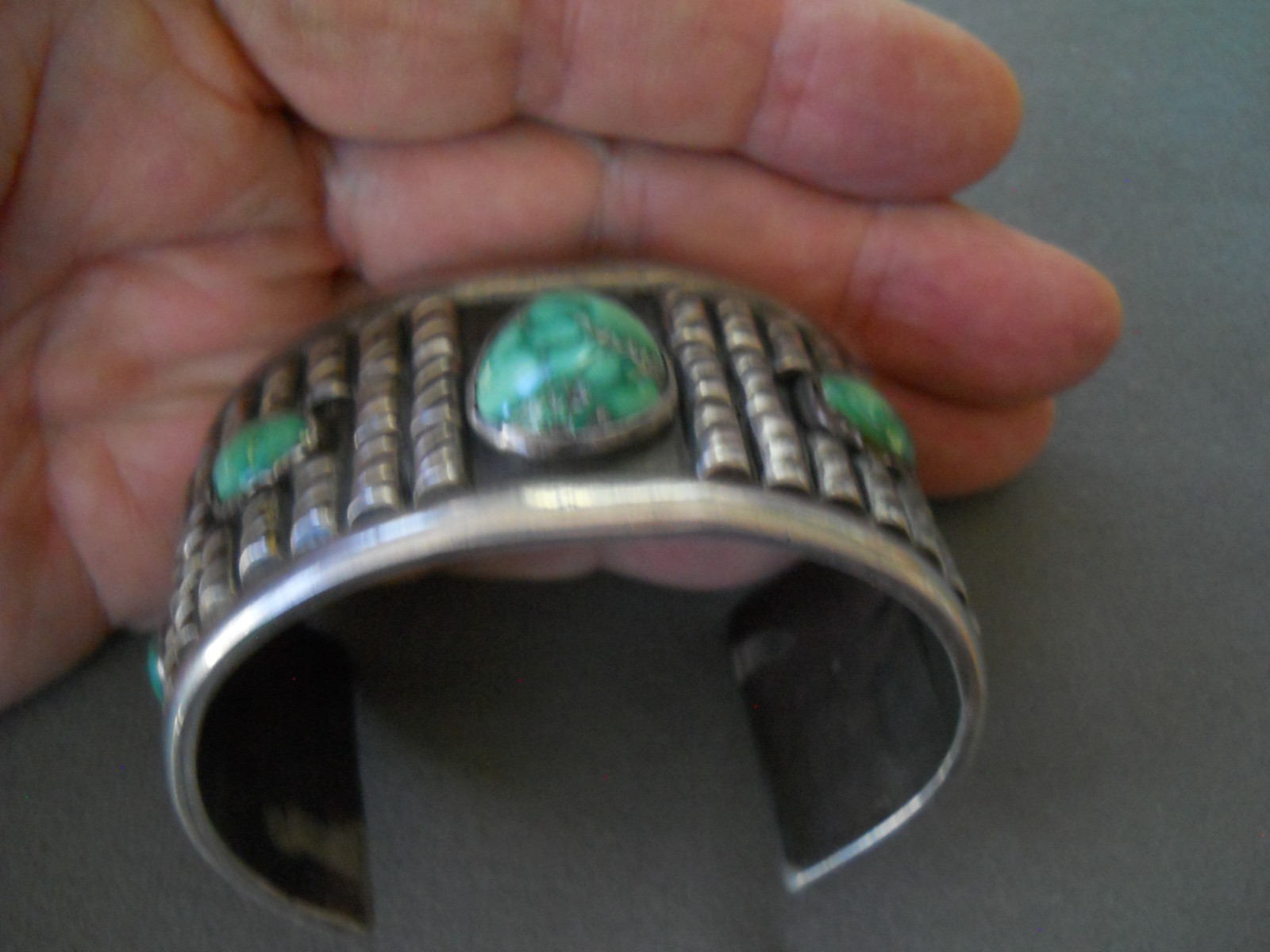 Please Read the Listing Description and Store Policies Thoroughly & See All Pictures for More Details Before Making your PurchaseWe welcome questions, so please don't hesitate to contact us. We may not always be available on weekends and/or holidays, but we will respond to your message, in the order it was received, when we return to the office. Item: HEAVY Native American Navajo Water Web Turquoise Row Sterling Silver Cuff BraceletSku: 12894BR5Artist: Shop/Brand:Markings on the piece: NoneStone(s): 5 beautiful multi-shade green turquoise stones, some with water web, nicely polished, with the largest cab sitting at the center measuring just shy of 1" by 11/16", bezel to bezel (please note that the thickness of the stones affects their bezel to bezel measurements)Weight: 165.2 grams!!Height:Width: 1 1/2"Depth:Length: 5 3/4" measured from end to end from the insideGap: 1 5/8" measured at the center of the opening (the gap is not even due to its width so it can accommodate the thicker section of the wrist by the forearm) Total Circumference: Approximately 7 3/8"Clasp:Ring Size:Belt Size:Additional notes: Older cuff, heavy-gauge, and very well crafted with high grade stones. Please see all pictures for the condition of the stones. Price already reflects this condition. These cracks can be fixed and the stones reset. Worth it!USPS has increased their prices, so we will slowly be updating our shipping cost to $12 for flat rate priority including signature confirmation as well, due to too many pieces being marked as delivered but buyers not receiving it. Any price discrepancy between or pieces are due to this gradual shipping cost update, and the higher cost will eventually apply to all listings.All measurements are approximations. Please, carefully measure your wrist, décolletage, finger, and waist, or use an old bracelet, necklace, bolo tie, belt, and so on, to determine your size. Returns due to