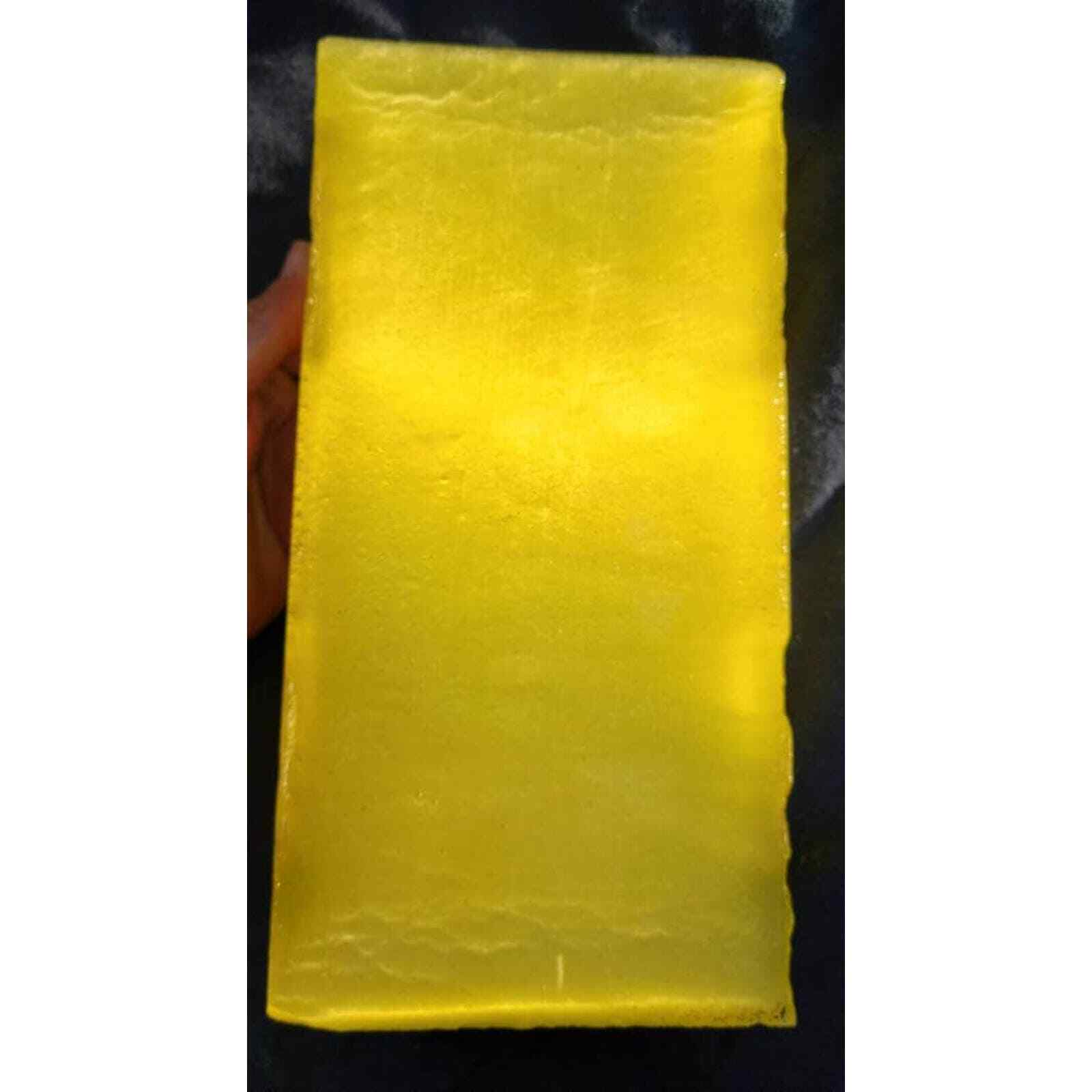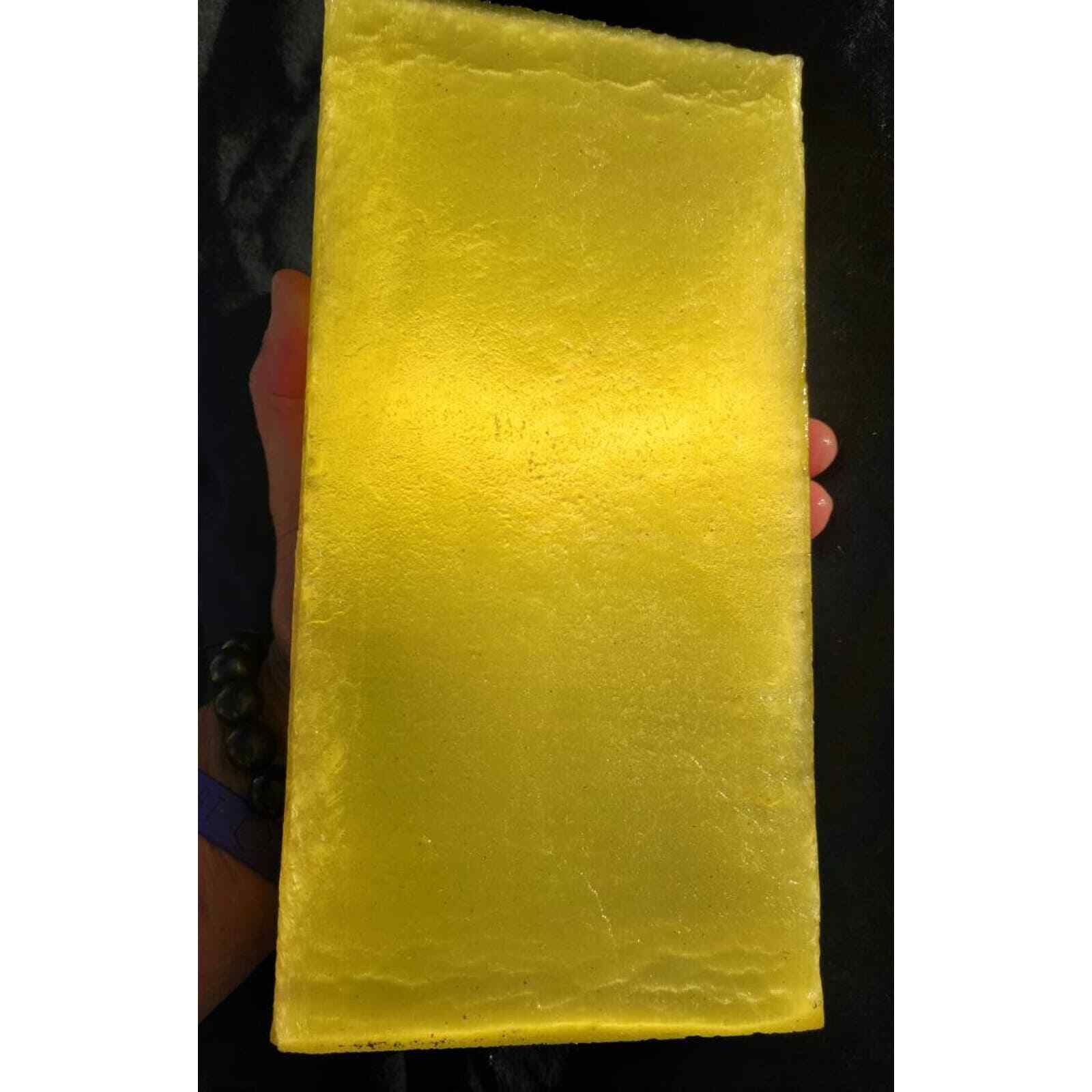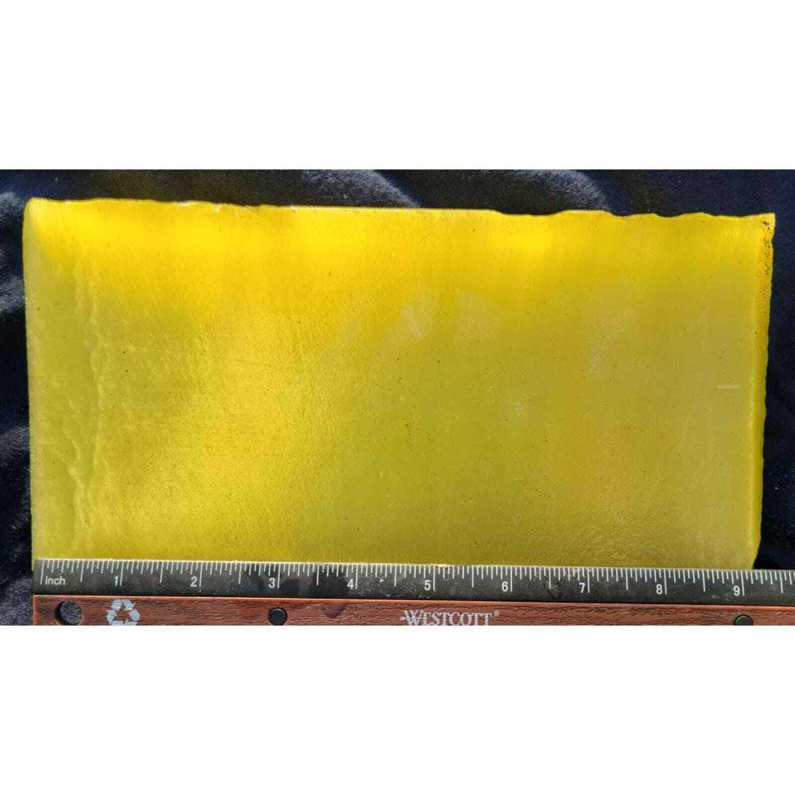 This block of YELLOW Fiber optic glass measures 9 1/2 inches by 4 3/4 inches by 1 1/4 inches and weighs around 5.7 poundsFiber optic glass is a man-made glass composed of millions of glass fibers that have been fused into a block. This creates a reflective characteristic known as cat-eye. This material can be slabbed easily with a diamond blade. It is a great material for making cabochons as well as flint knapping into arrowheads, spears, or other shapes.Photos were taken under sunlight while wetI will combine pieces together to get you the best shipping prices.We have been selling rough rock and slabs in Quartzsite, Arizona for over 11 years. If you are looking for something specific, please contact us and we may be able to find a piece we could list for you.