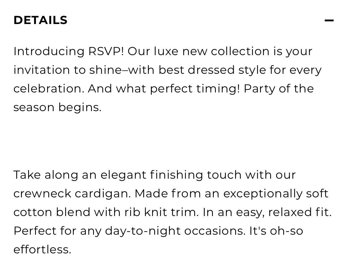 ****PLEASE READ ENTIRE LISTING. ALL OF YOUR QUESTIONS SHOULD BE ANSWERED. THANKS!*******I DID INCLUDE A PIC OF A RED CARDIGAN SO YOU CAN SEE DETAIL BETTER. THE CARDIGAN IS BLACK AS SHOWN IN PICS AND STATED IN DESCRIPTION****ALL SALES ARE FINAL. NO RETURNSPLEASE MAKE SURE OF SIZE AND TRY ON IN STORE IF POSSIBLE. I SELL AT A FRACTION OF THE COST YOU WOULD PAY IN THE STORE PLUS SHIPPING, SO NO RETURNS OR EXCHANGES. IF YOU HAVE ANY DOUBT PLEASE REFRAIN FROM PURCHASING. THANKSSMOKE FREE / PET FREE HOMEBRAND NEW WITH TAGS..............NEW OCCASION BUTTON FRONT CARDIGAN SWEATER. GREAT FOR THE HOLIDAYS! ORIGINAL TAG ATTACHED. ORIGINAL RETAIL $89.50. FROM THE FULL PRICE RETAIL STORE. IN STORES NOW. VERY PRETTY CARDIGAN!SIZE MEDIUM (8-10)BLACKBUTTONS UP THE FRONTLONG SLEEVE ARMPIT TO ARMPIT 19.5" ACROSS. FROM TOP OF NECKLINE TO BOTTOM OF SWEATER, IT MEASURES APPROX. 23" LONG. HEM, 17" ACROSS (IT IS A SLIGHTLY TAPERED HEM). ARMPIT TO END OF SLEEVE, 18" LONG. 66% COTTON, 21% POLYESTER, 11% NYLON, 2% SPANDEXMACHINE WASH COLD GENTLE CYCLE
