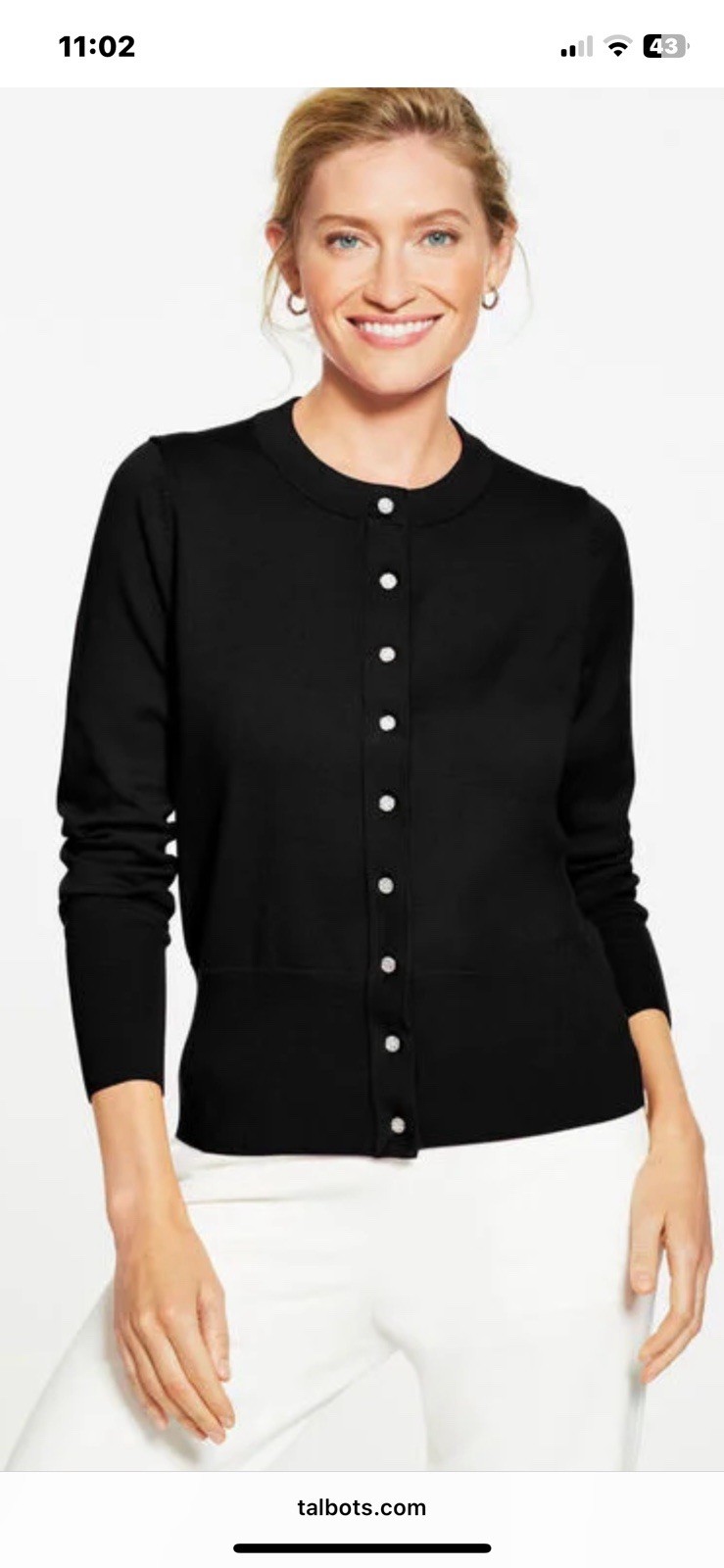 This Talbots Occasion button-front cardigan sweater in black is offered in size Medium. Condition is New with tags, making it a suitable choice if you want an unworn item. It’s listed in Clothing, Shoes & Accessories and ships with free shipping. Check the listing for details on fabric, measurements, care instructions, and any additional features or styling details not provided here.