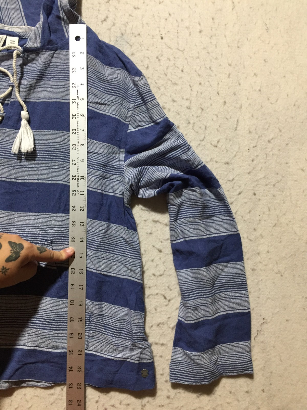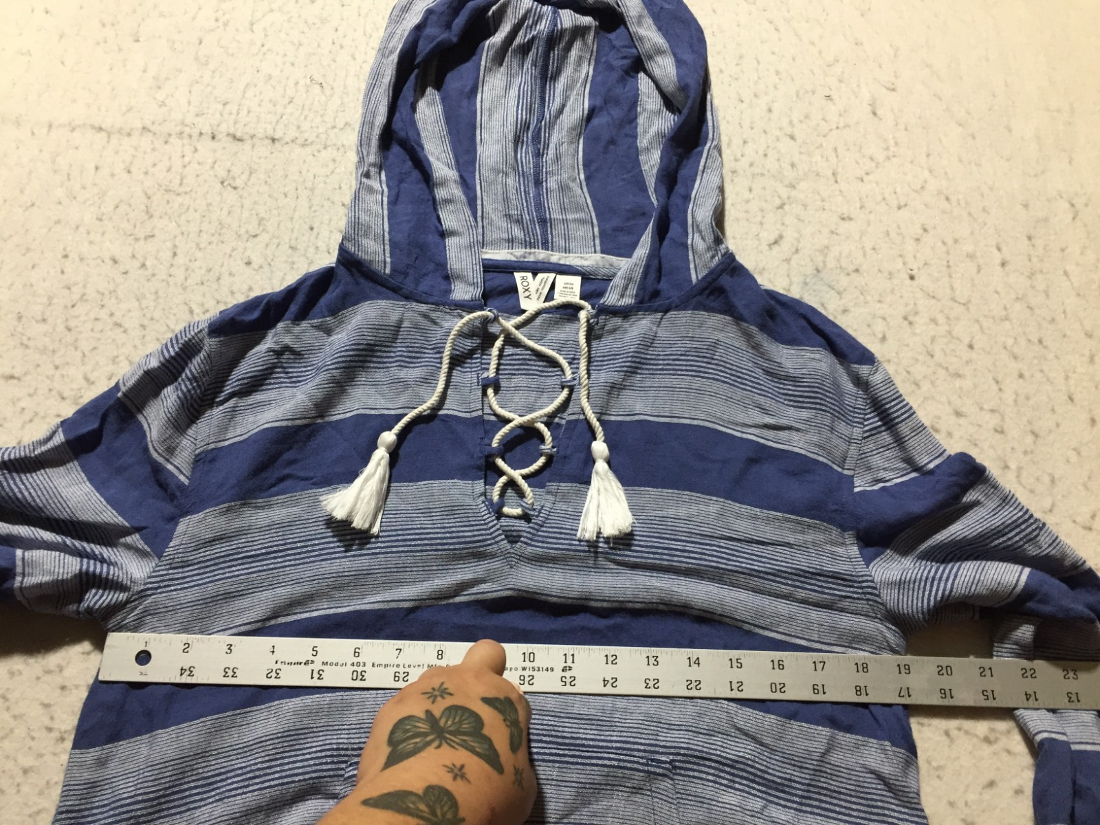 This Roxy women’s hoodie sweatshirt in size Small features a blue and white striped design with front pockets and a lace-up rope V-neck style. It has been taken care of and is in good condition; check the listing photos for exact measurements and additional condition details. This item ships with free shipping, making it a convenient option for everyday casual wear or layering. Check the listing for details.