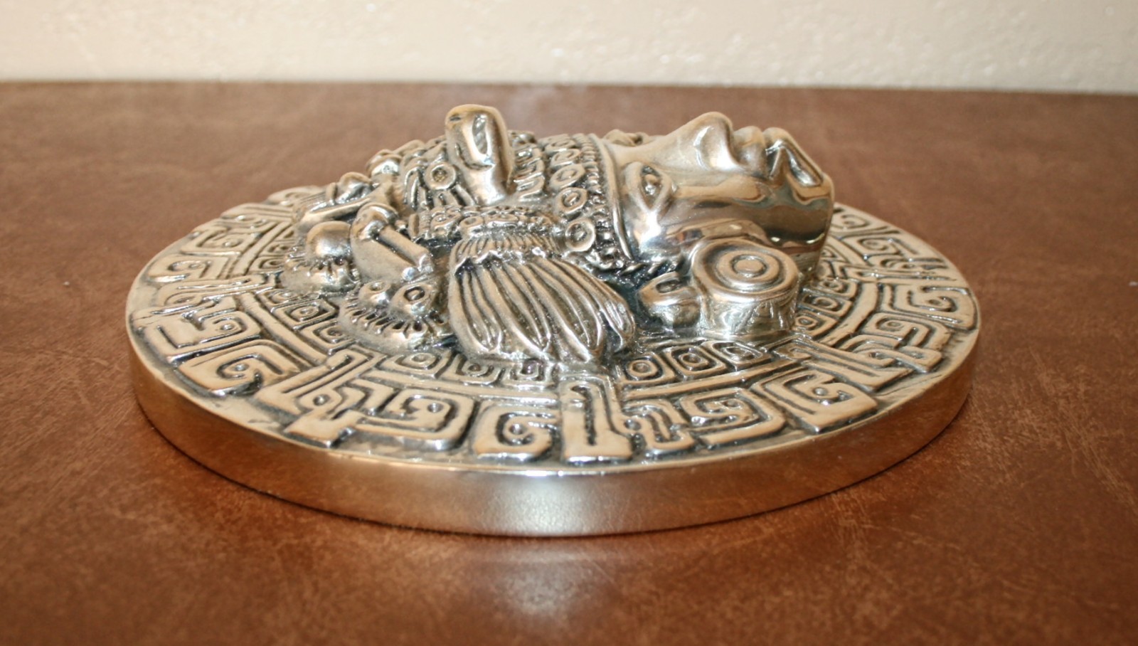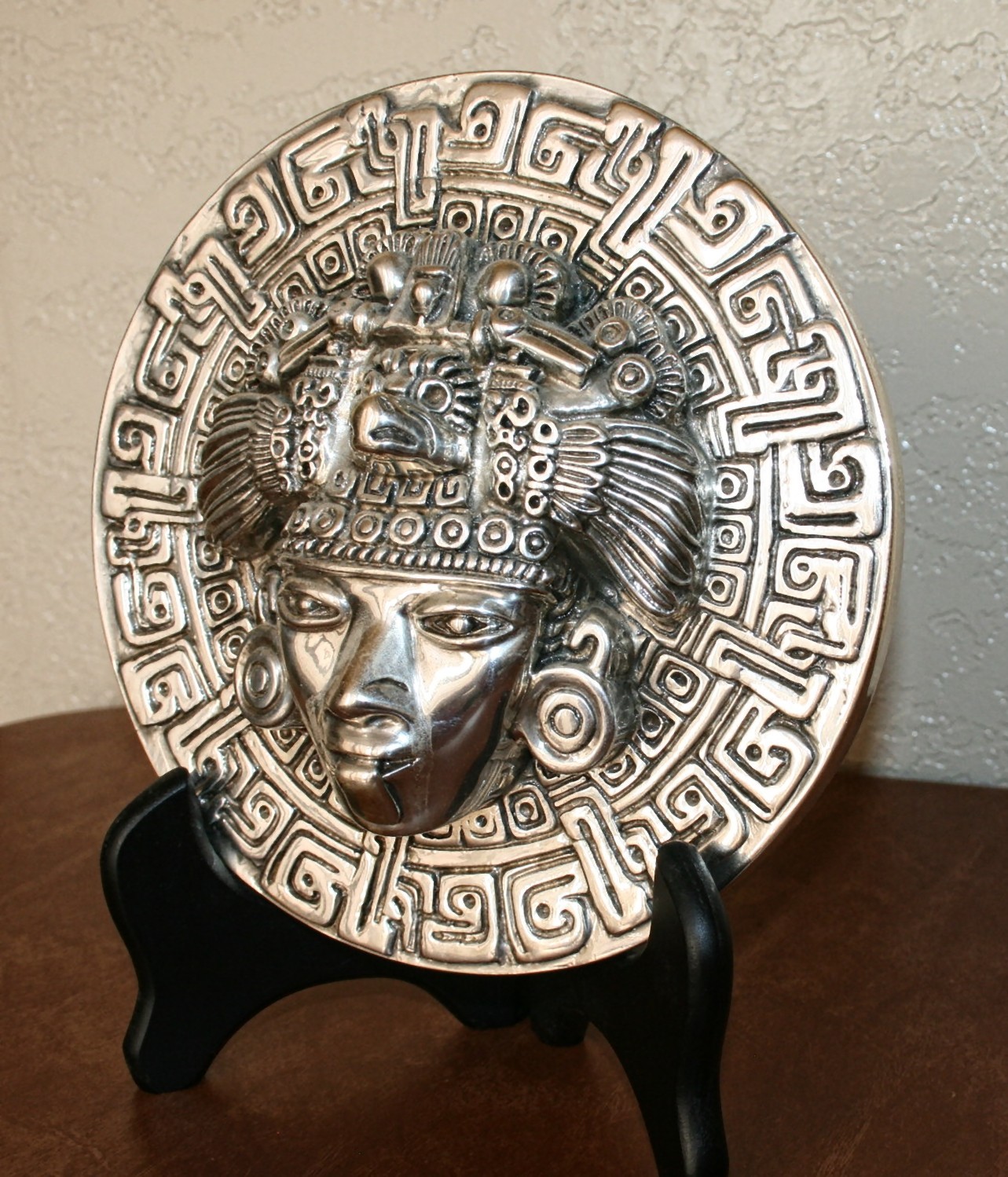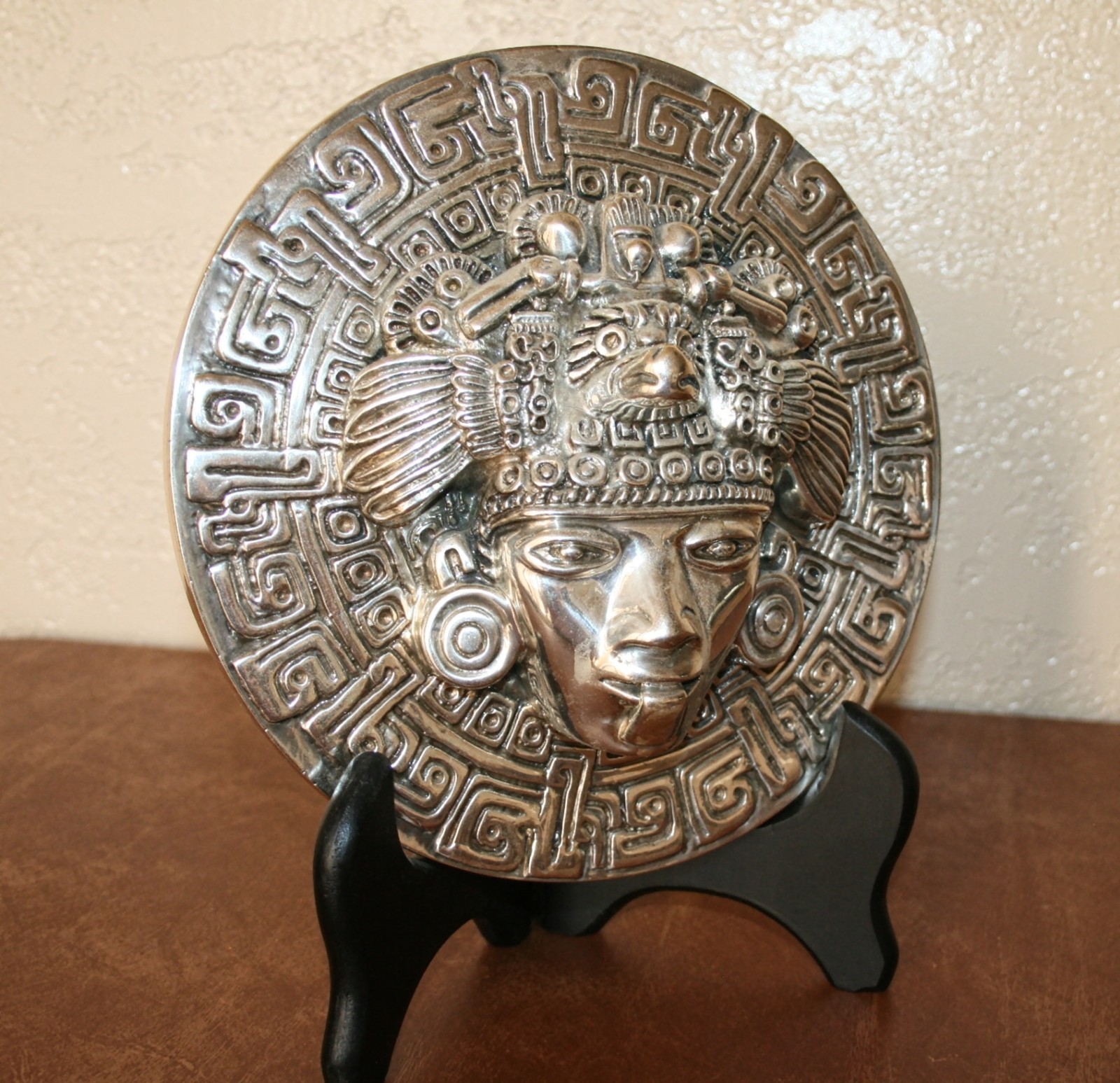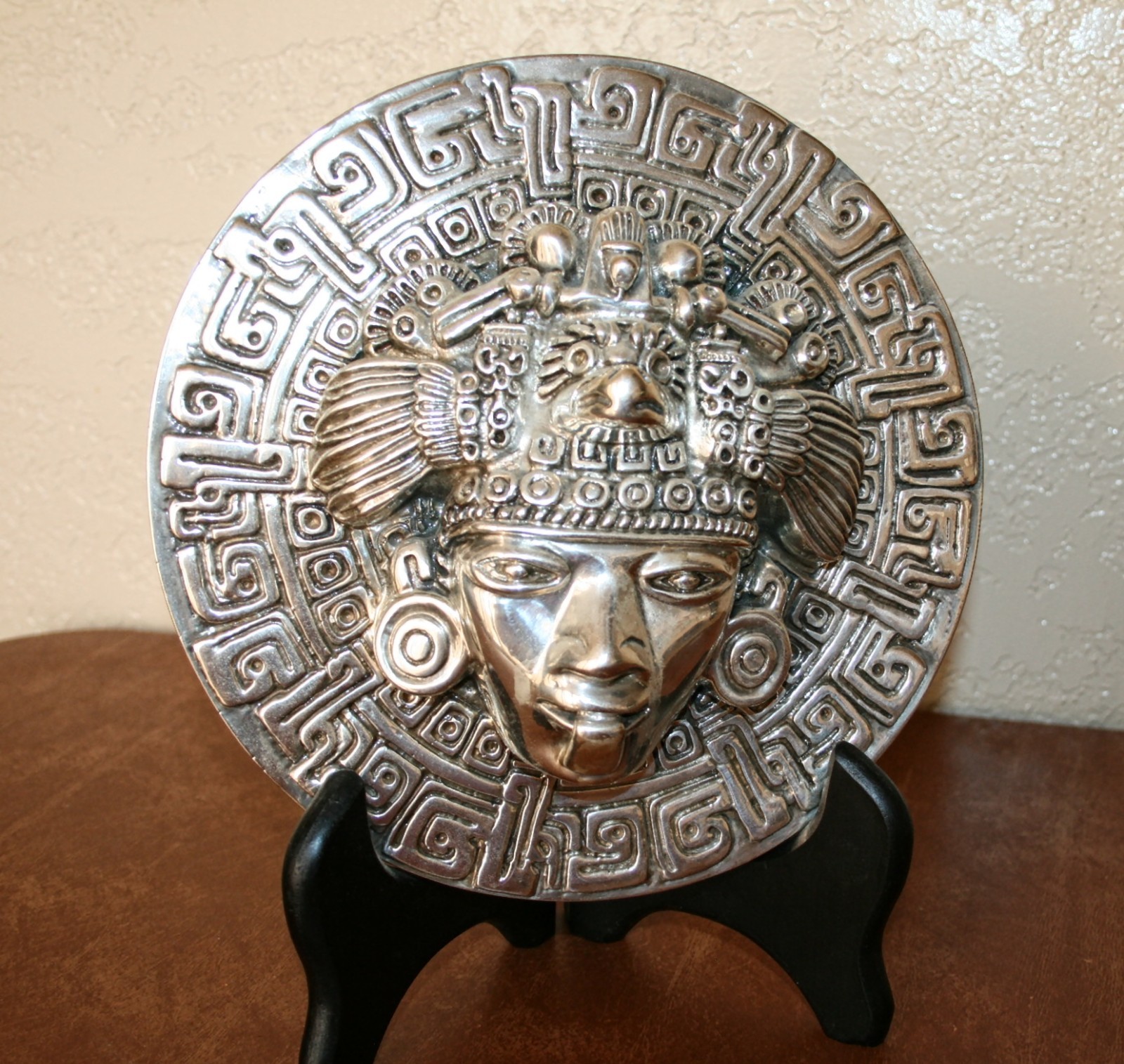D'Argenta # 302 " Smiling Face "D'Argenta Silver Plated Collectables are Highly CollectableI have a Large Collection of these Pieces Mostly in the Aztec / Mayan StyleMeasures Appx 9.06 inch in Diameter & Appx 3 Inches ThickWeight Appx 4 LB 2 OZThe Black Wooded Display Easel Is Included