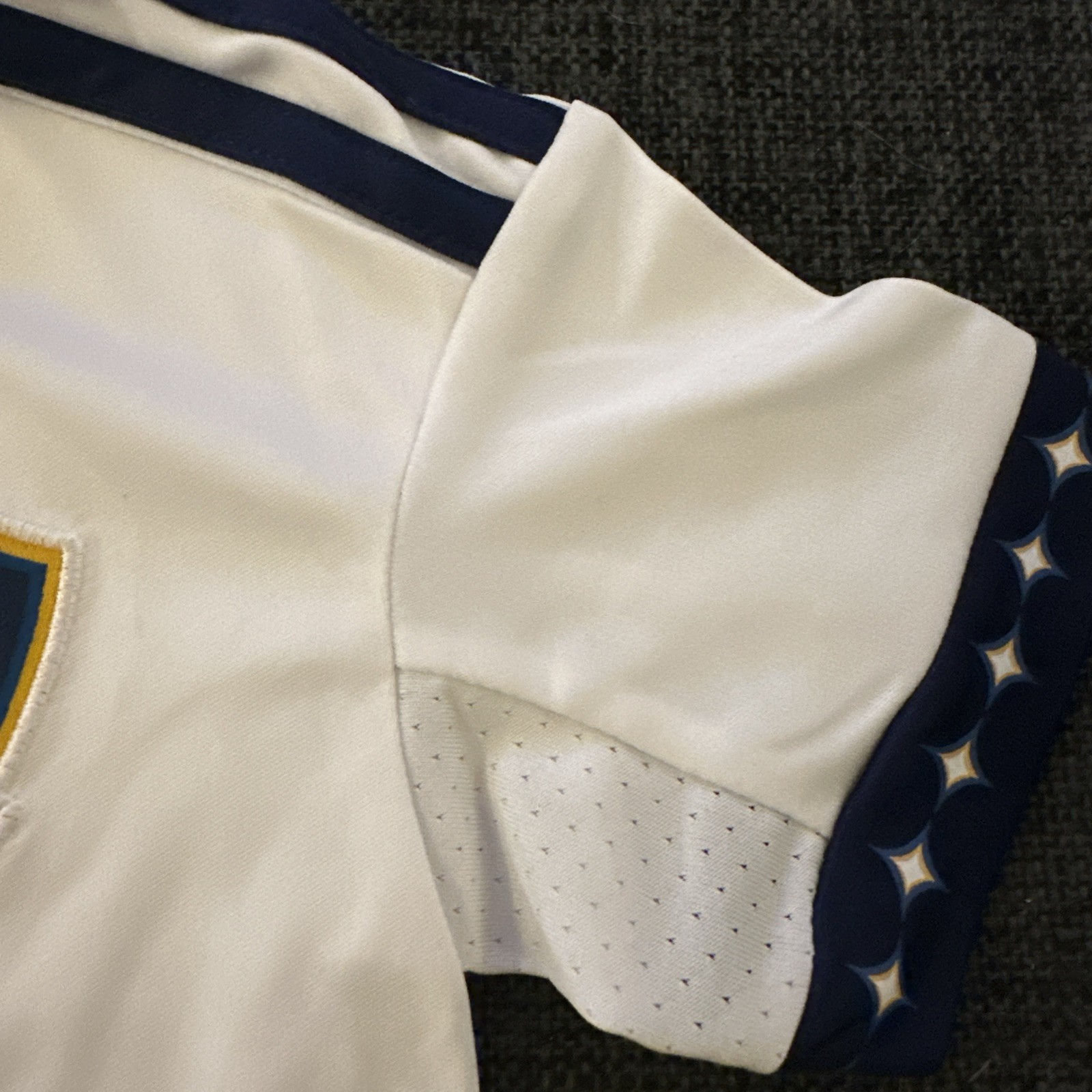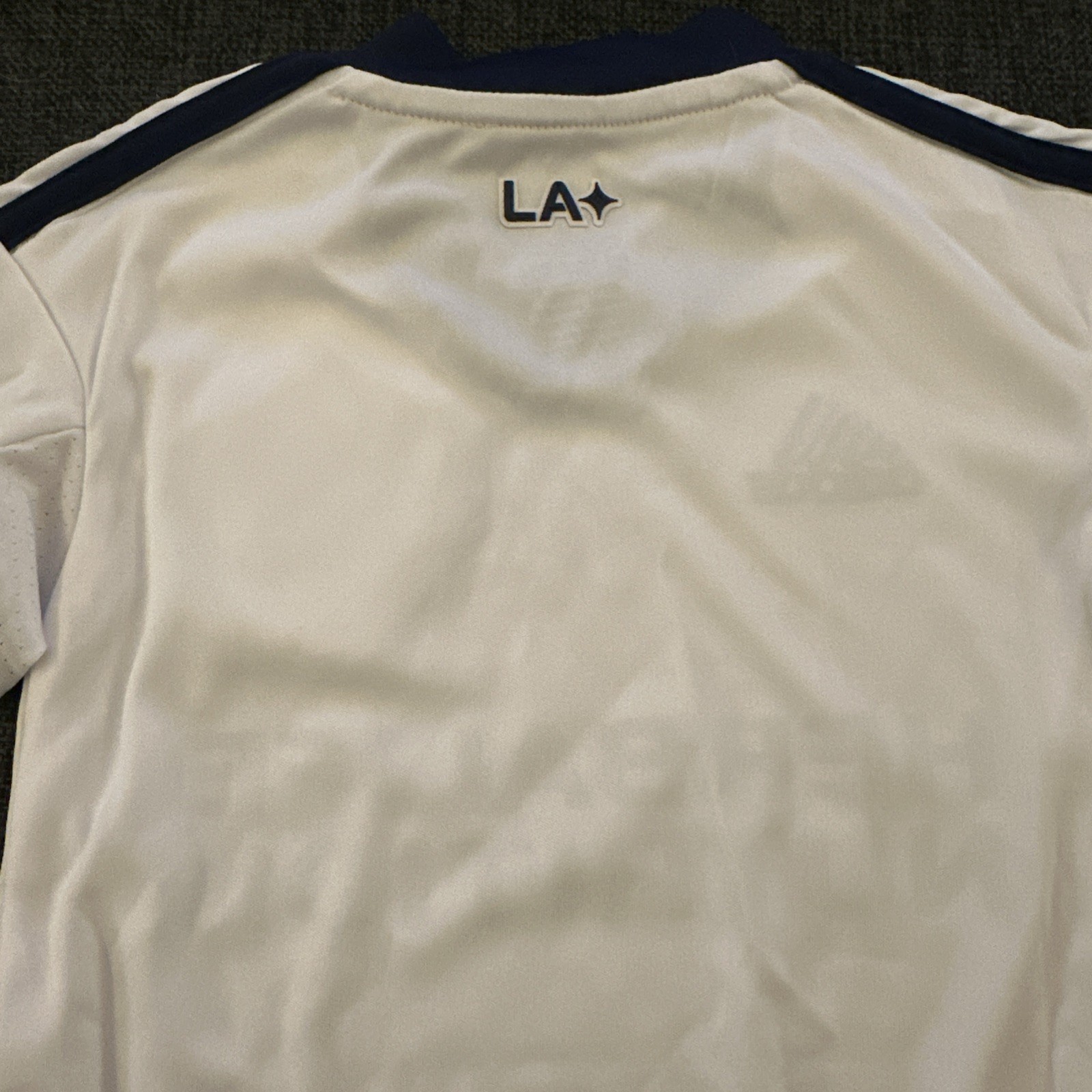 color of white and is designed for both boys and girls. Perfect for young fans looking to show their support for the LA Galaxy while also representing their favorite brand, Adidas. This fan apparel is a must-have for any young soccer enthusiast.