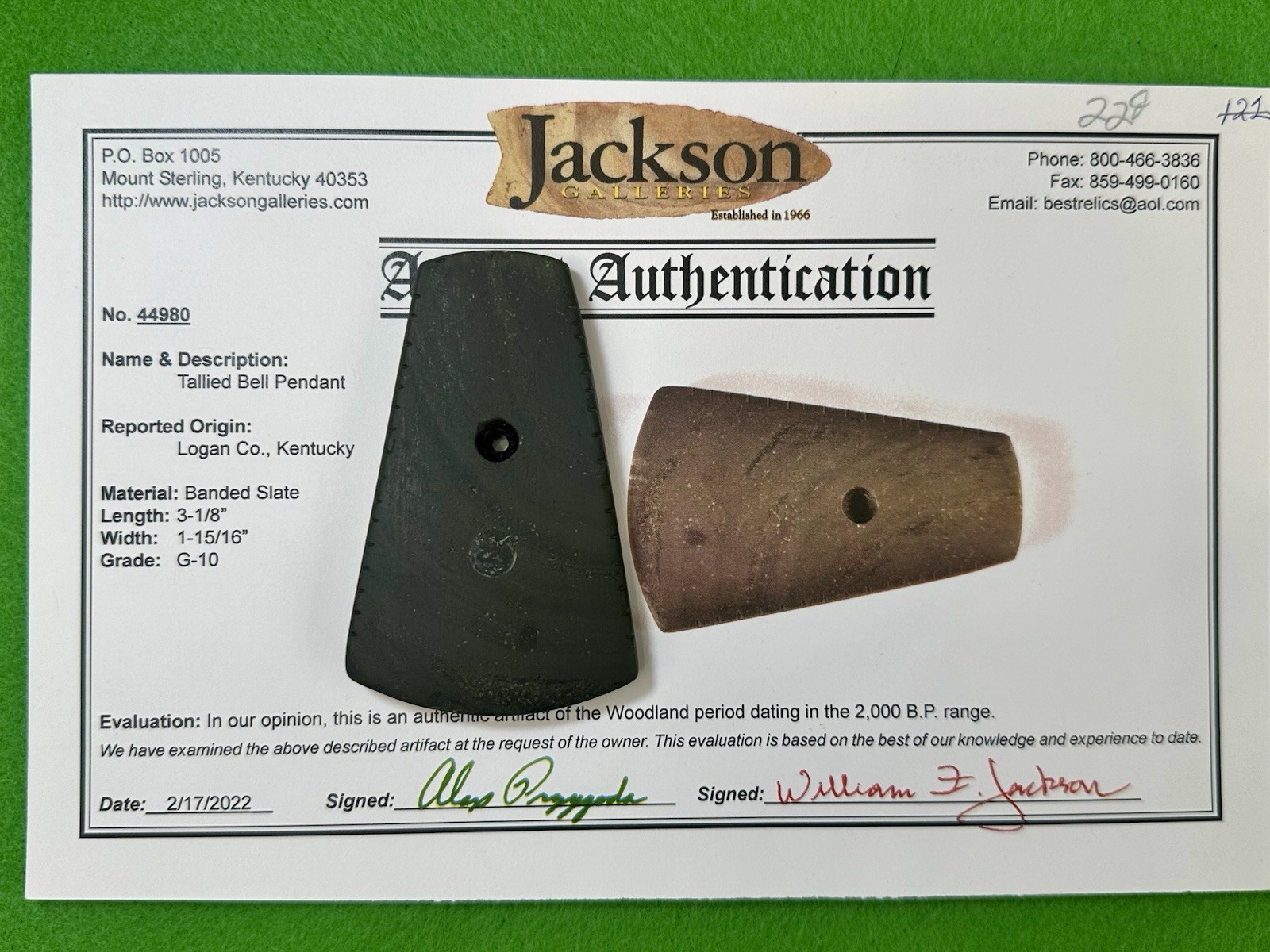 We all hype our pieces but rarity is eye level. This is a Grade 10 Hopewell style bell pendant recovered in Logan County Kentucky. The symmetry in every aspect of the piece is exceptional. The machine like precision of the tally scores is museum quality. The slate is a deeper chocolate rather than the reddish tinged brown that is more commonly seen. Comes with the original Jackson pictured.