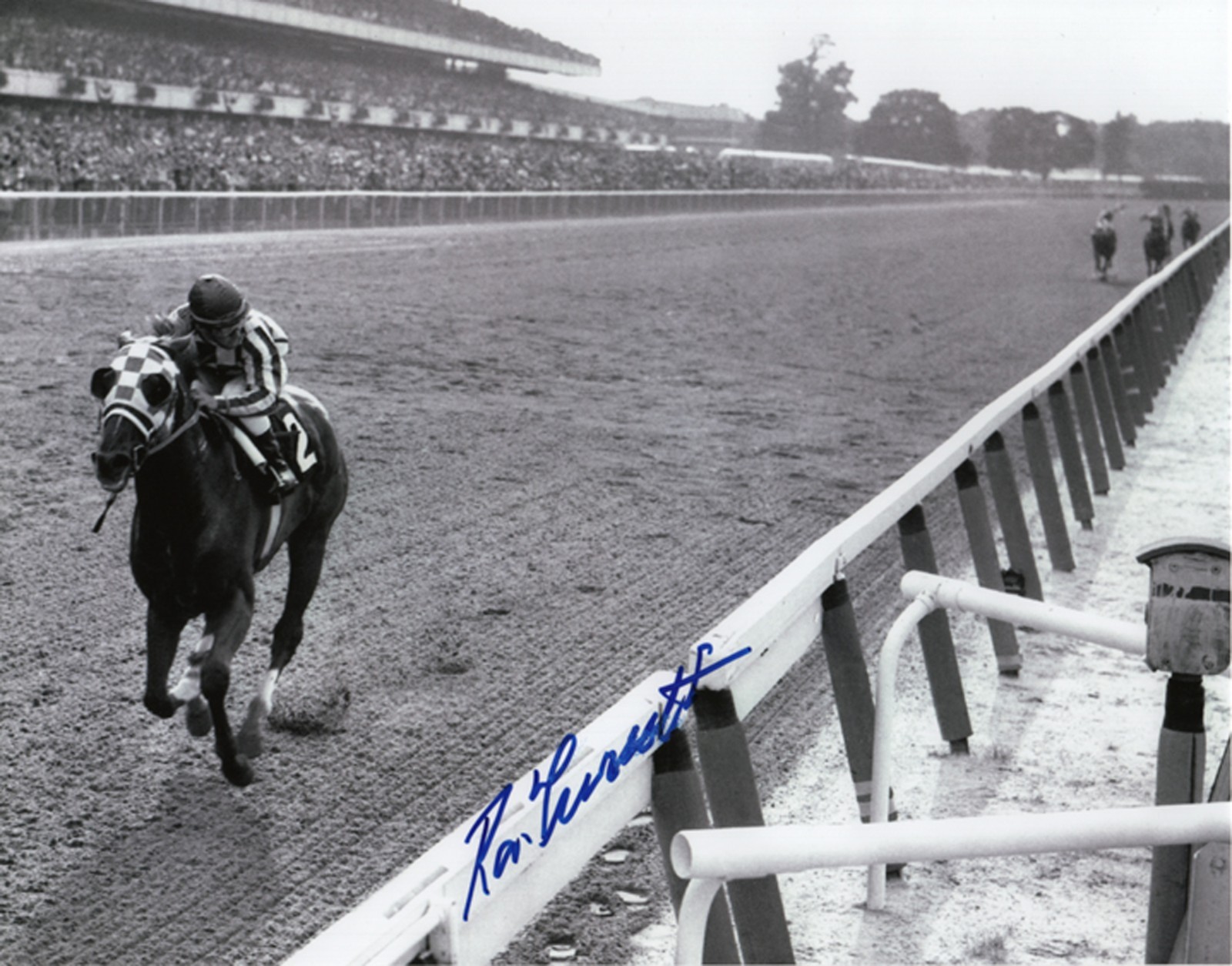 This listing features a Secretariat 1973 Belmont Stakes look back photo signed by jockey Ron Turcotte. It is offered in new condition and is suitable for collectors of horse racing memorabilia and fans of the 1973 Triple Crown season. The item falls under Sports Mem, Cards & Fan Shop. Free shipping is included with purchase, but delivery times and carrier details may vary by location. Check the listing for details on photo size, signature placement, authentication, and any included documentation or packaging.