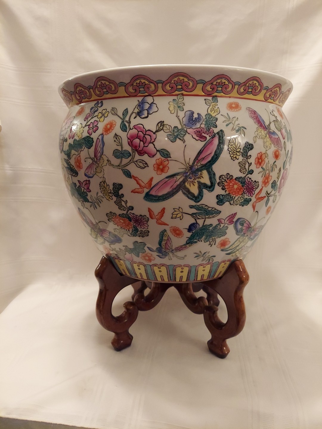 This vintage Chinese porcelain fish bowl planter features a butterfly design and includes a matching stand. It is listed in used condition, so expect signs of prior ownership such as minor wear, marks, or age-related imperfections. This piece may work well as a decorative planter, cachepot, or collectible display item in a traditional or eclectic space. Free shipping is included with the purchase. For measurements, exact pattern details, and any noted flaws or repairs, check the listing for details.