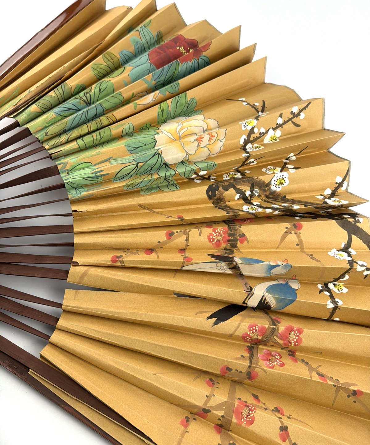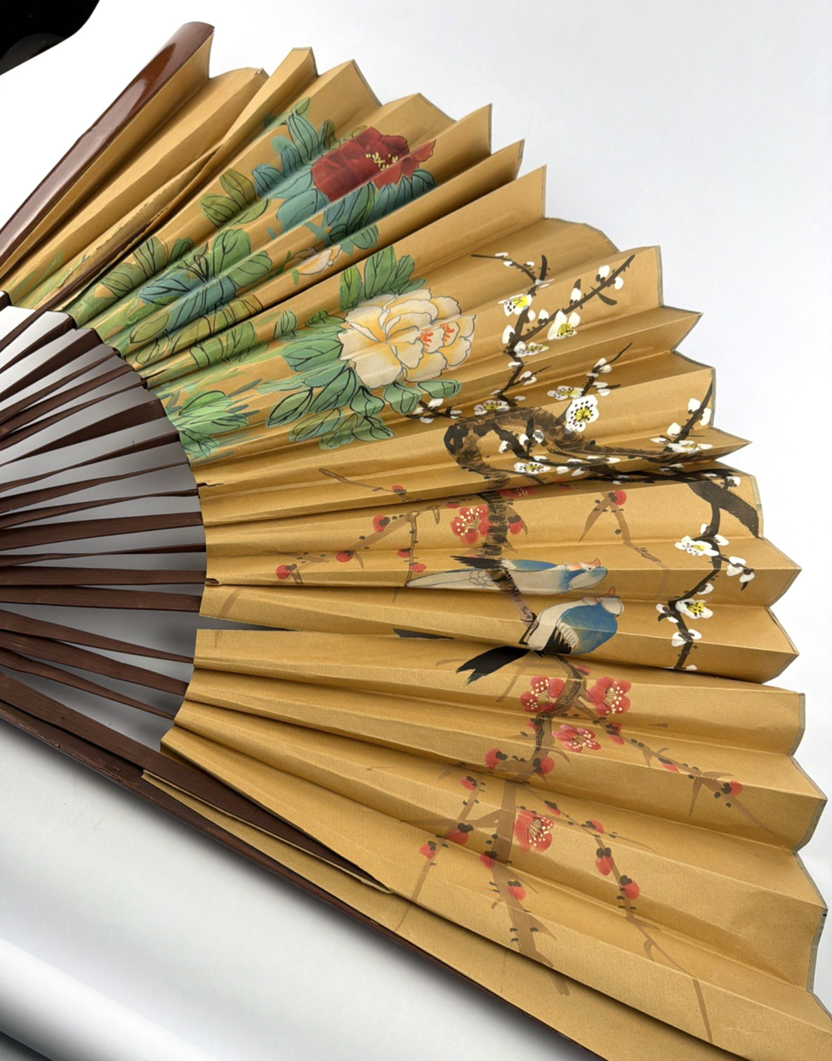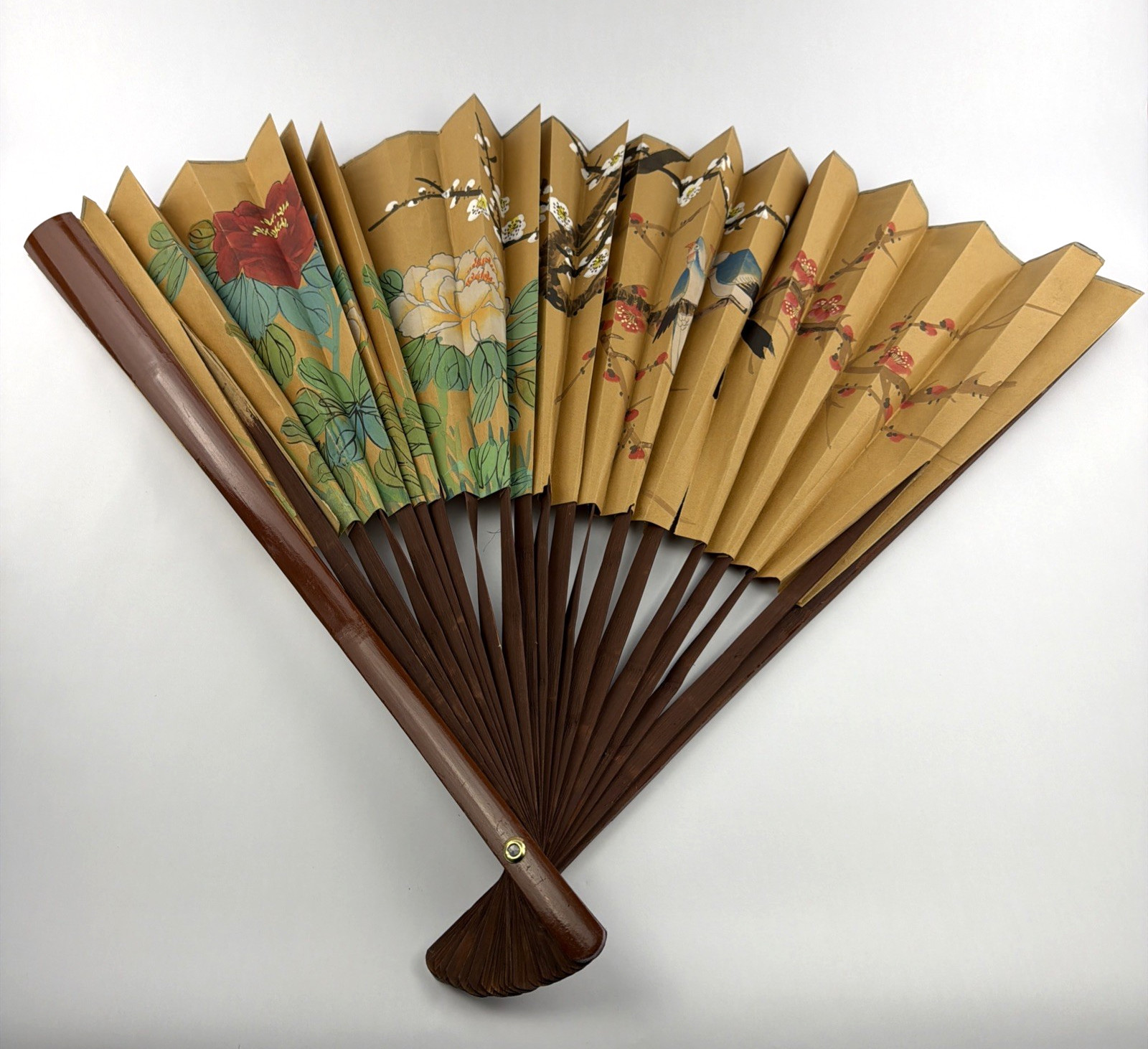 This large vintage oriental folding wall fan features a beautiful bird art painting, making it a unique and decorative piece for any space. With a cultural influence from China, this 32-inch fan showcases traditional Asian design and craftsmanship. Perfect for collectors or those looking to add a touch of Chinese culture to their home decor, this fan is a one-of-a-kind item that will surely be a conversation starter. Returns accepted on unused/unworn items within 30 days of purchase.