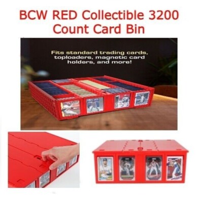 BANKNOTESCOINSCOLLECTORS SUPPLIESEBAY MESSAGEThe home of collectable coins and banknotes and collector supplies. You’ll find everything you need at I.T.Banknotes NEW BCW RED Collectible Card Bin 3200 Count Durable Plastic Holder w/ Partition See our other items 1 RED BCW 3200 CARD BIN The BCW Card Bin is a premium version of the cardboard, 4-Row Monster Box. Instead of corrugated cardboard, Card Bins are made from durable, acid-free plastic. Card Bins have a pair of hinged lids that tuck under the bins when open. When closed, latches keep the lids shut and cards secure. Card Bins are stackable with feet on the bottom that rest in the lid of the bin below it to prevent sliding. The rows in the bins are notched along the top to hold separating partitions. Four Card Bin Partitions come with each Card Bin while extra partitions may be purchased separately. The card bin also comes with a set of BCW toploaders that fit into special, exterior slots to help mark the contents of each row. Holds 3200 loose trading cardsRows are wide enough to hold toploaders, magnetics, and deck boxesStackableIncludes 4 Card Bin PartitionsRich, vibrant red colorHinged lid features secure, sliding locks Approximate capacity: ItemRow CapacityBin CapacityLoose Sports Cards8003200Loose CCG Cards11004400Sleeved CCG Cards6002400Toploaders (20pt)220880Magnetic (35pt)48192 Interior Row Dimensions (WxHxL): 3 1/8 x 4 1/4 x 14 3/8 Exterior Dimensions (WxHxL): 15 x 4 3/4 x 15 For More BCW Products, Click HERE.