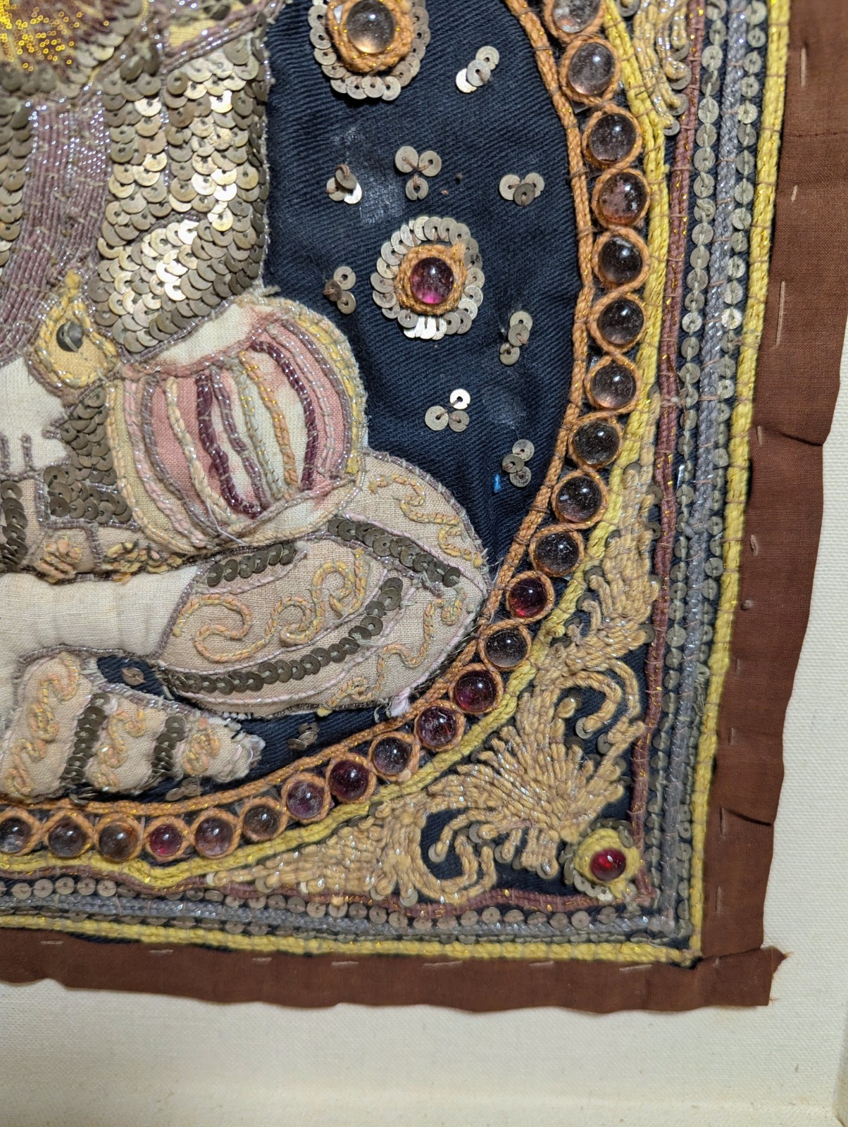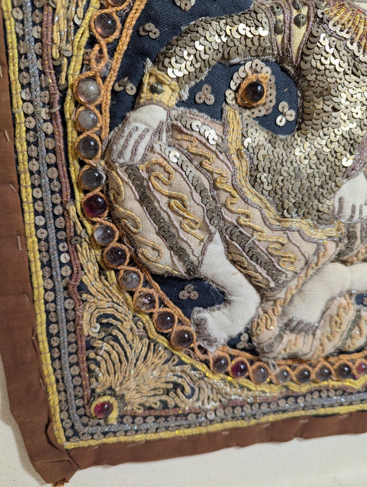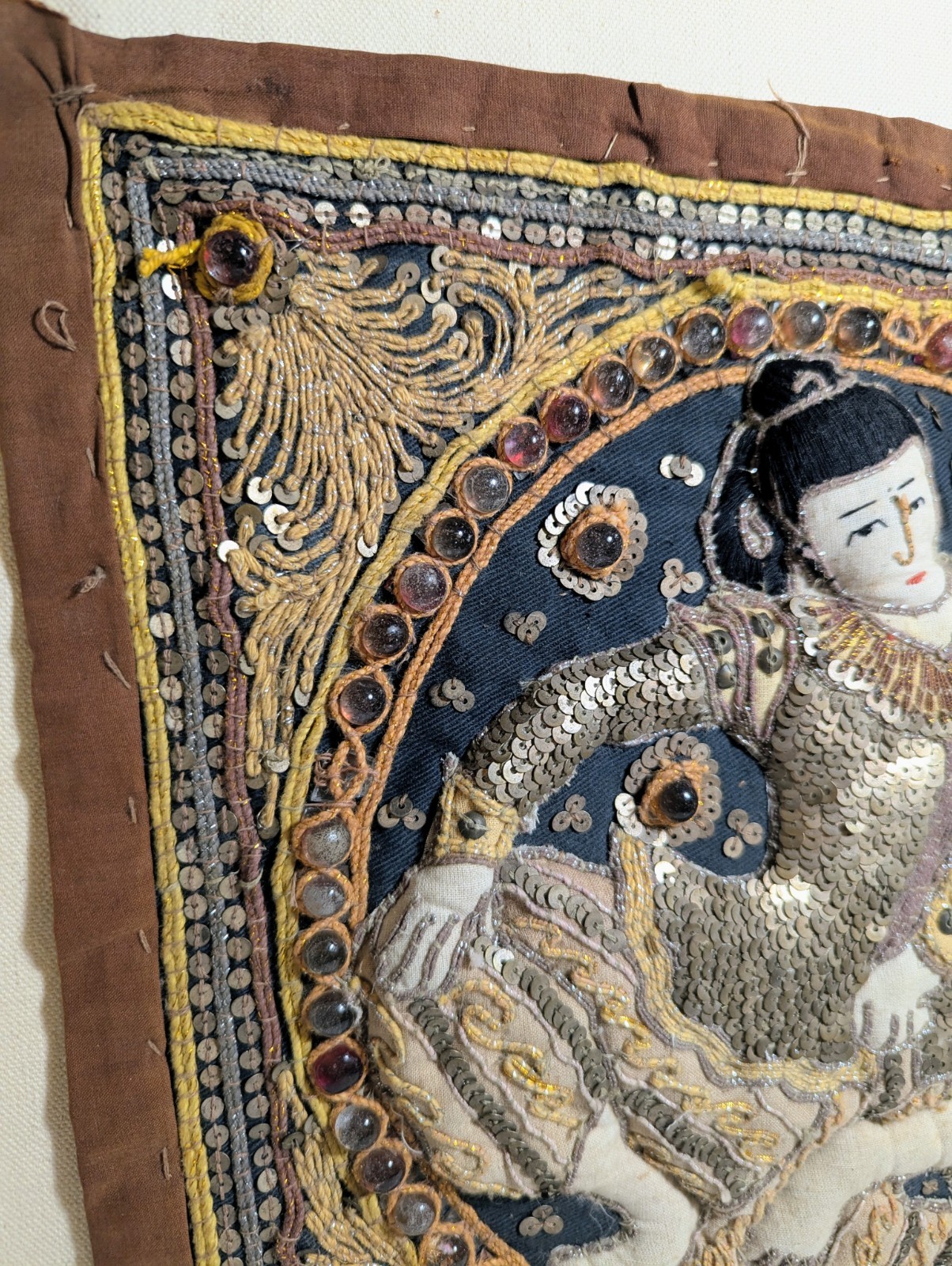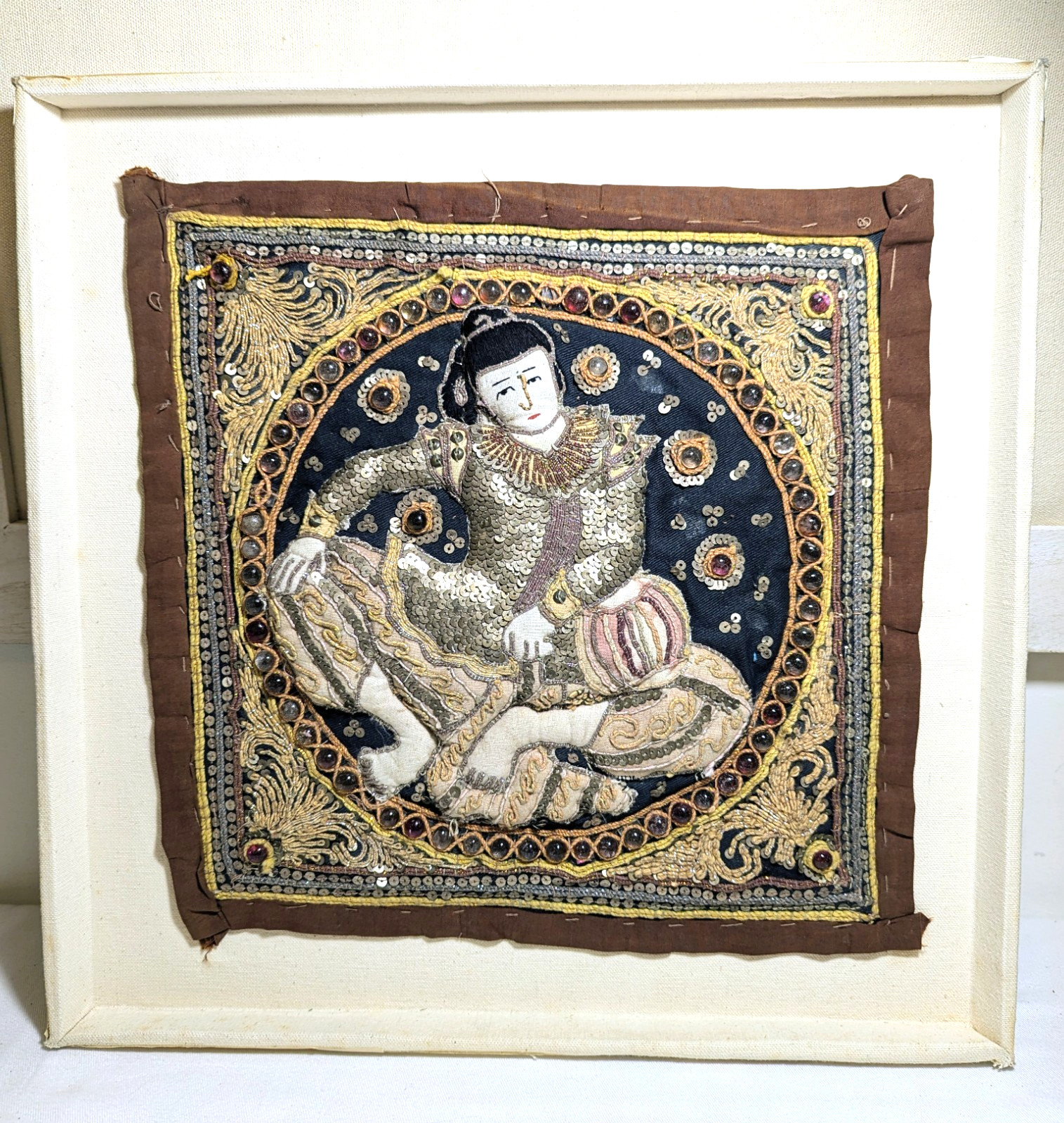 This vintage Kalaga Burmese tapestry features an embroidered soldier man motif with sequin accents. It measures approximately 13" x 13" and is listed in used condition. Check the listing for details on materials, backing, and any signs of wear. This collectible textile piece can be suitable for wall display, framing, or adding to a Southeast Asian folk art collection. Free shipping is included, and it will be packed for safe delivery to help protect the embroidery and sequins during transit.