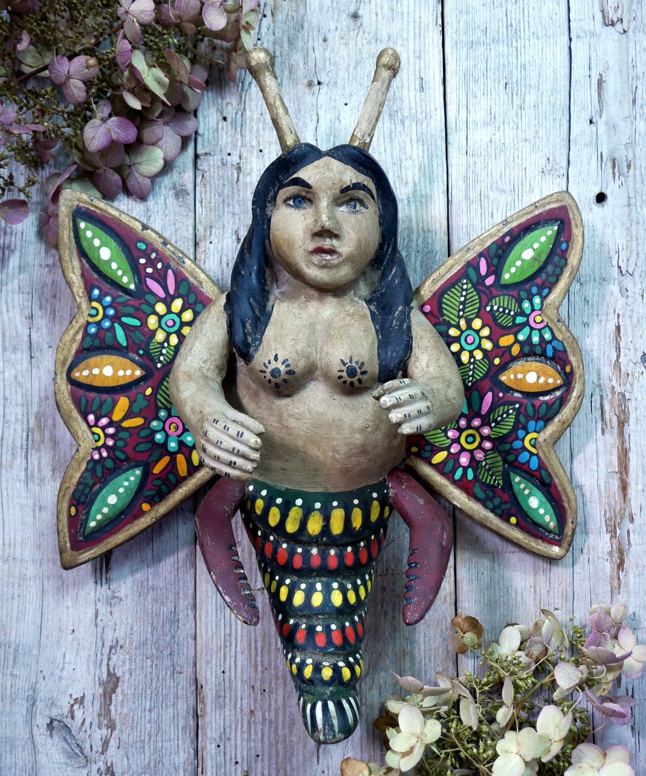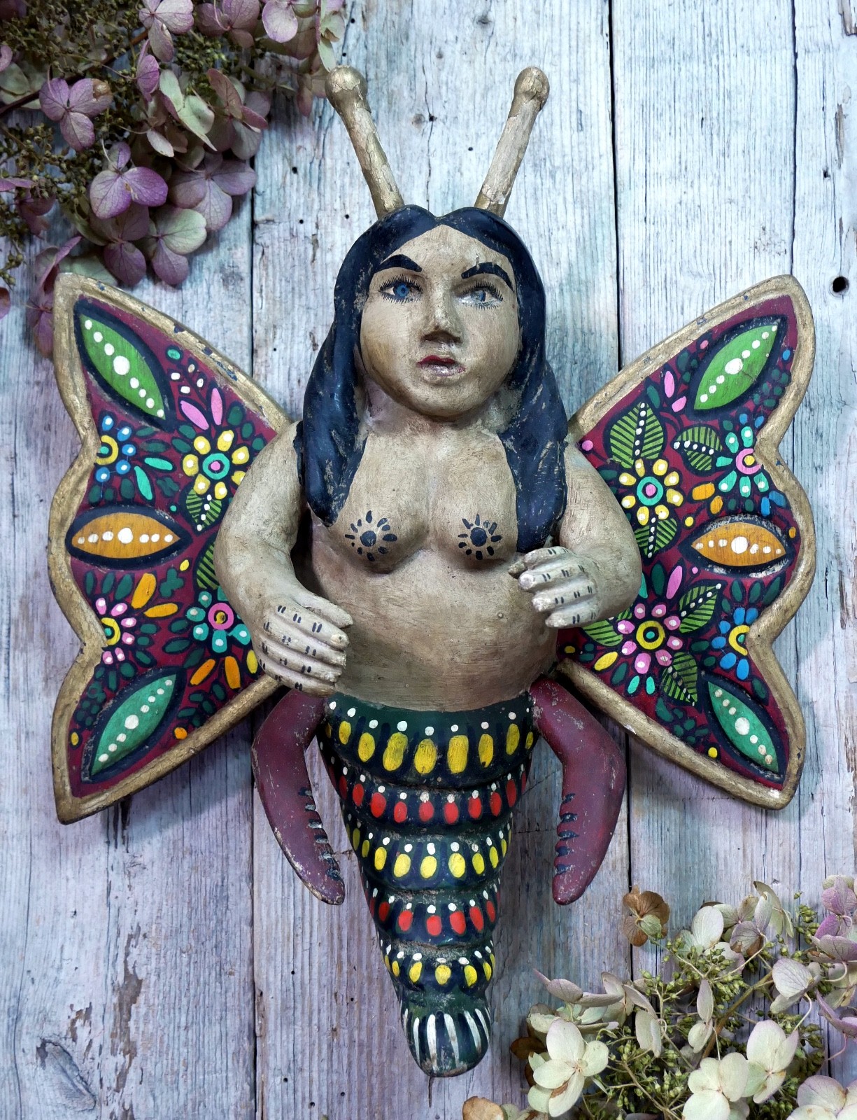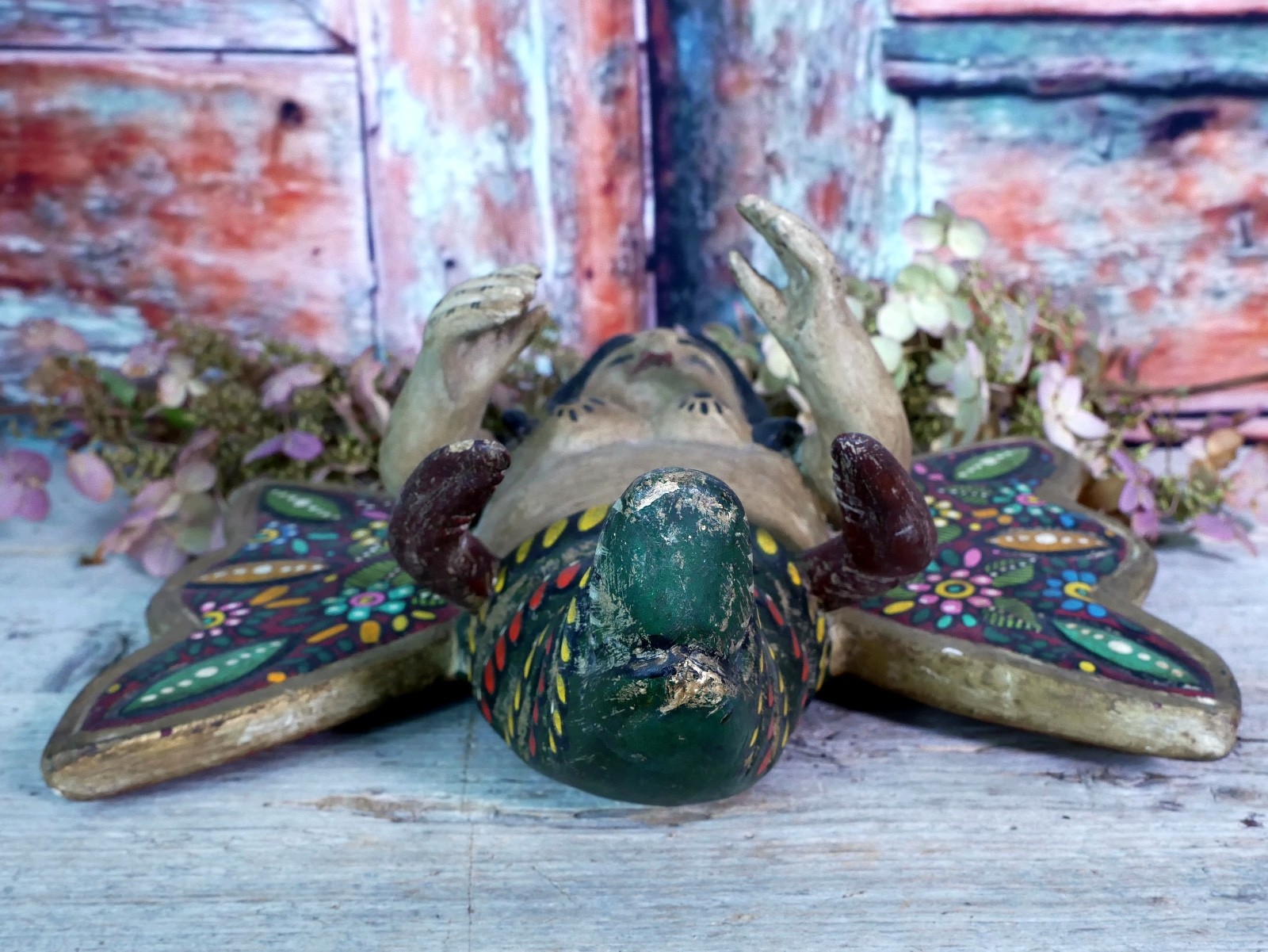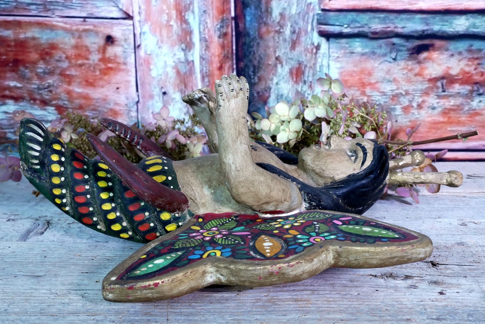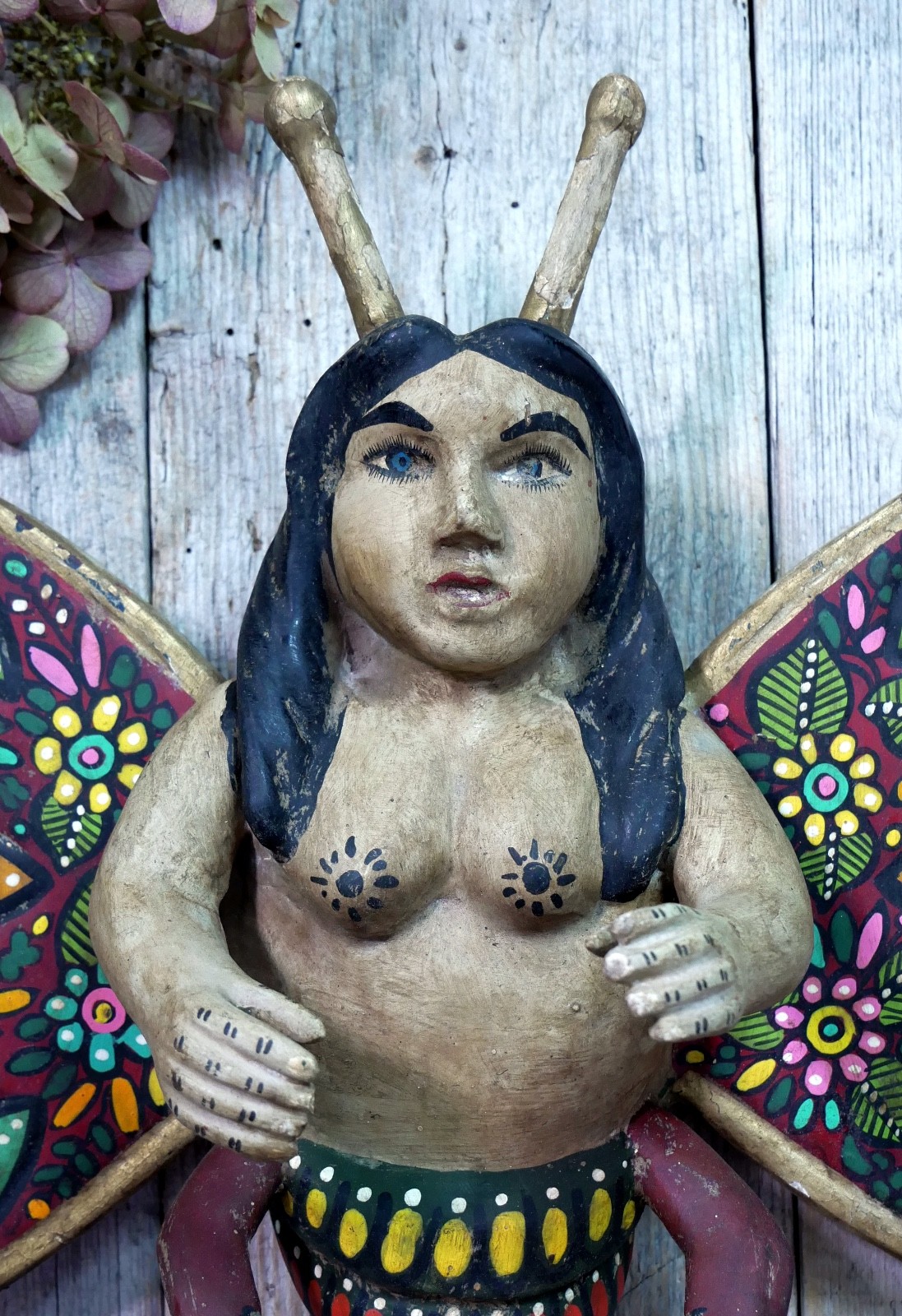 I just received a large shipment from Guerrero with lots of Masks and other wood carvings... This Fairy Butterfly Person has been entirely hand carved and hand painted in Guerrero Mexico. It has been "distressed" to make it look old, but is a newly made piece! It would make a great gift a nice focal piece for your own Mexican Folk Art Collection... I will be adding more pieces from Guerrero in the next few days... Check my Ebay store for a larger selection of Masks...It measures; 15 inches tall by 11 1/2 inches wide and 5 1/2 inches deep.I do combine shipping... To Combined Shipping for multiple purchases: Please request an invoice by using the Cart feature (under the Buy-It-Now button). Add items until you are done shopping, then hit the "Request total from seller" button. When i receive your request i will issue an updated invoice with the shipping costs adjusted... If this does not work then purchase what you want and I'll refund the excess shipping...Please check out my Ebay Store for more Mexican Flower Pots, Hand Made Clothing, Folk Art and Jewelry. VIVA MEXICO!!